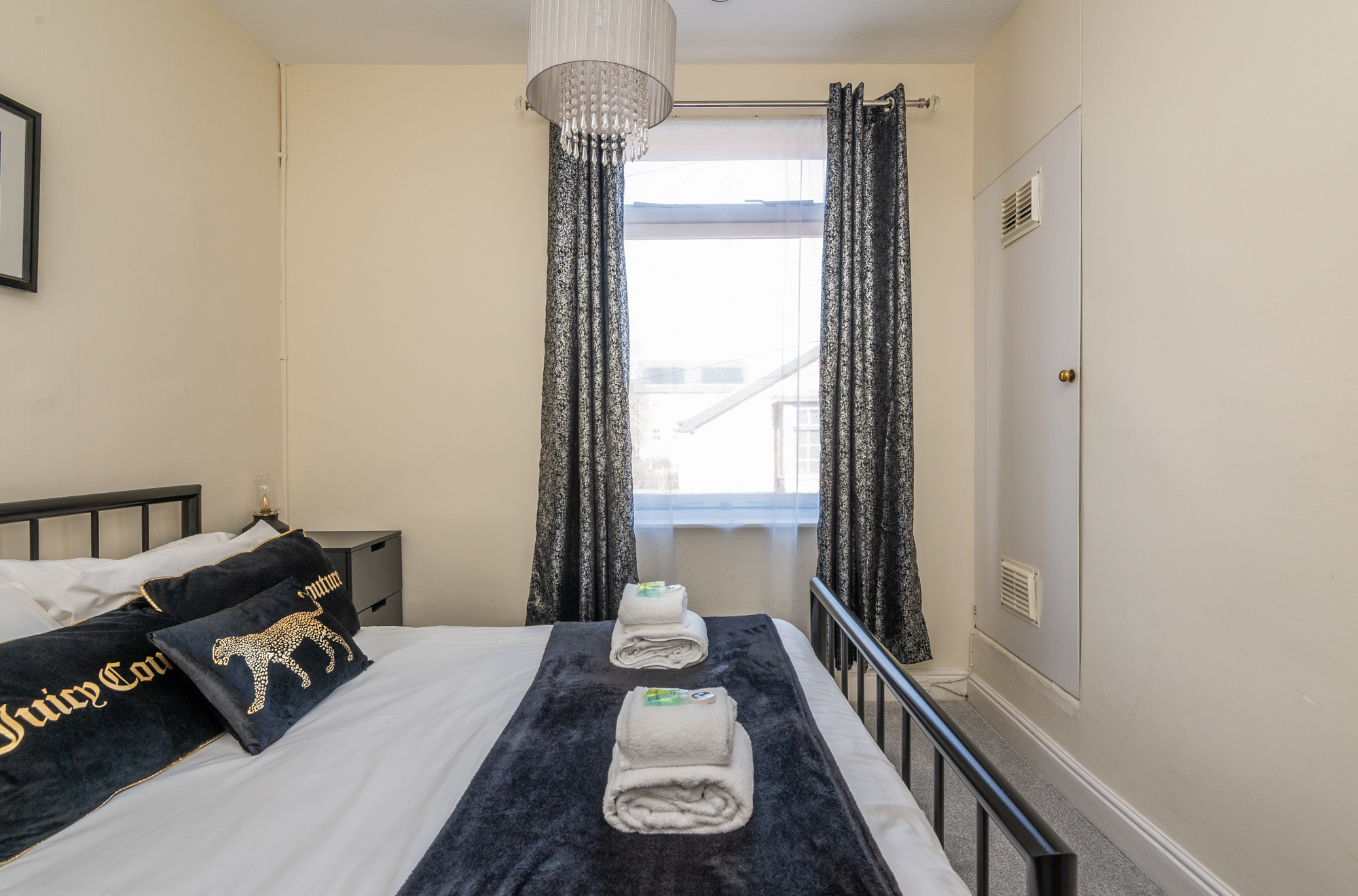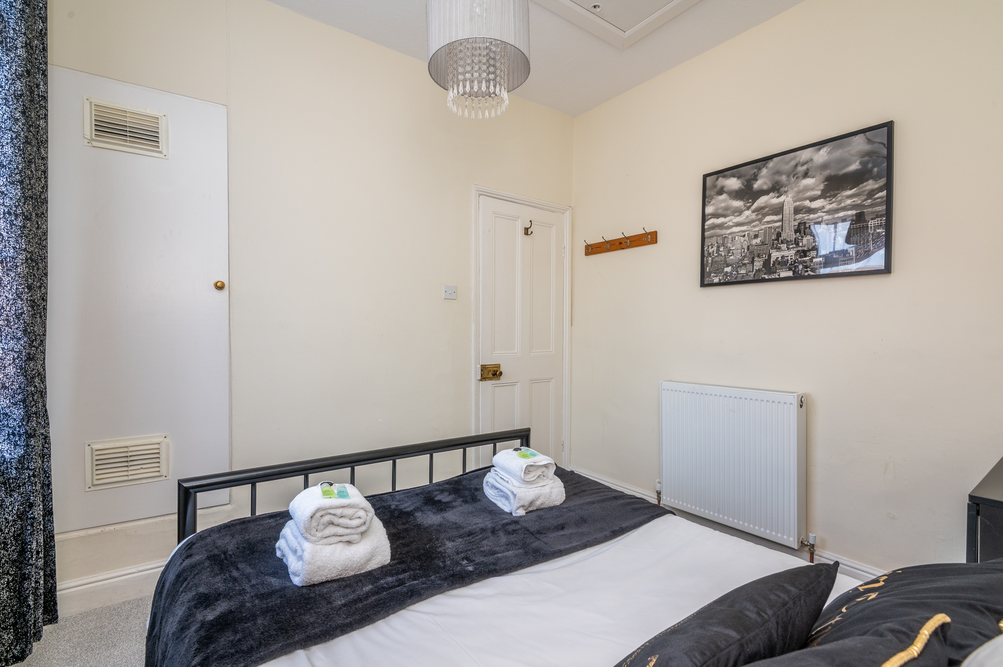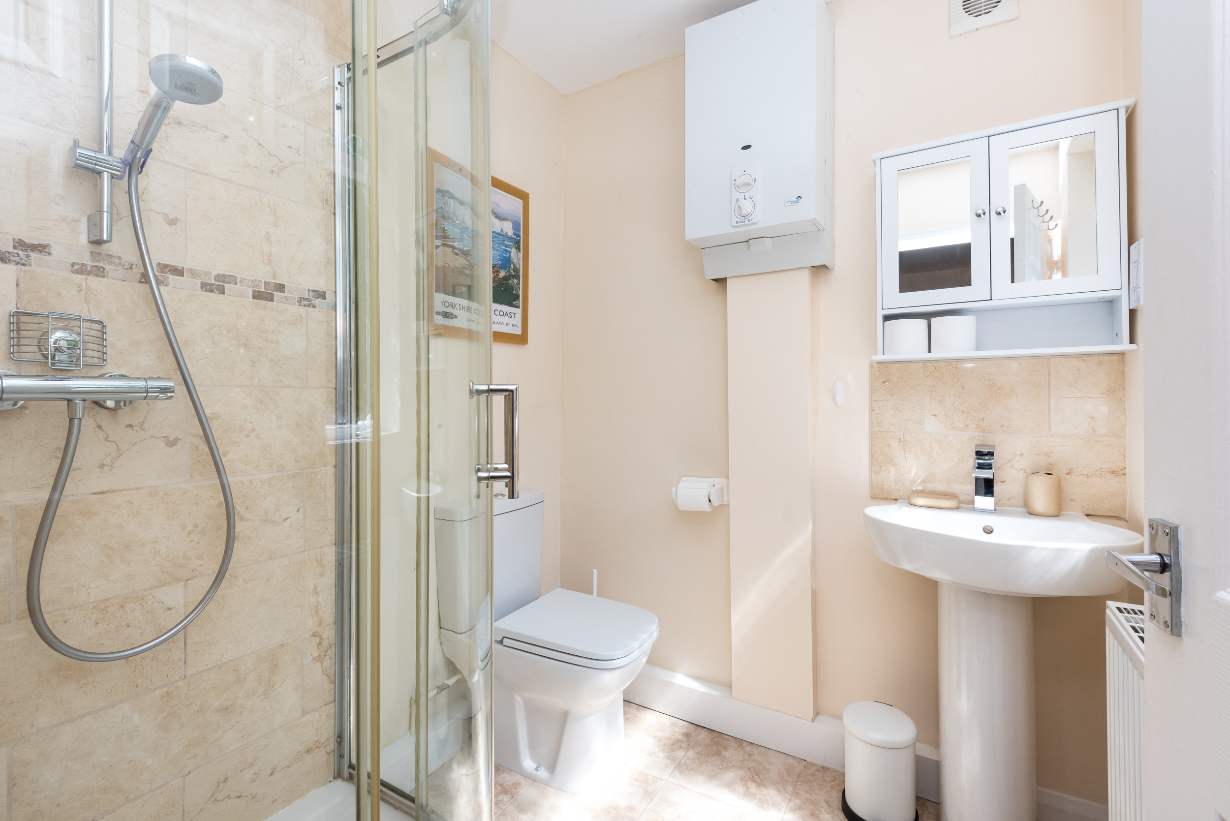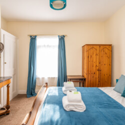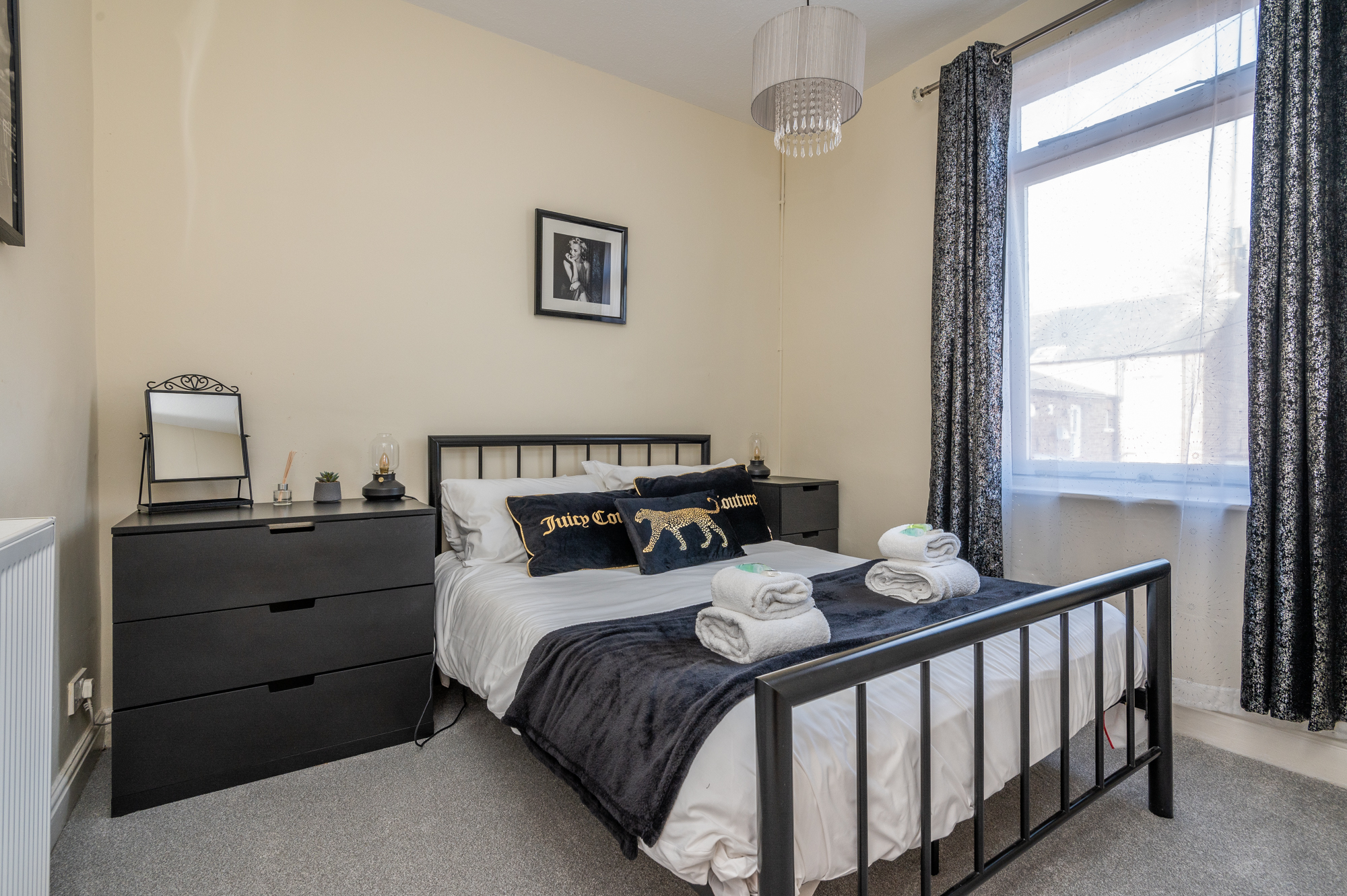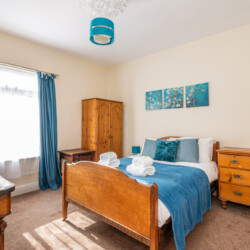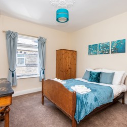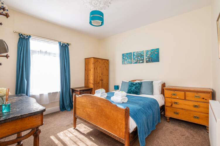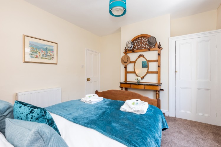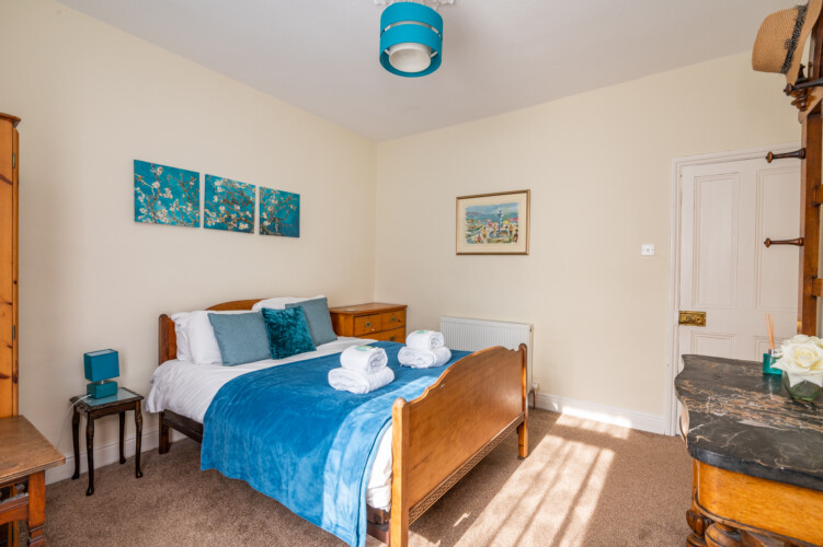 Upstairs are two double bedrooms. The master bedroom is a calm blue and features antique style furniture and the rear bedroom features a stylish Marilyn Monroe monochrome theme! Both have plenty of storage space for guests.