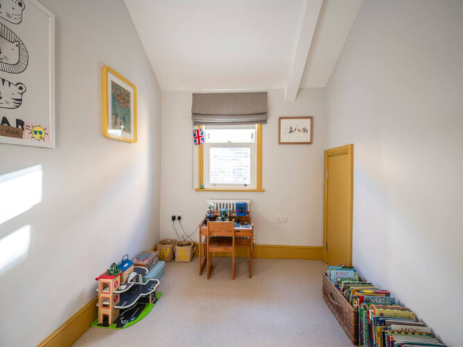 Further along this first-floor landing is an additional playroom area, with a selection of toys and books. A travel cot or additional single pull-out bed could be set up in this room, upon request. Please mention if a travel cot or pull-out single bed is required at the time of booking, (please note – at least 48 hours’ notice would be required to ensure the setup and bedding supply. Due to safety reasons, guests would be required to provide any travel cot bedding, including a base sheet.