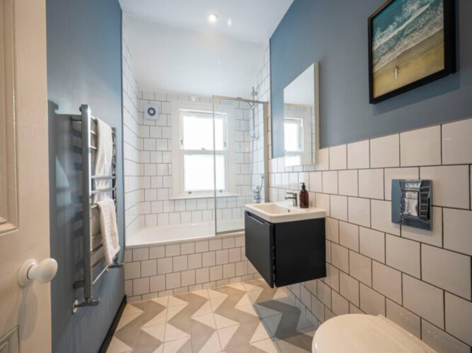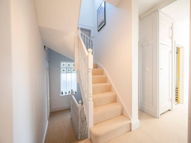 Back within the house and towards the front door, you will find stairs up to the first-floor landing, here guests will find the wonderful Master bedroom, with a king-size bed. This luxurious room is located at the front of the property, overlooking the street. The Master bedroom benefits from large fitted wardrobes with space for guest belongings, bedside tables, and bedside lamps and has a dressing table with a chair which can also be used as a desk area for guests choosing to work or study. The Master bedroom has an inviting, ensuite bathroom with a free-standing bath, large basin area, towel rail, WC, and spacious walk-in shower with rain shower head.