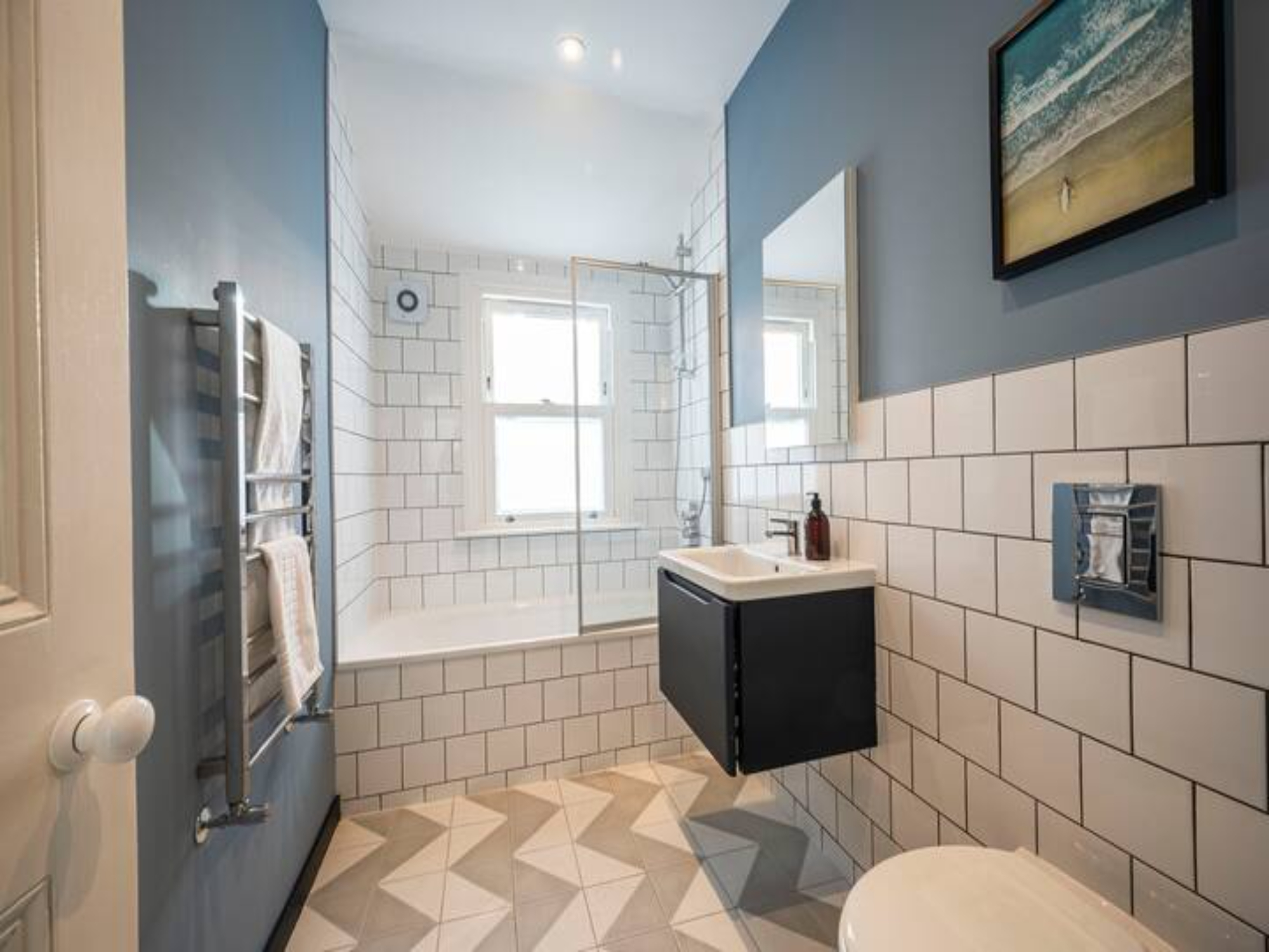 Opposite this second bedroom is a family bathroom. This room has a well-presented, three-piece bathroom suite with a basin, WC, towel rail, and a bath with an over-bath shower. The room has the added benefit of an overbasin mirror.