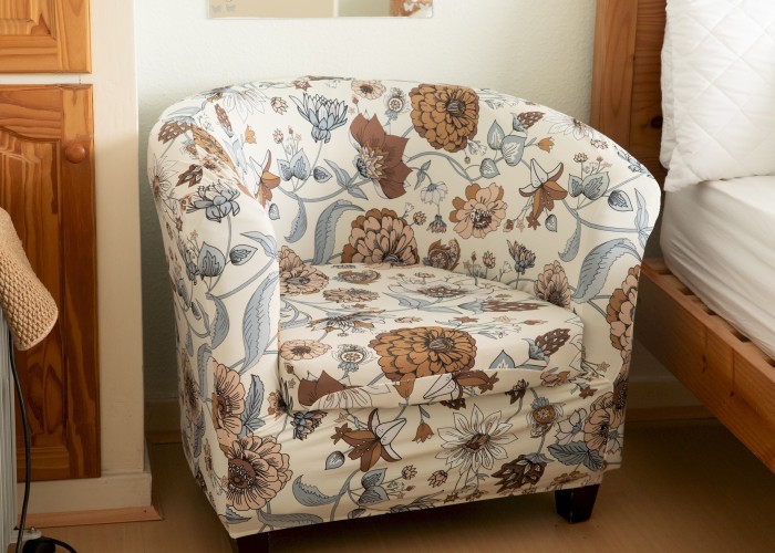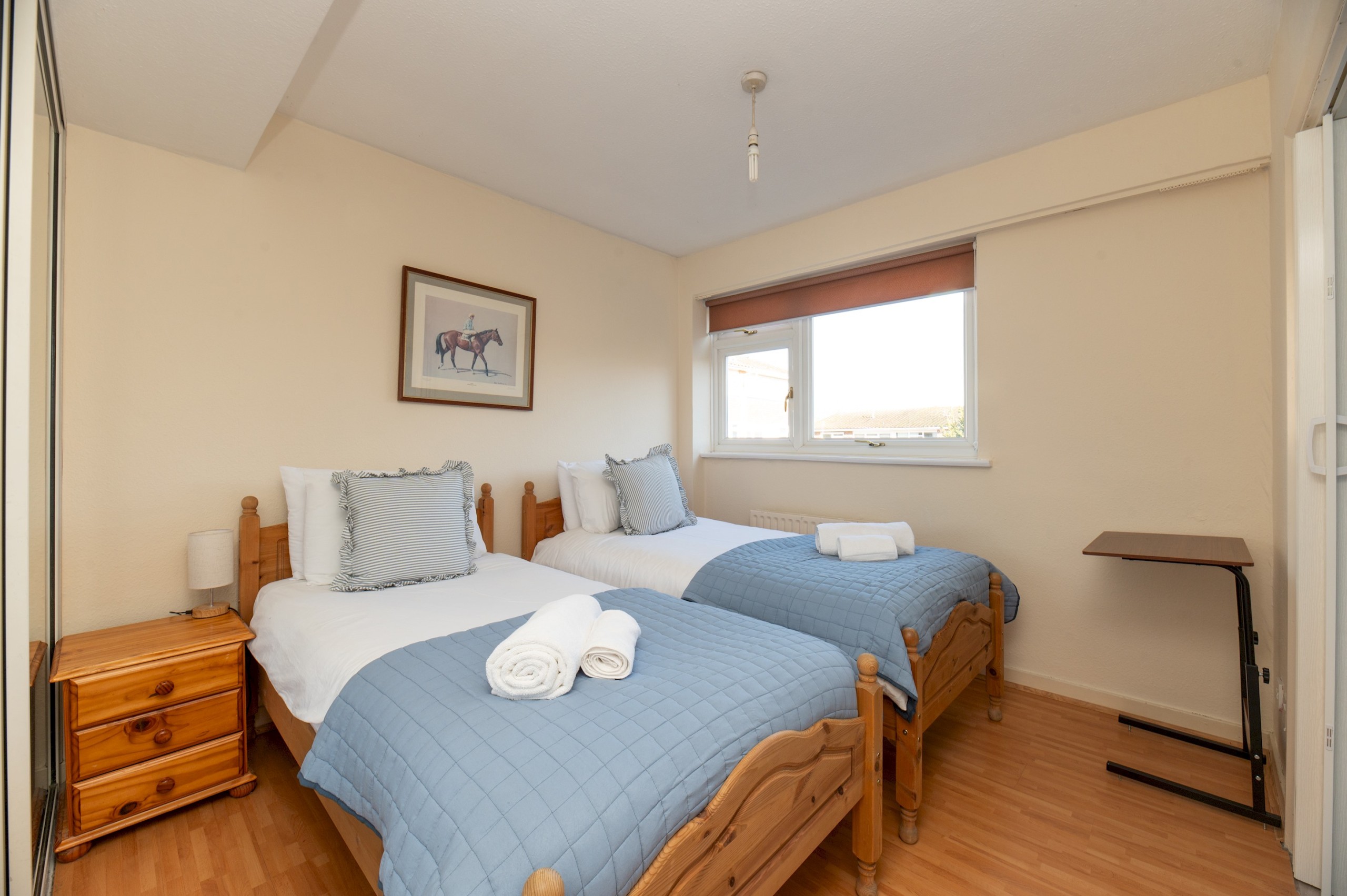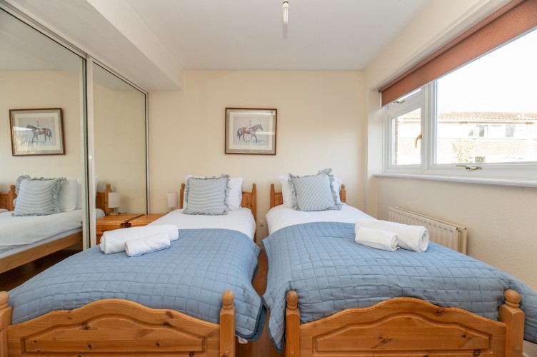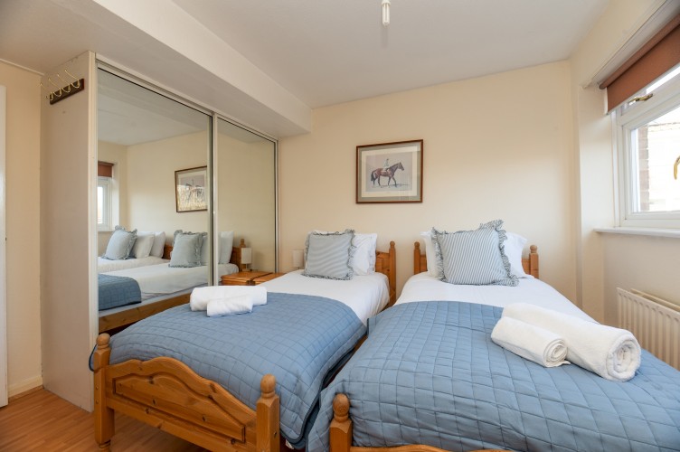 Also on the first floor you will find a twin bedroom with two single beds and a wardrobe, overlooking the garden. This room is ideal for children, friends or other family members who prefer separate beds, and offers a calm, restful atmosphere. Additionally, there is a full bathroom featuring a corner bath, perfect for a relaxing soak or for bathing little ones after a busy day.