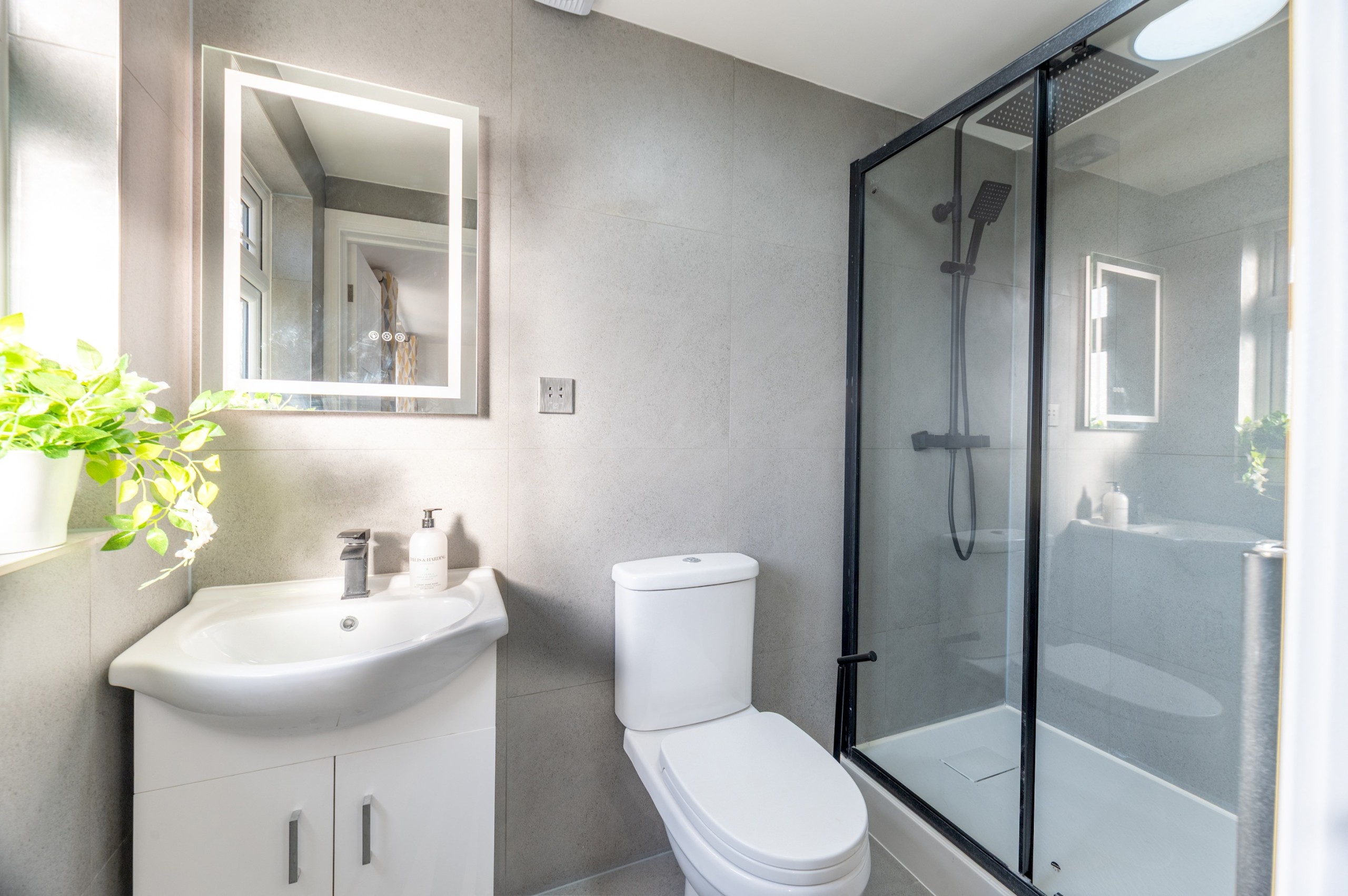 The en-suite bathroom includes a rain-effect shower, Grohe fittings, heated towel rail, and illuminated mirror with shaver port. Additional features include access to a shared garden, 3–4 on-site parking spaces, and a communal kitchen with full-size appliances, making flat 6 ideal for longer stays or guests seeking a spacious, secure, and well-appointed living space.