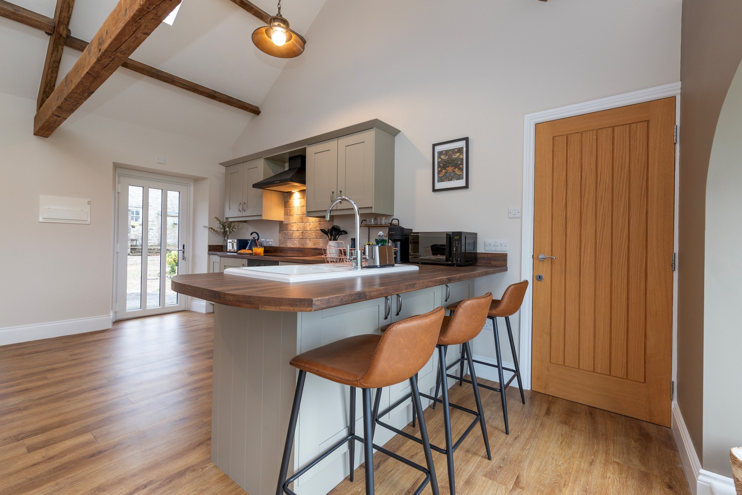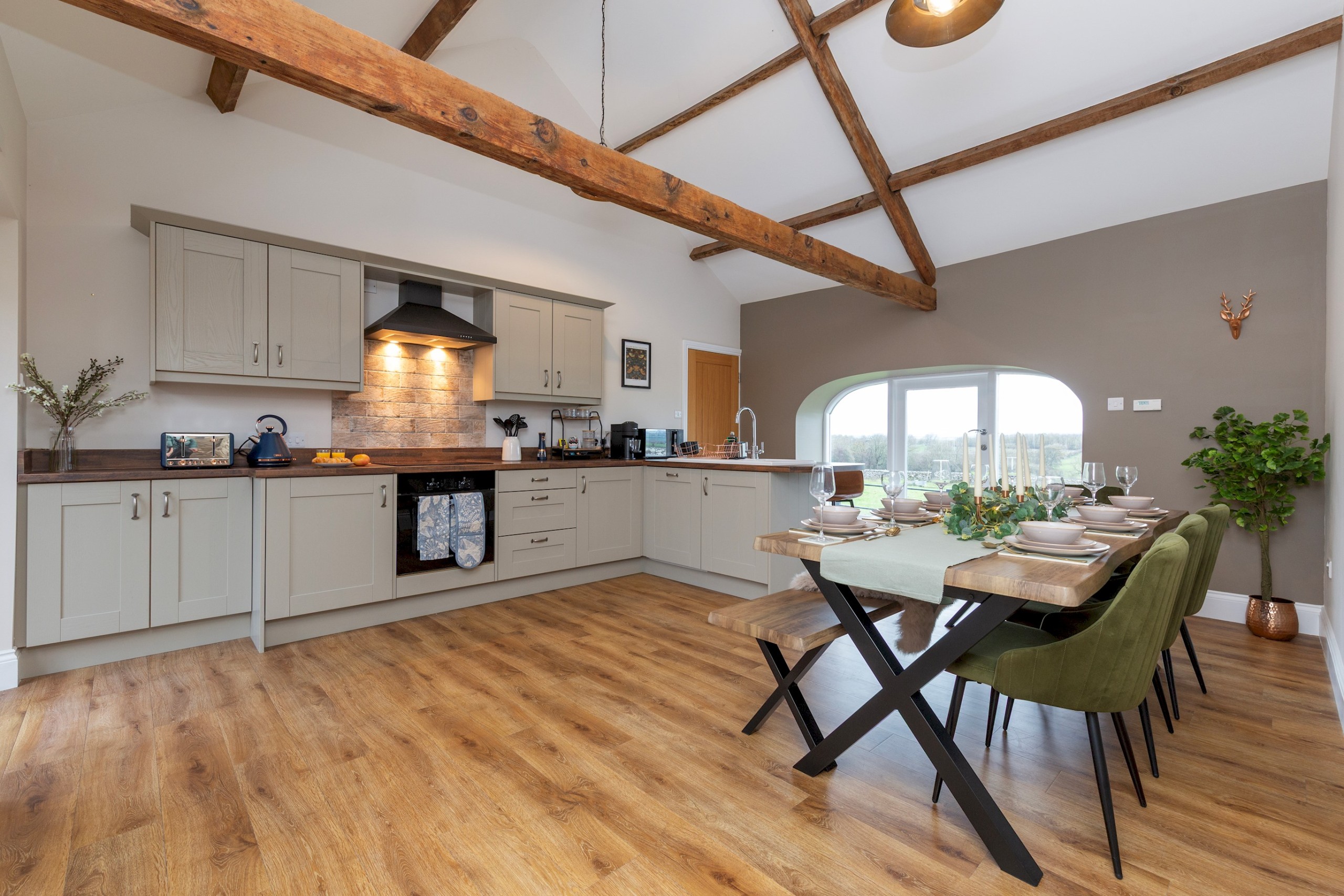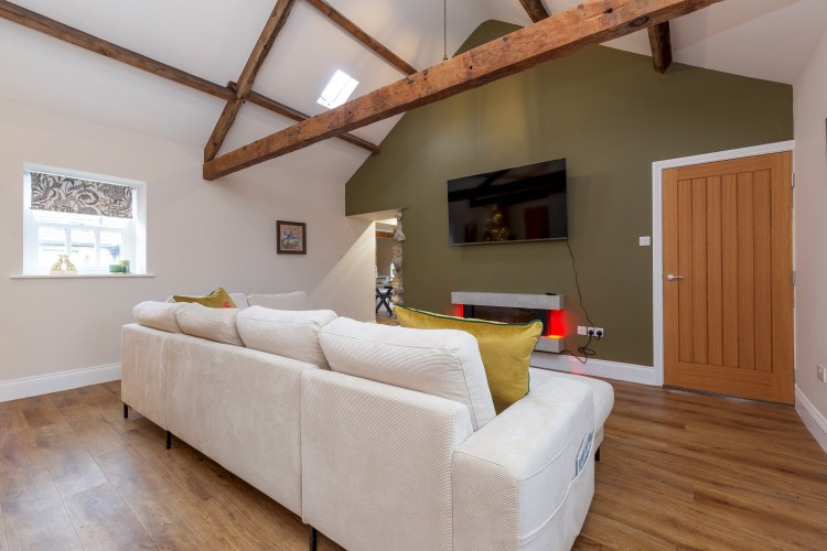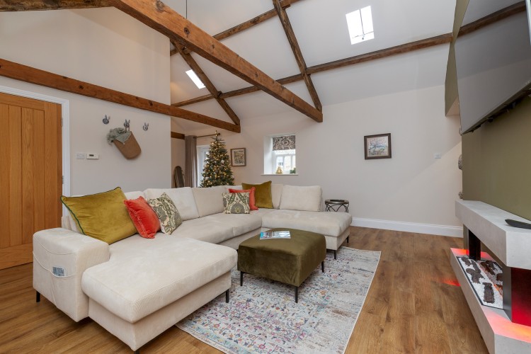 Inside, exposed beams and natural textures blend seamlessly with modern design. The spacious open-plan living area features a statement electric fireplace, plush seating (including two double sofa beds), and a 65-inch Smart TV (please provide your own logins).