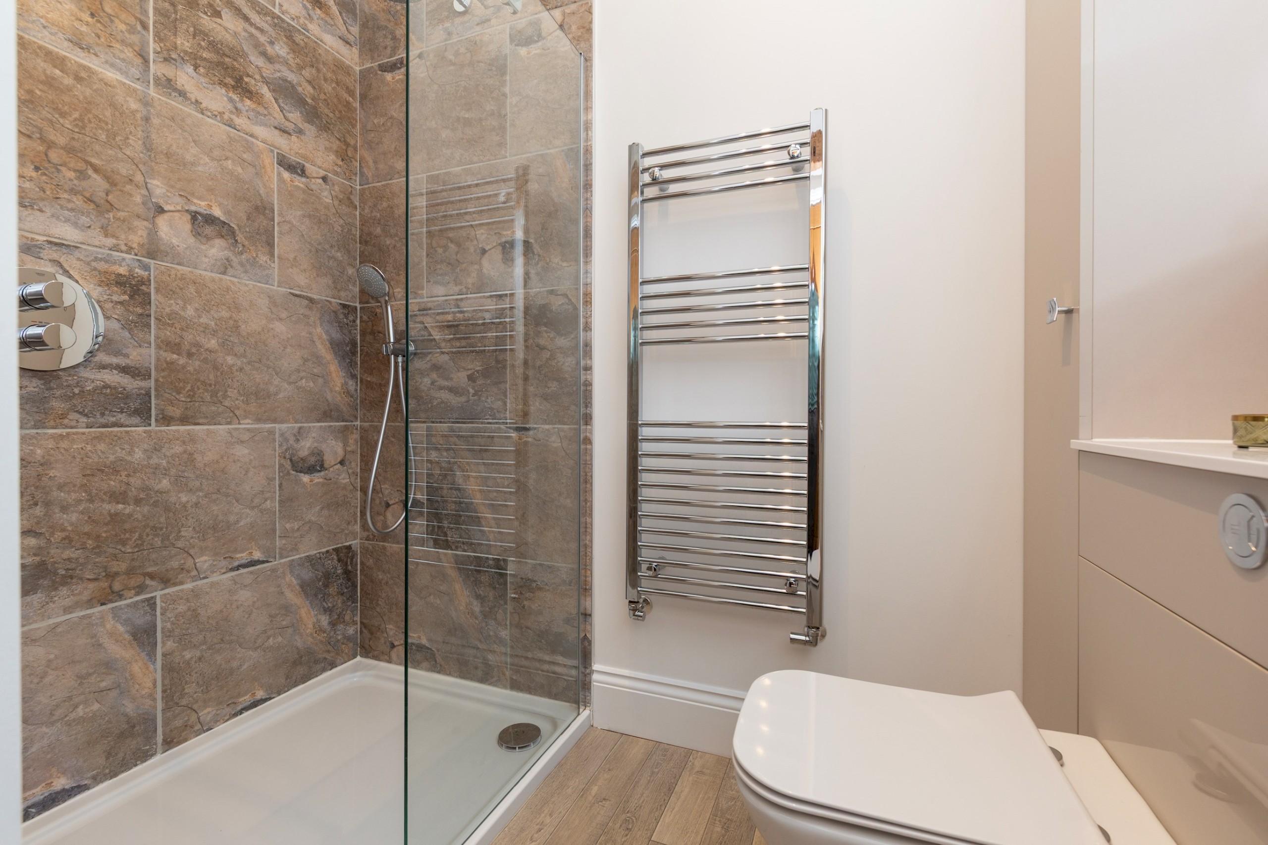 Both bathrooms are beautifully finished, with one featuring a walk-in shower and the other a full bathtub, complemented by underfloor heating throughout.