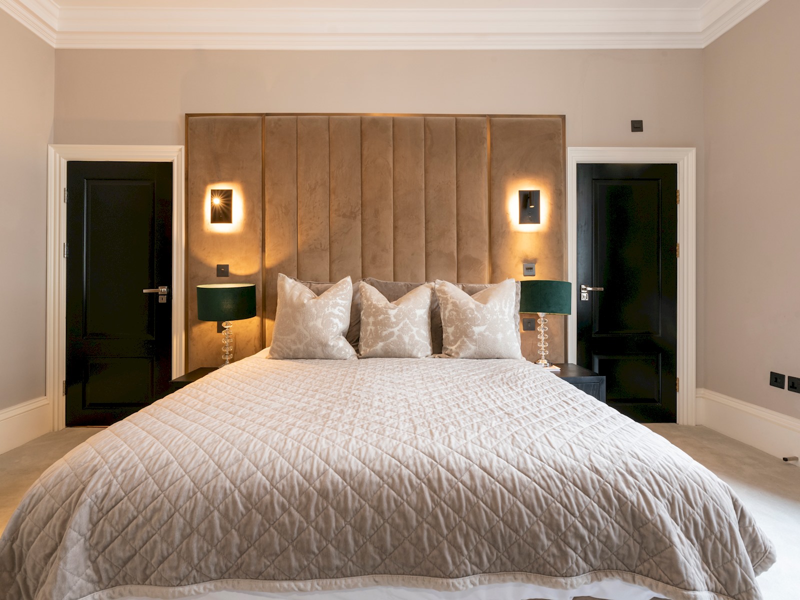 – A king-sized bed with premium bedding, a quilted headboard, and luxurious accent pillows.