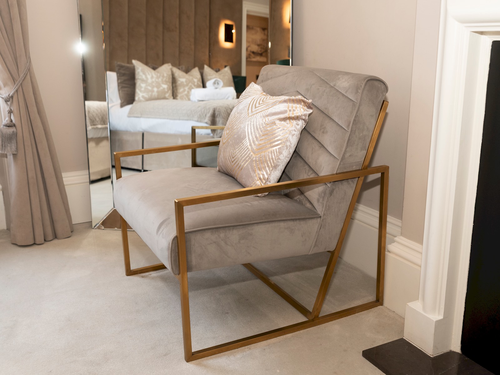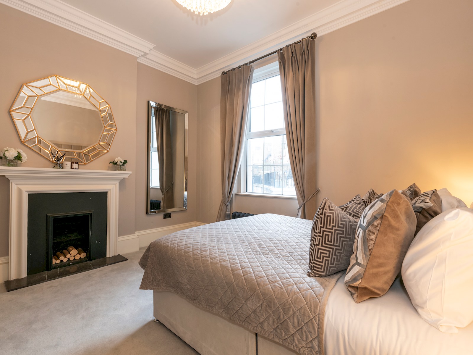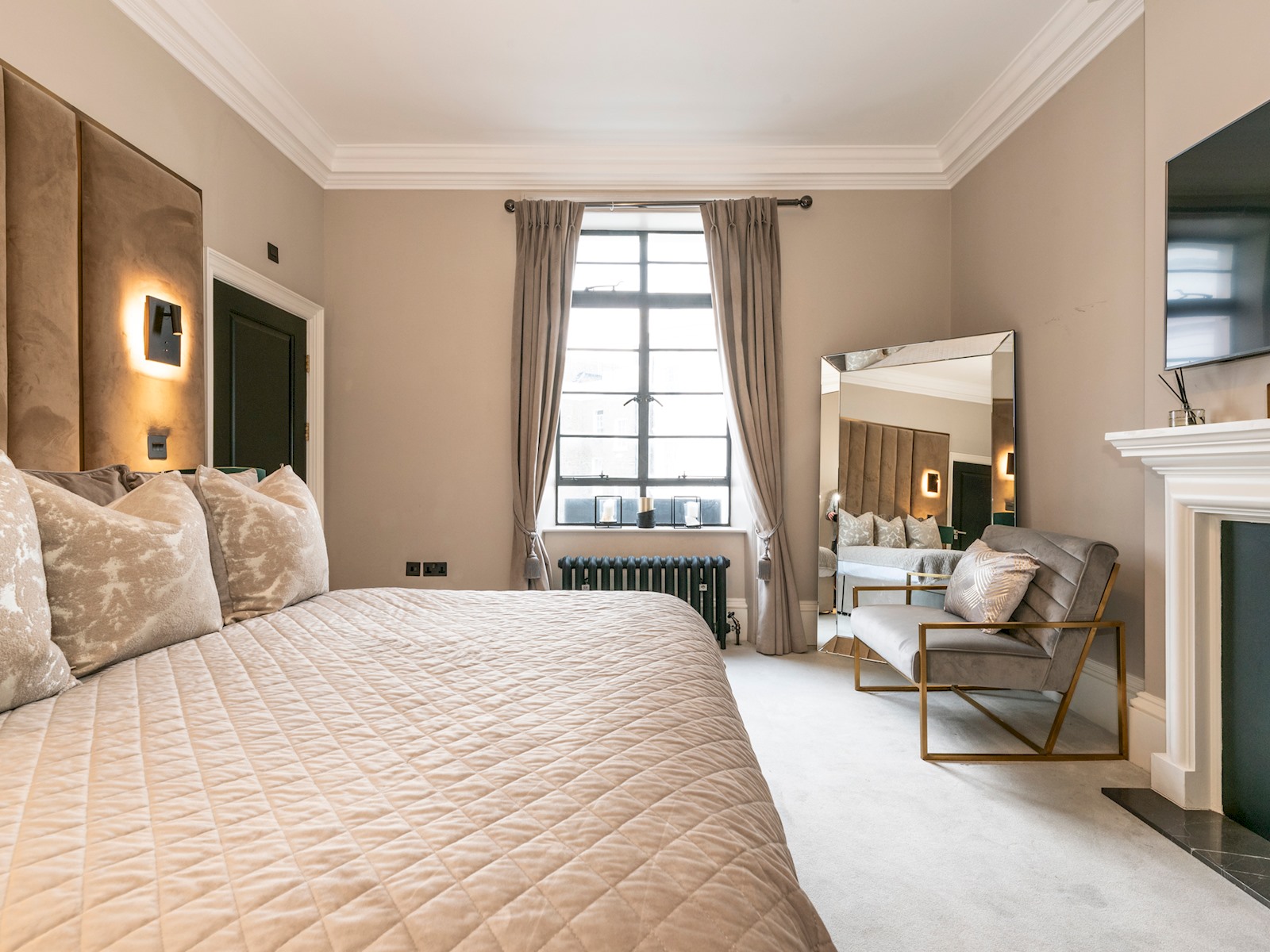 – A gilded geometric mirror above the ornamental fireplace and a full-length mirror for added convenience.
