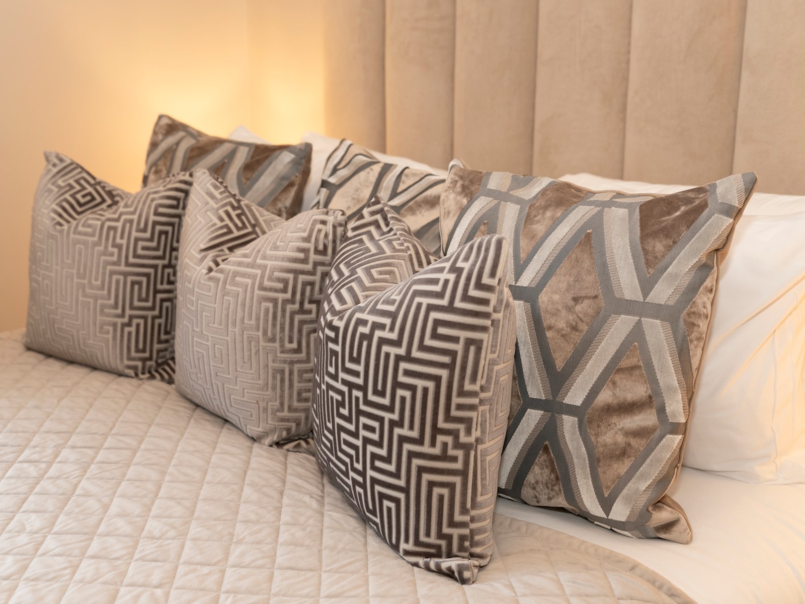 – A double bed with a quilted headboard, soft bedding, and a variety of decorative cushions.