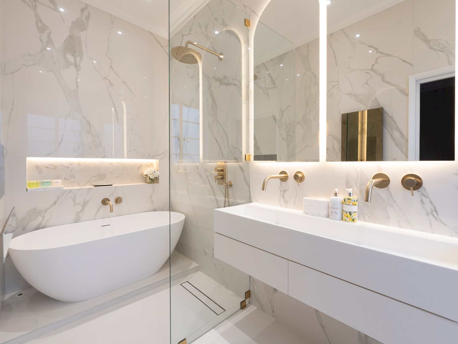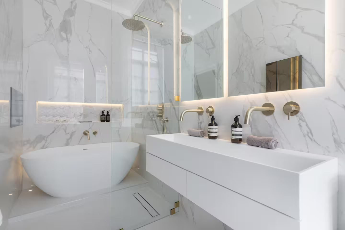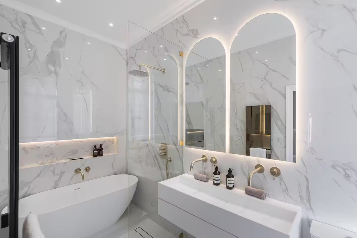– A sleek, modern kitchen with matte cabinetry, marble-effect splashbacks, and integrated appliances.