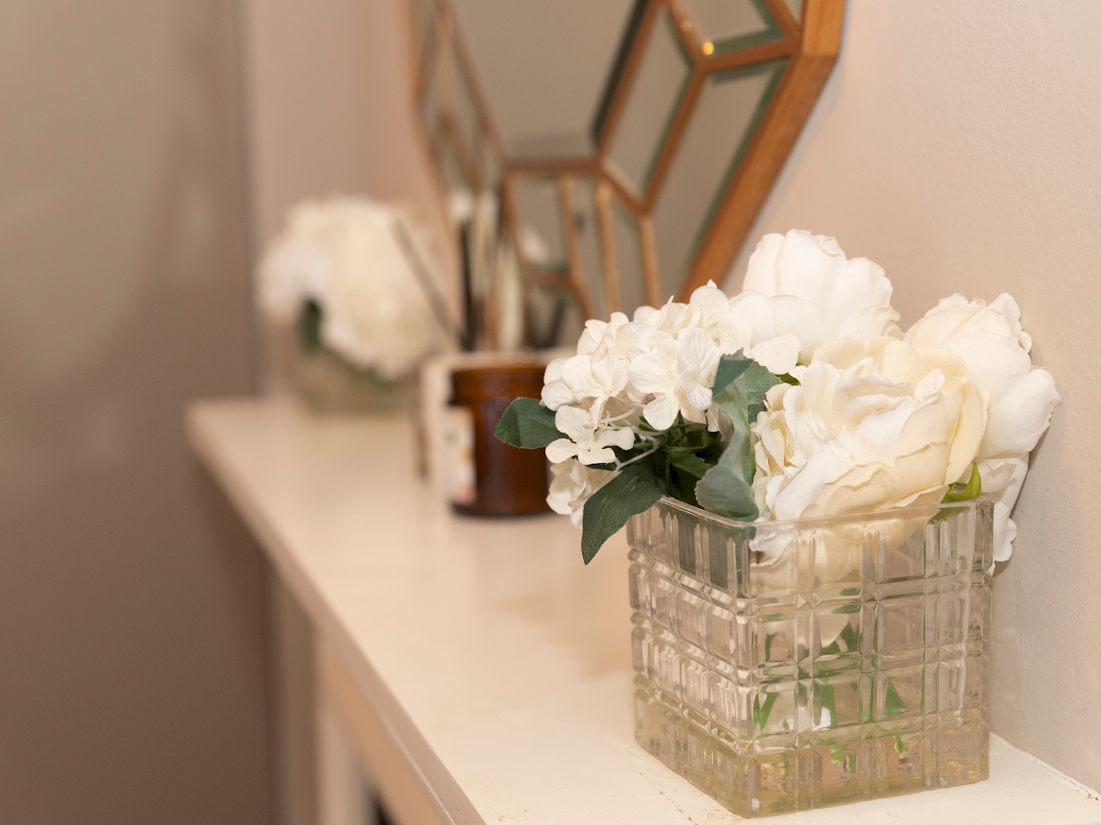 – Thoughtful touches, including flowers and elegant decor, complete this functional and stylish space.