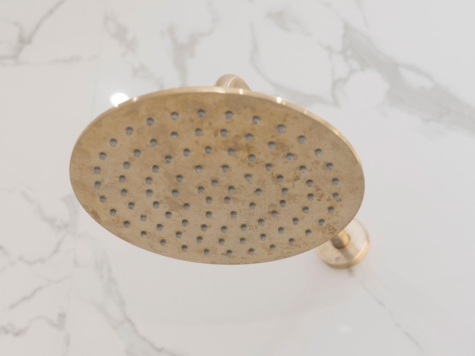 – A clear glass-enclosed shower with a rainfall showerhead in a gold finish.