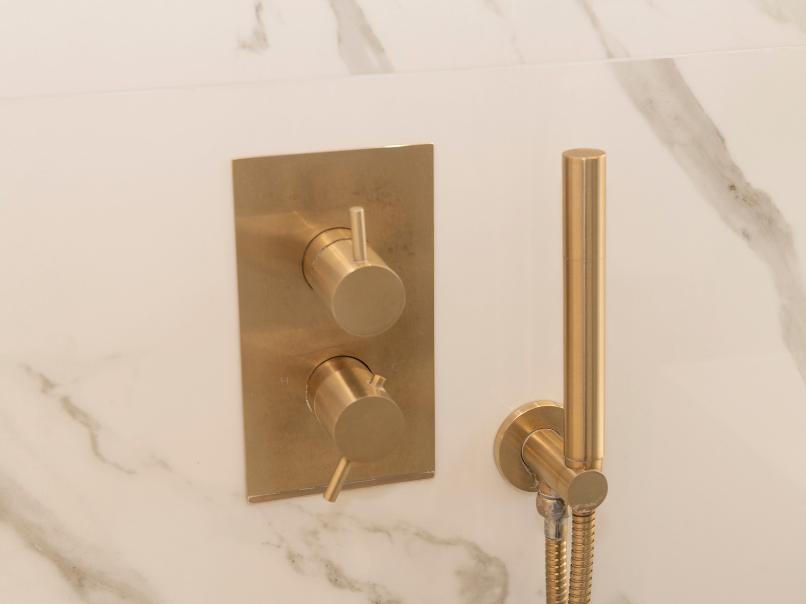 – A minimalist white vanity unit with a rectangular sink and gold fixtures for a luxurious spa-like ambience.