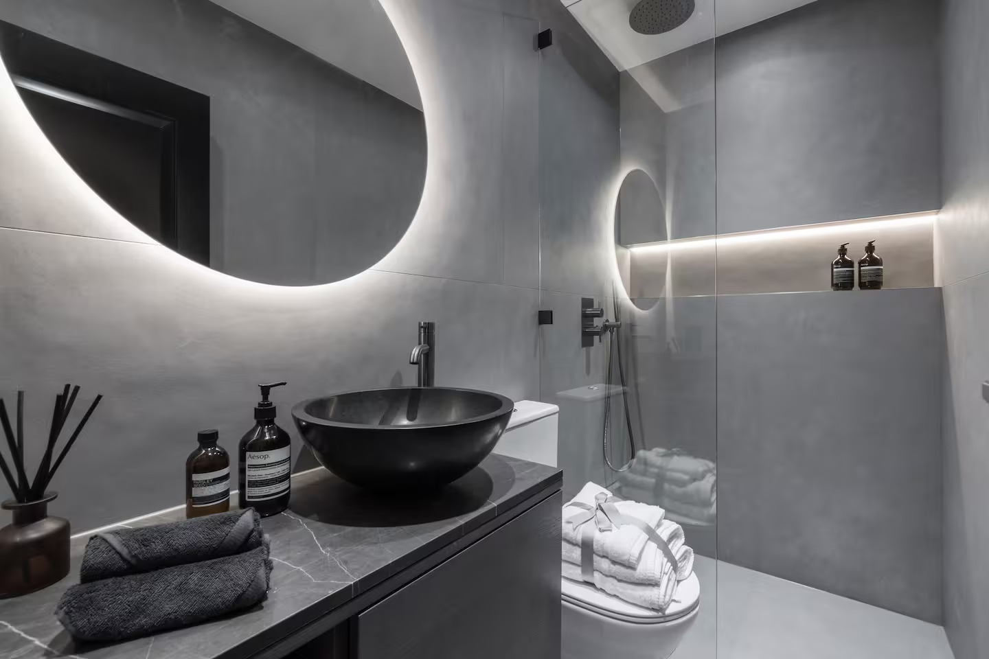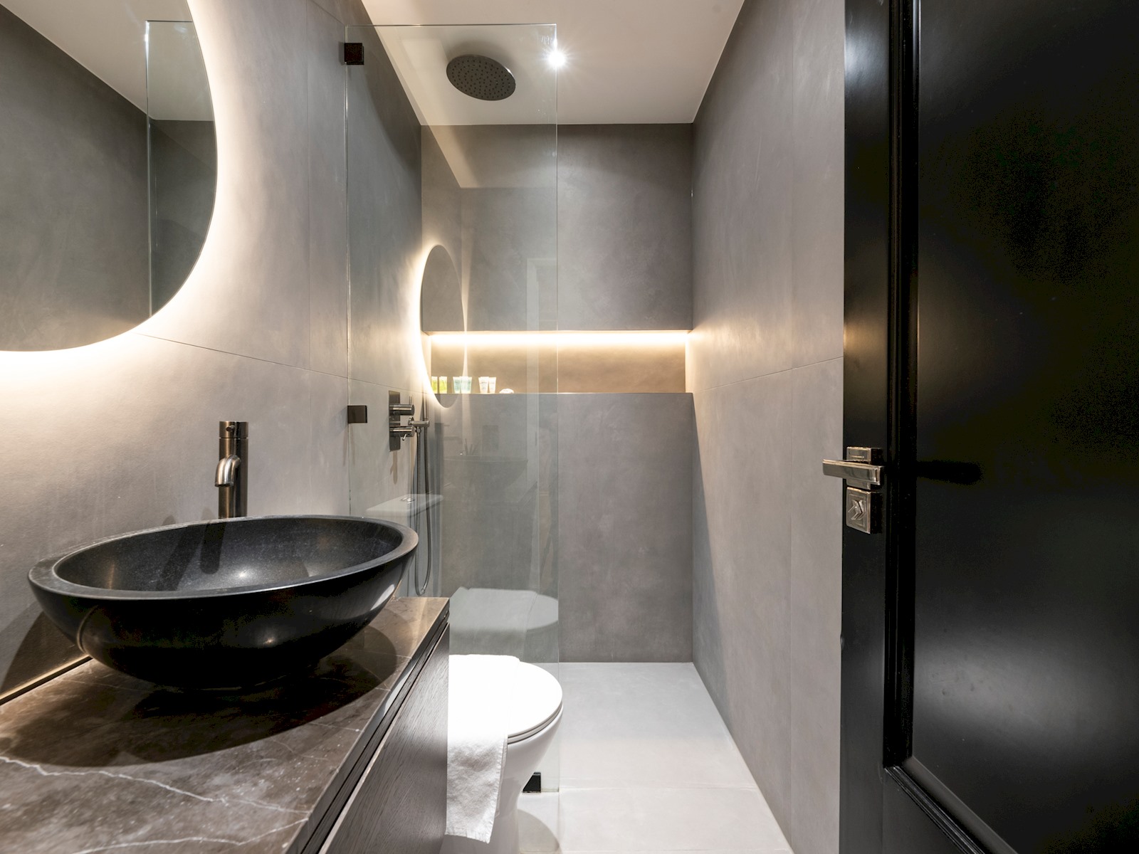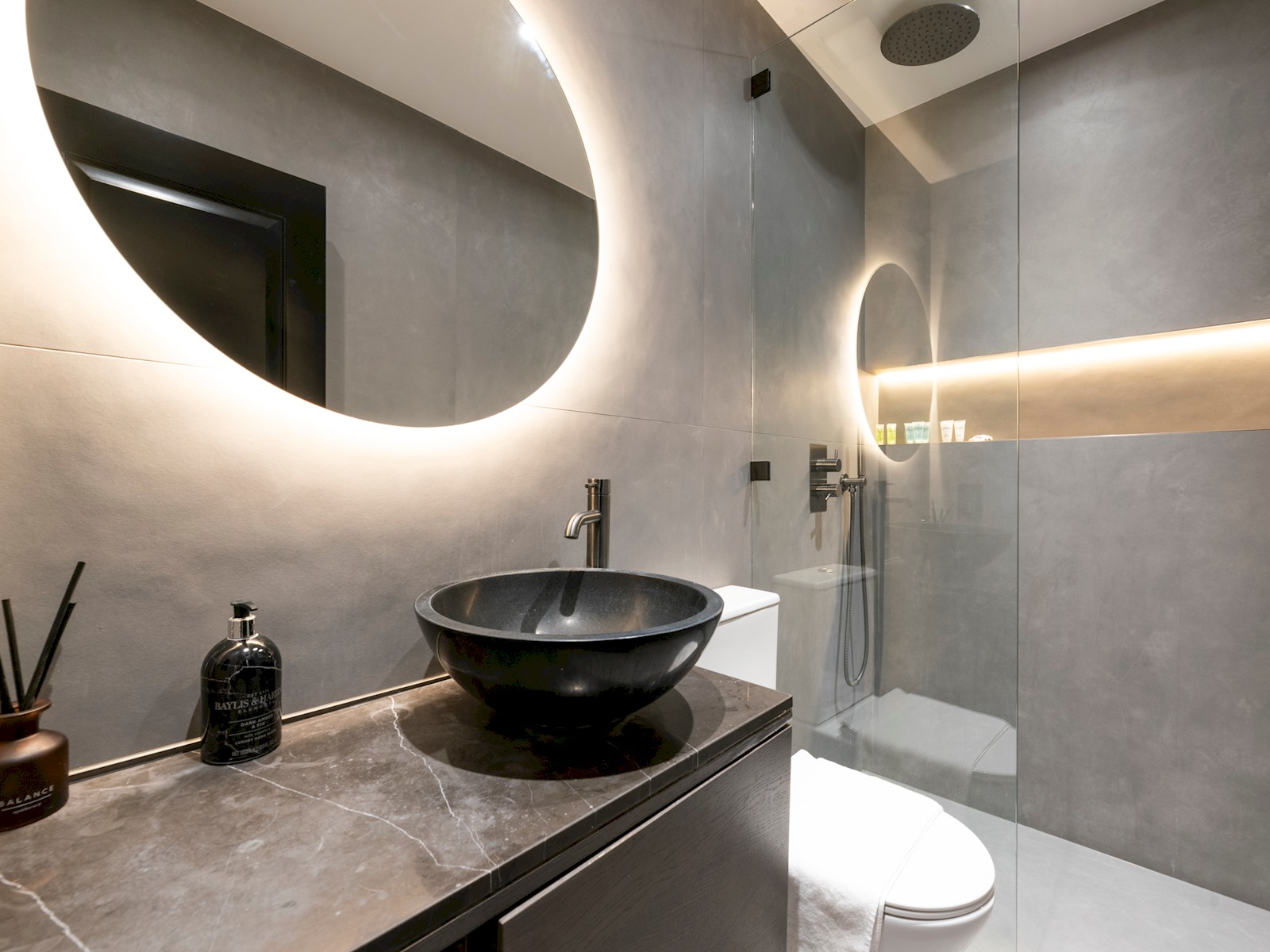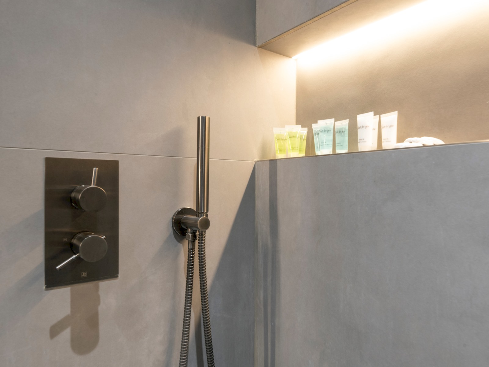 – A contemporary, grey-tiled space with a walk-in rain shower.