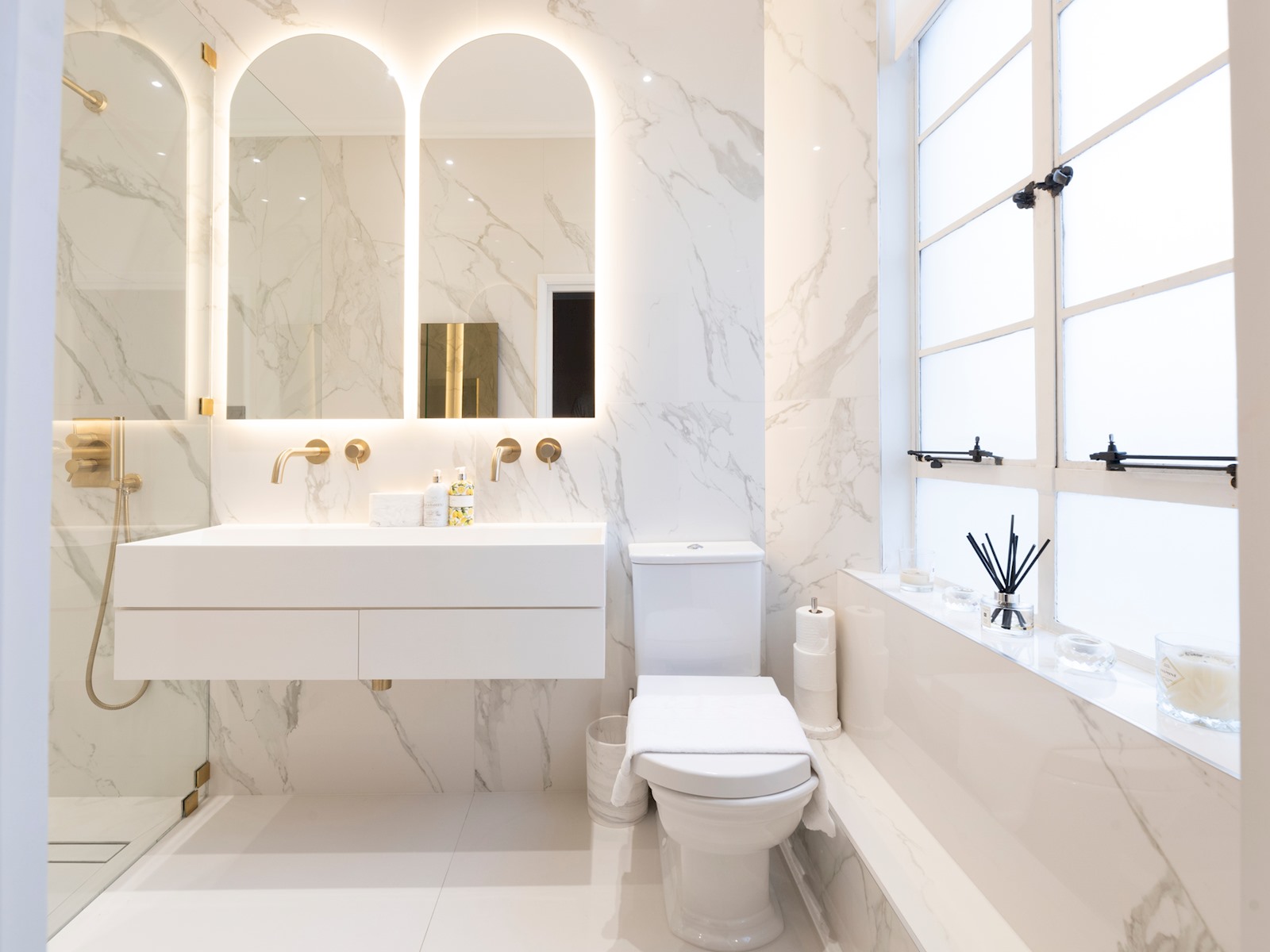– White walls and flooring with marble veining for a sleek and elegant look.
