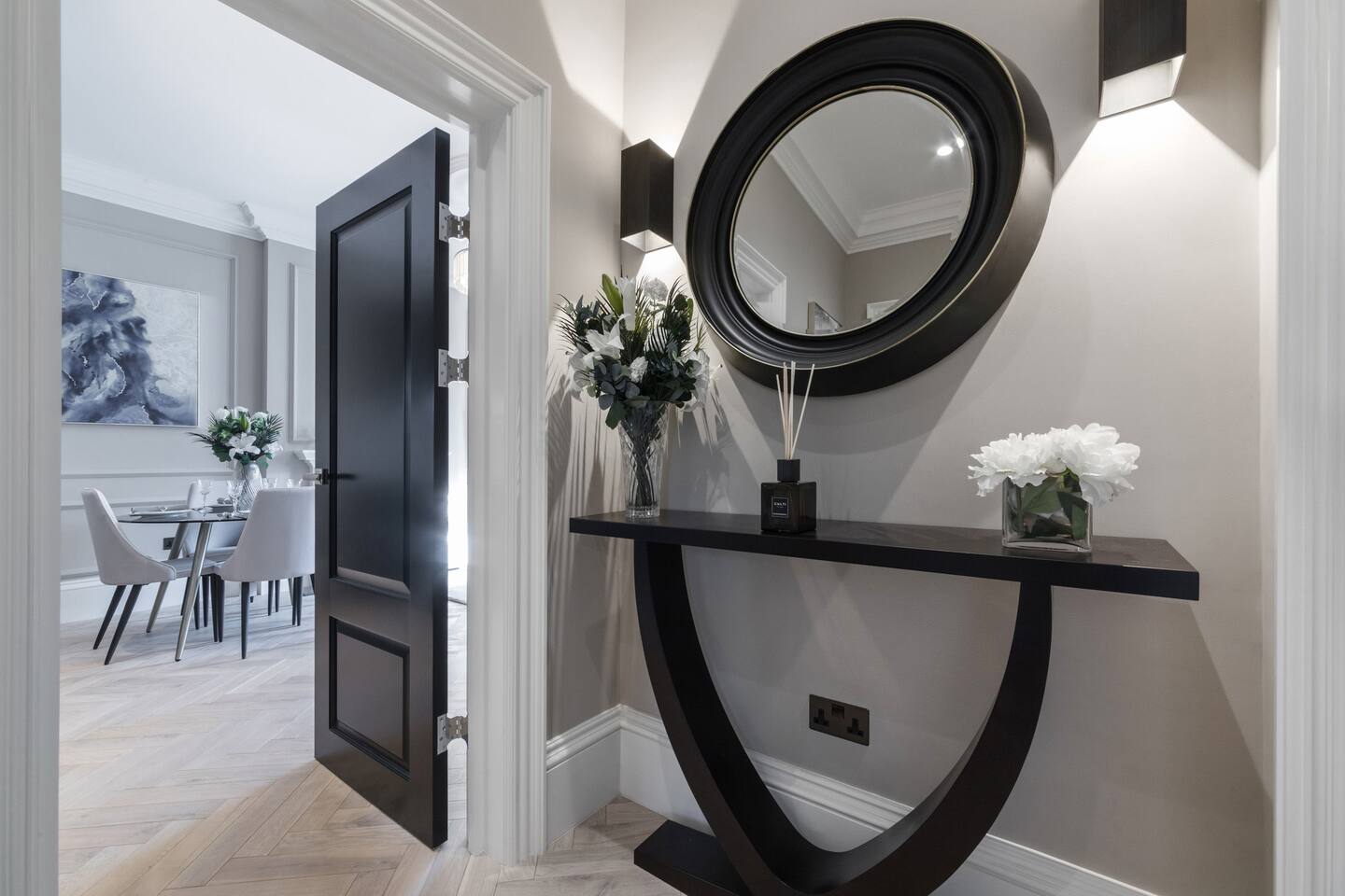 – A welcoming entrance with a sleek console table, a statement round mirror, and ambient lighting.