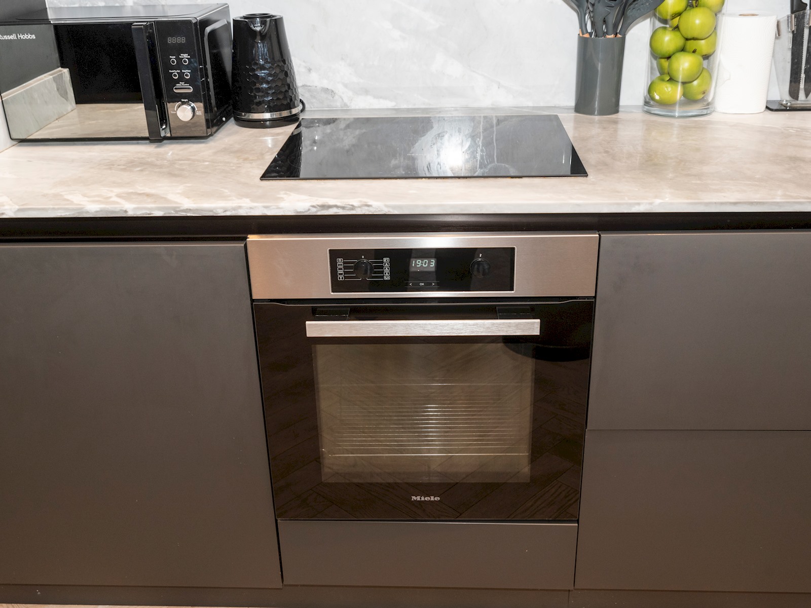 – A sleek, modern kitchen with matte cabinetry, marble-effect splashbacks, and integrated appliances.