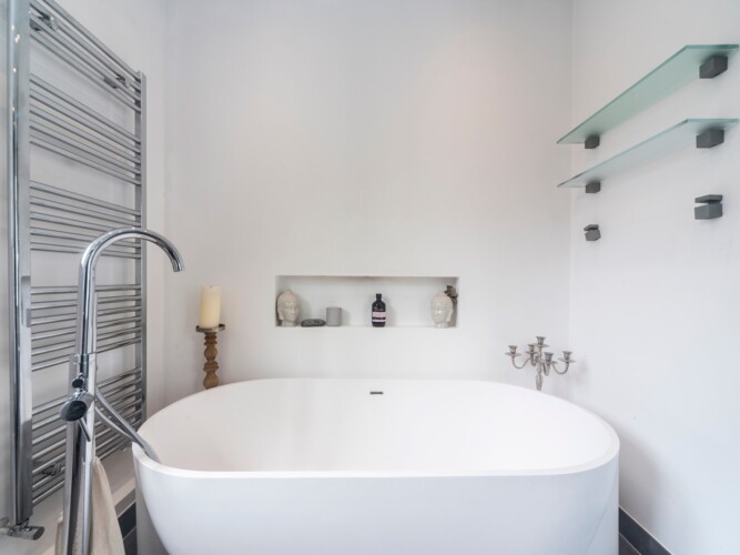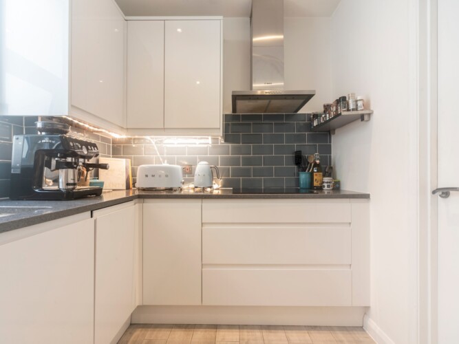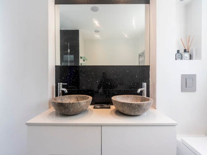A bright and airy living space, with a modern kitchen. The master bedroom boasts a super-king sized bed and en suite bathroom with luxurious chromotherapy shower and his and twin wash basins.