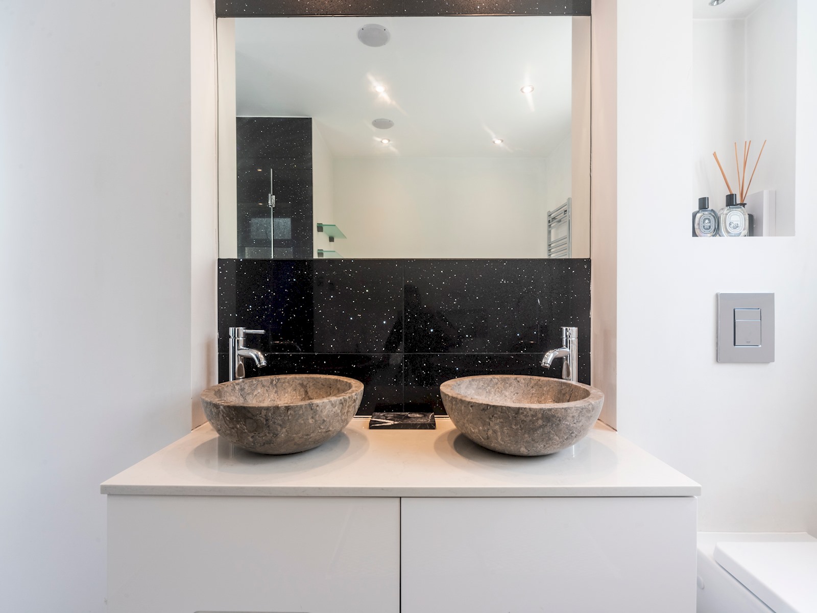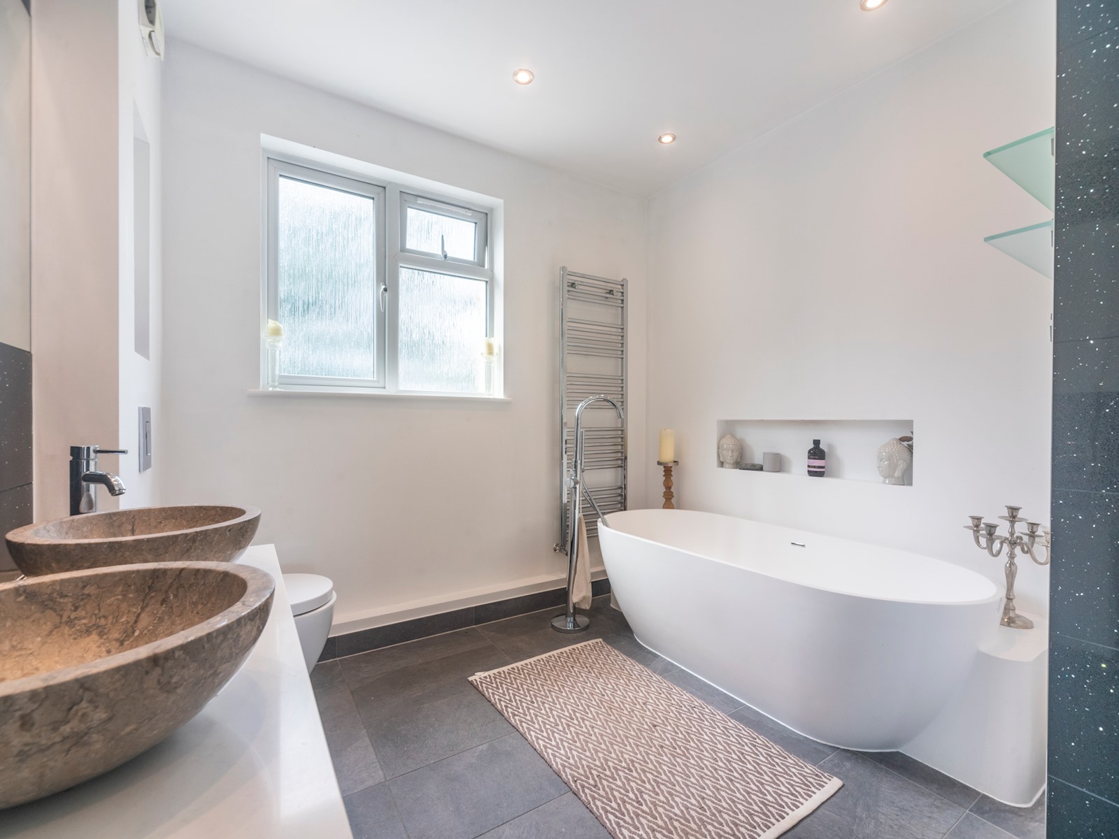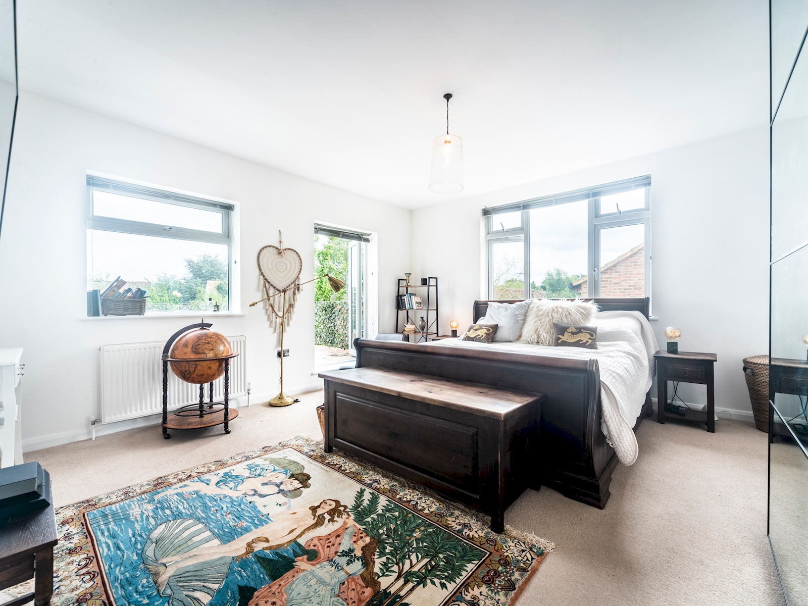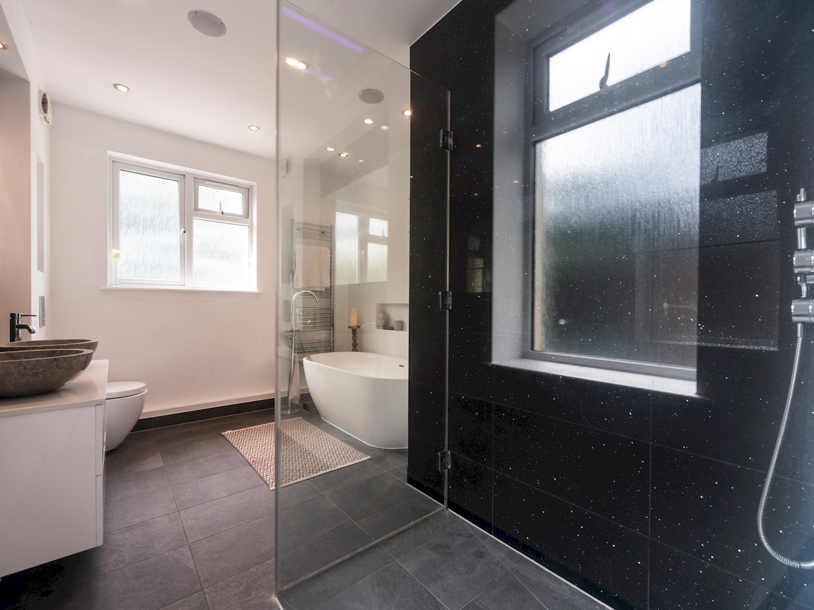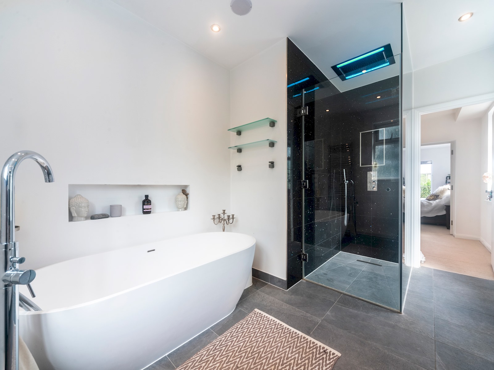 The master bedroom includes a huge super-king sized bed, walk-in wardrobe, a beautiful en suite bathroom with an amazing chromotherapy shower, and double doors leading out onto the terrace!