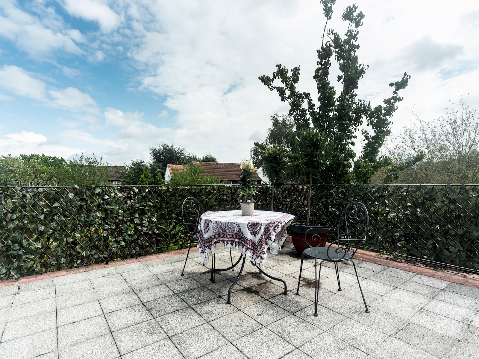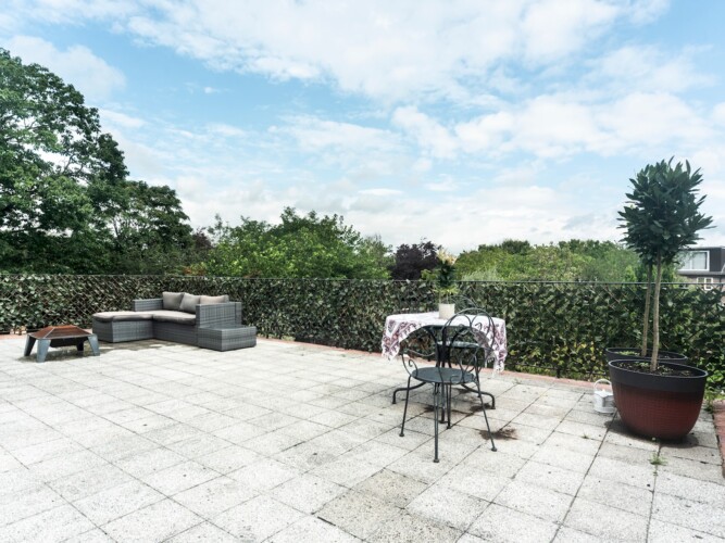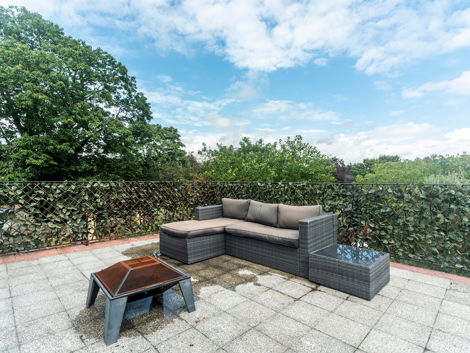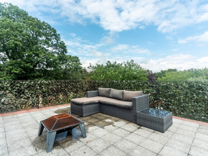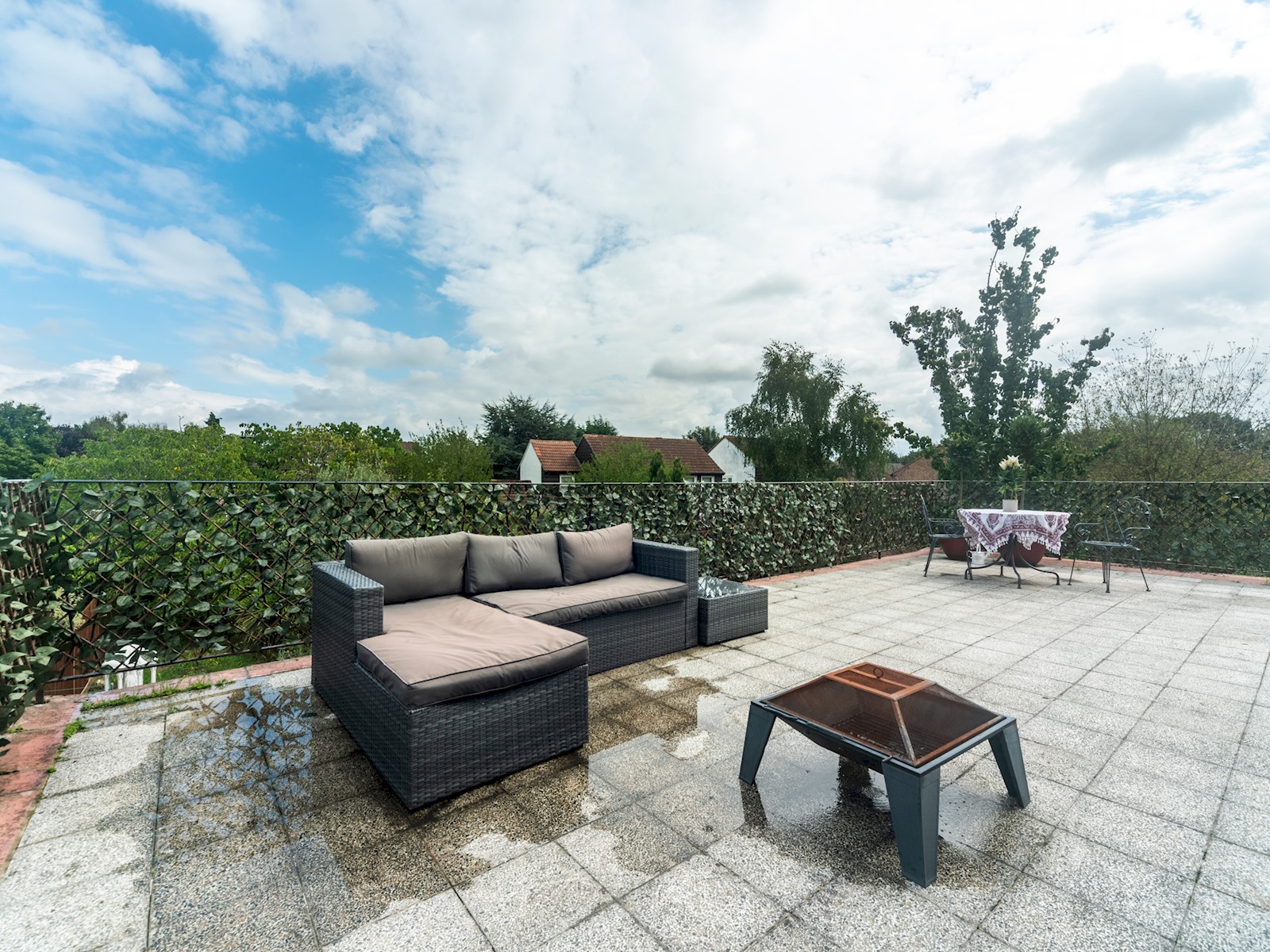 The large terrace has a comfortable seating area and dining area with great views of the surrounding area.