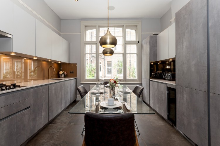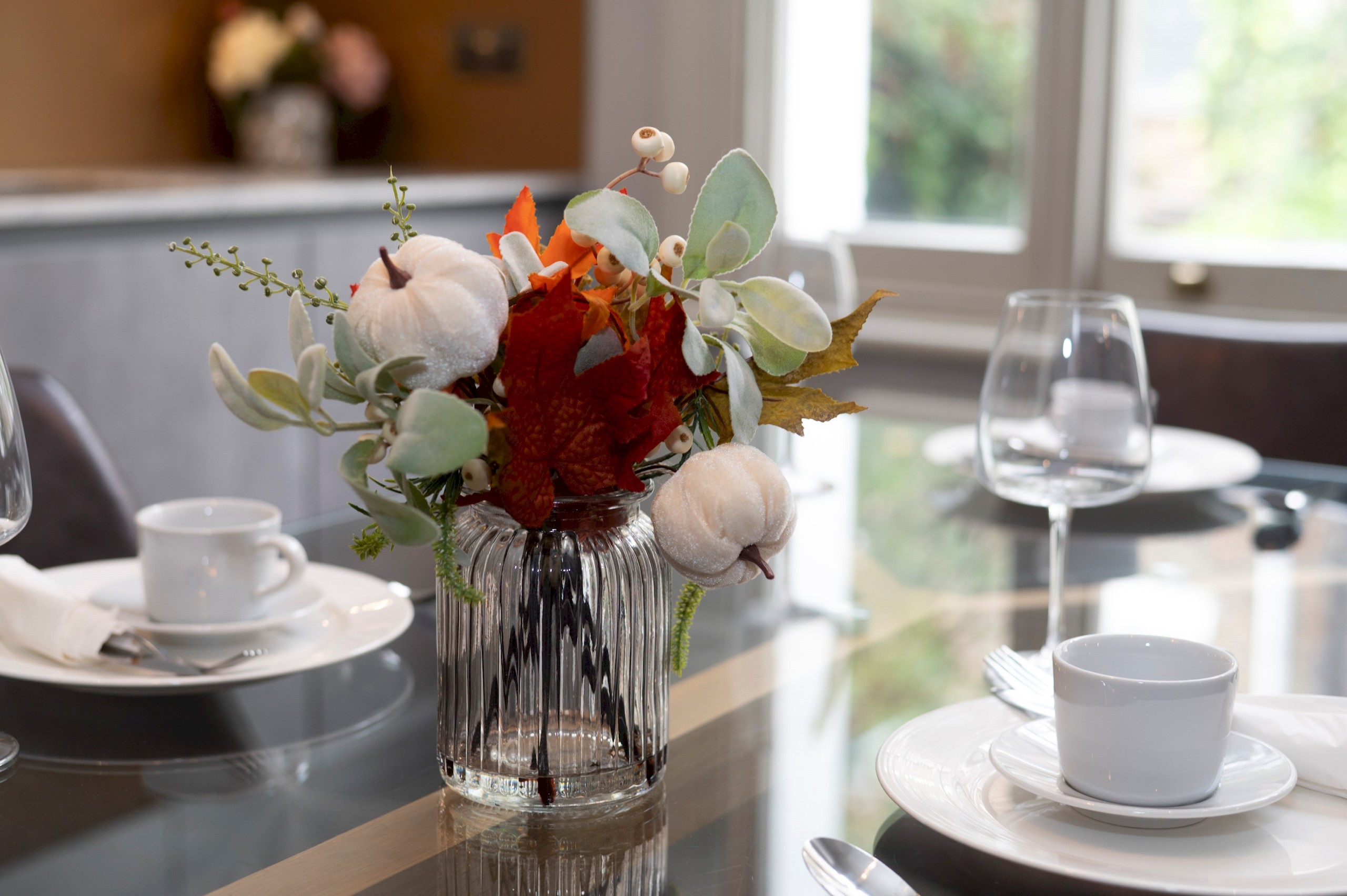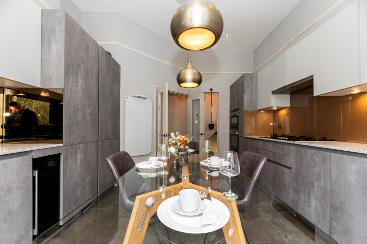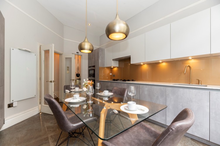 The dining area sits beautifully within the space, ideal for shared meals or working from home.
