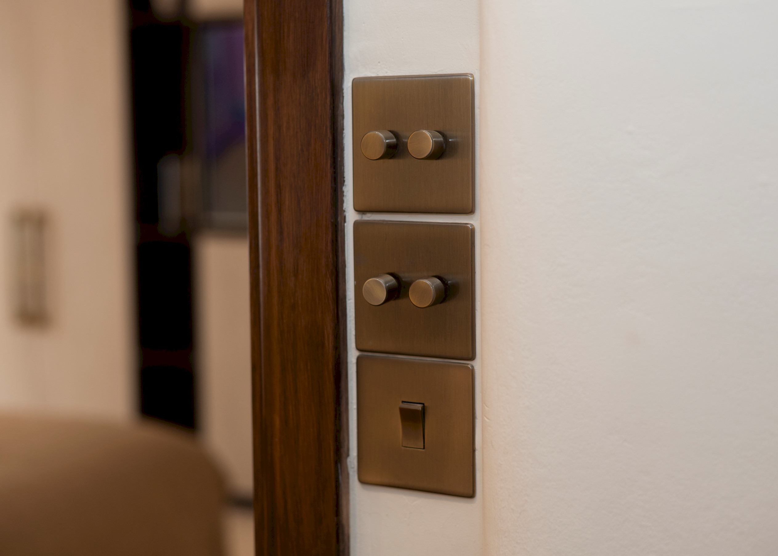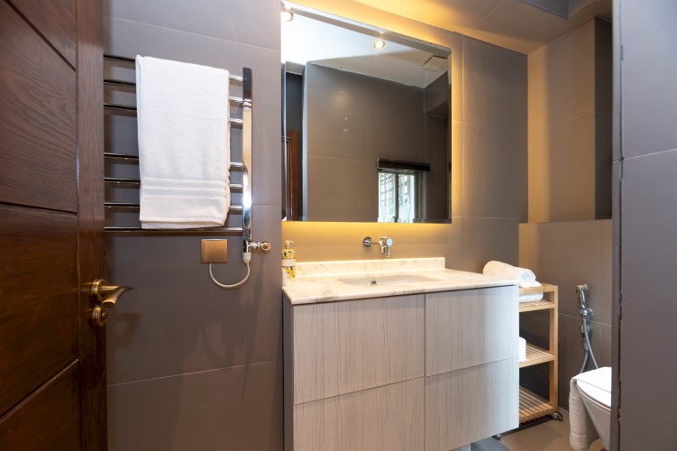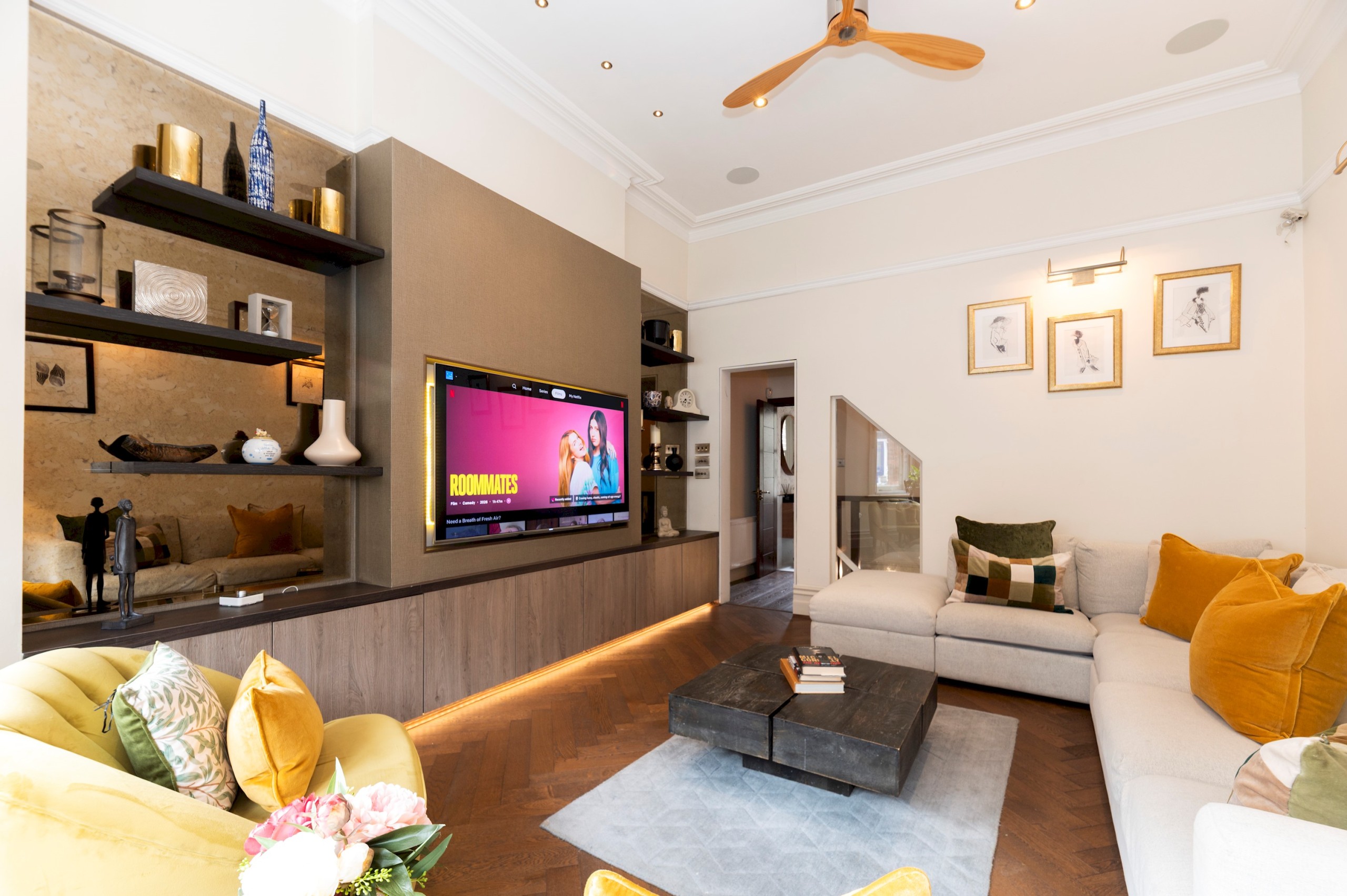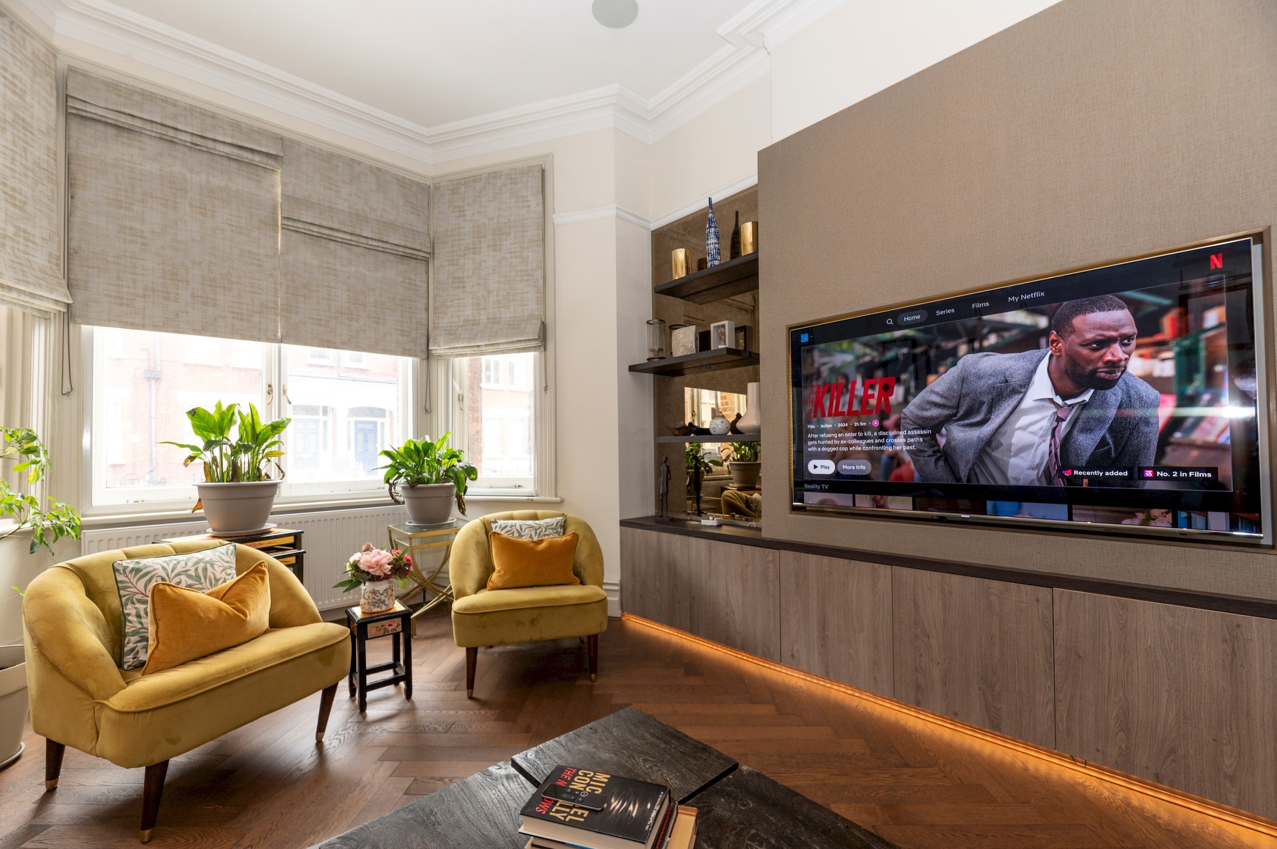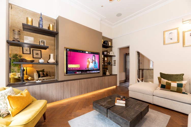 To your left, the living room offers a comfortable and elegant space to unwind. A large 70-inch TV, built-in ceiling speakers, and carefully styled seating create the perfect setting for relaxing evenings. The room is finished with warm tones, soft lighting, and a premium feel throughout