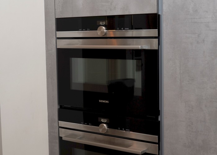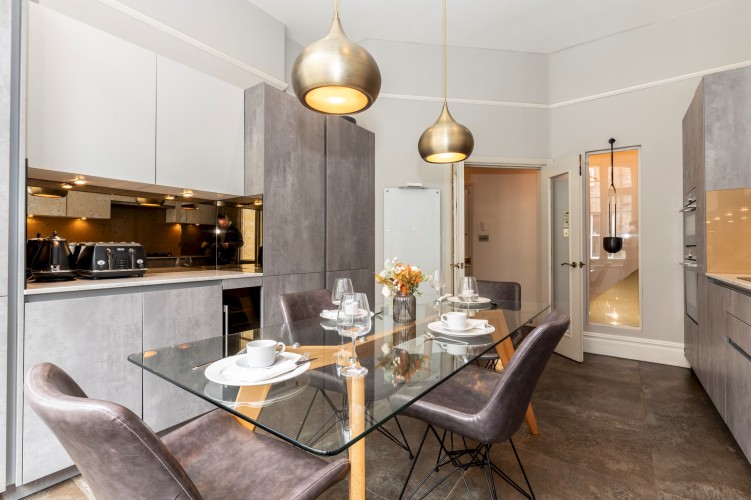 The kitchen is fully equipped and designed for both short and extended stays. It features an American-style fridge, a wine fridge, a dishwasher, and high-end appliances throughout