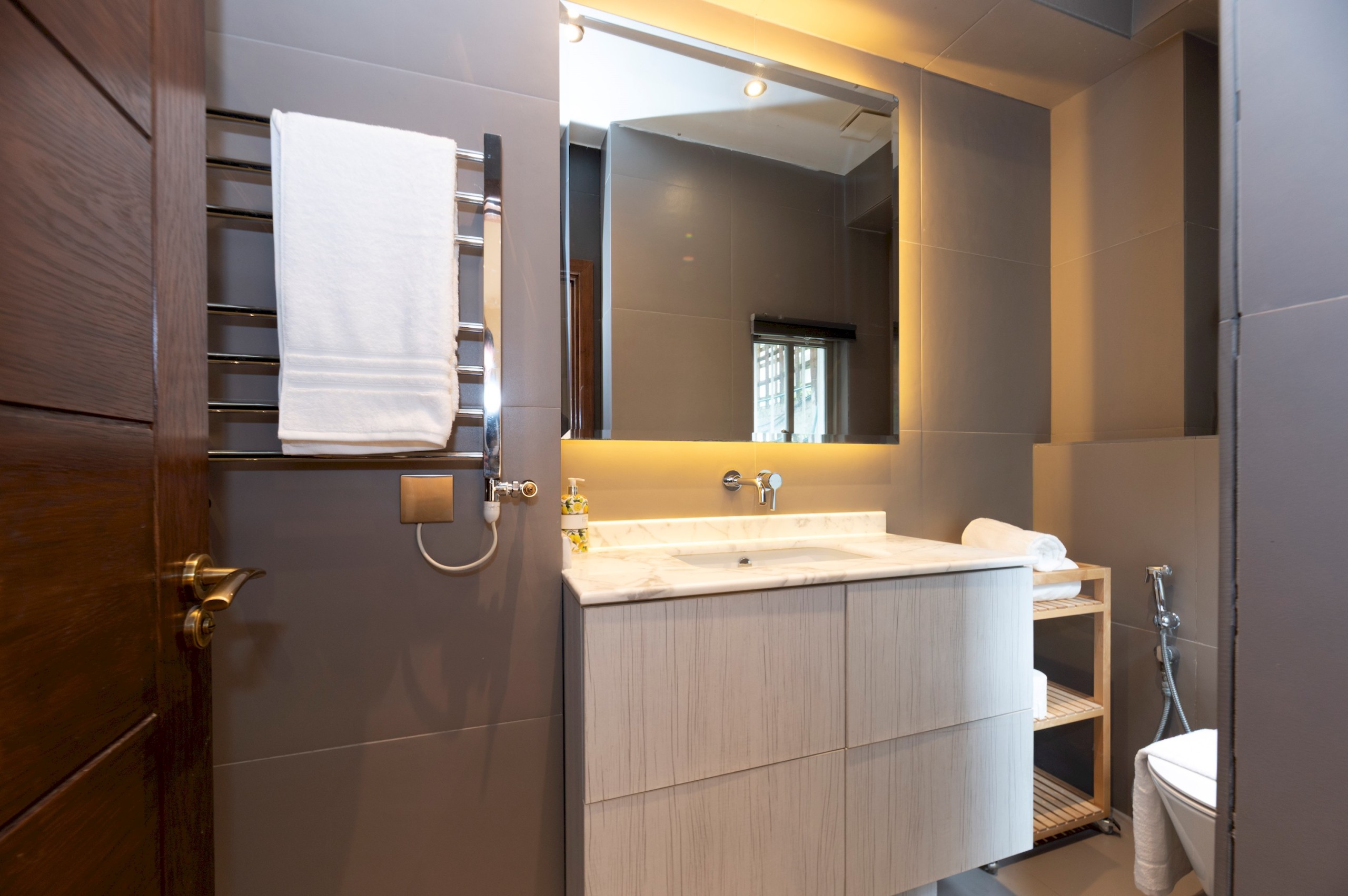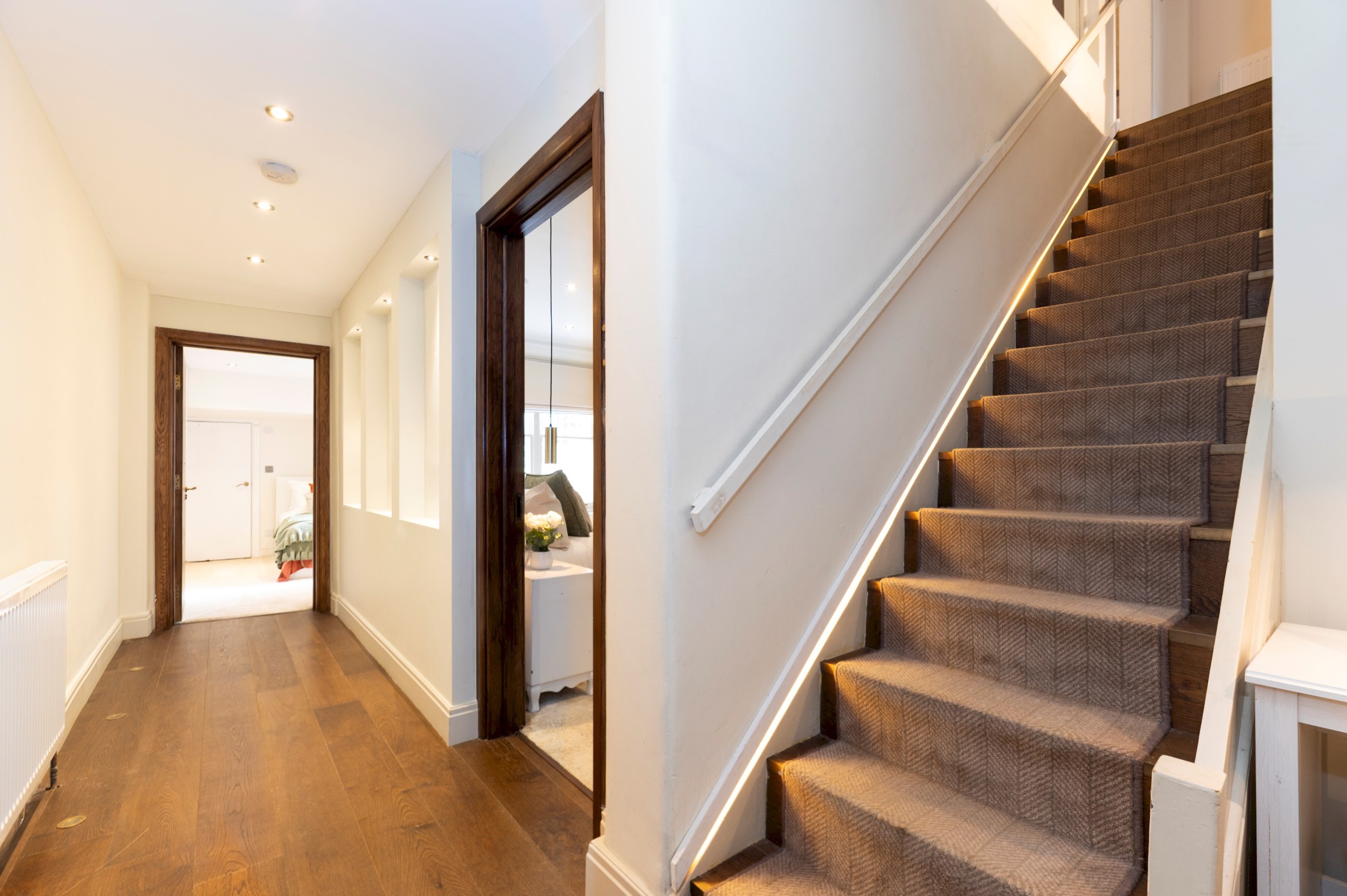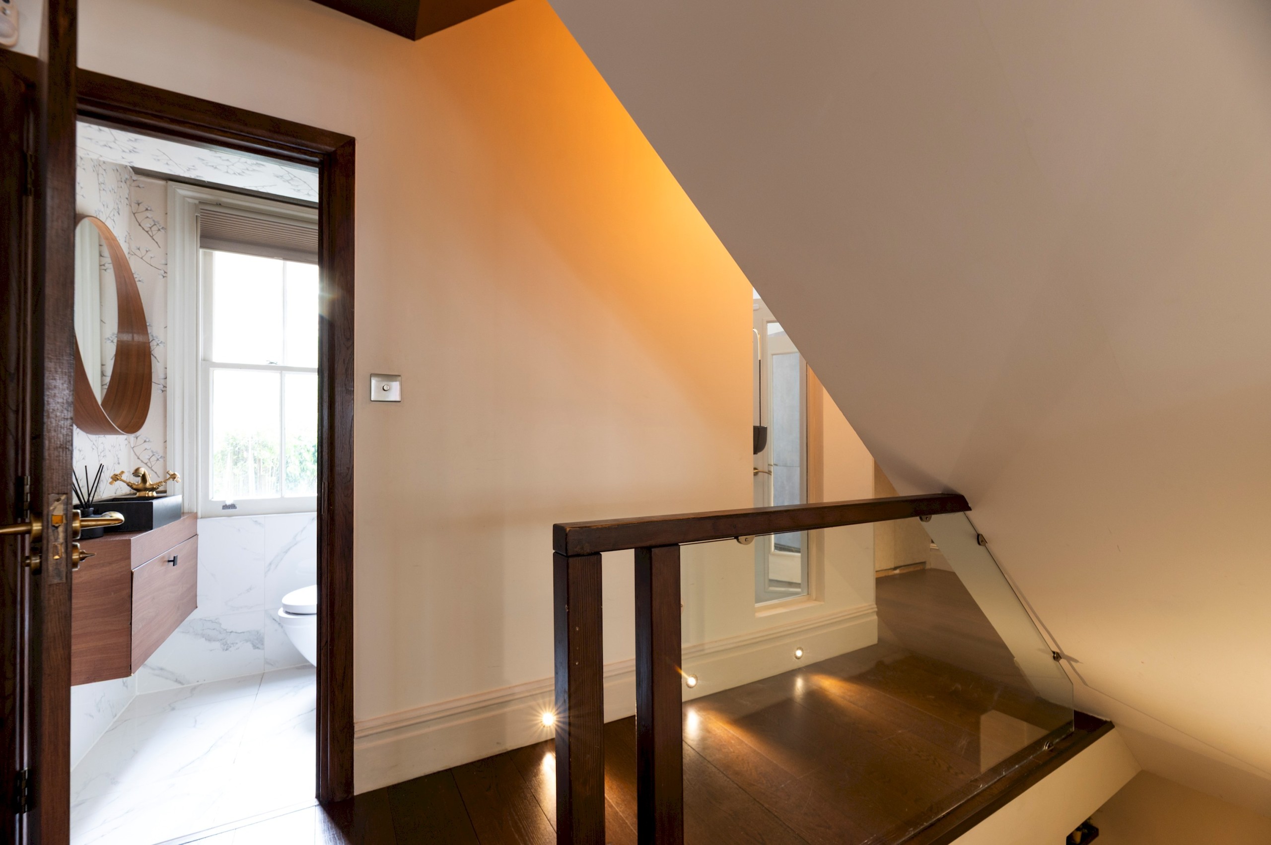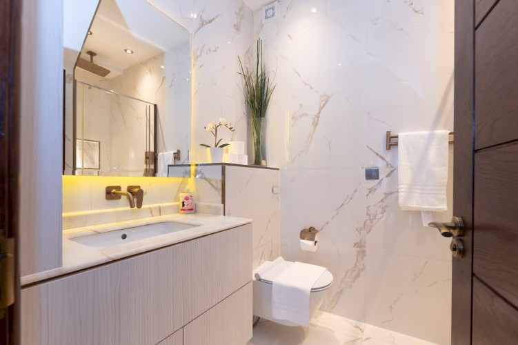 A long, well-lit hallway welcomes you in, featuring soft floor lighting, ceiling spotlights, and subtle wall lighting that creates a warm, ambient feel. Off the hallway, you will find a stylish guest WC, complete with a bidet, modern fittings, and natural light