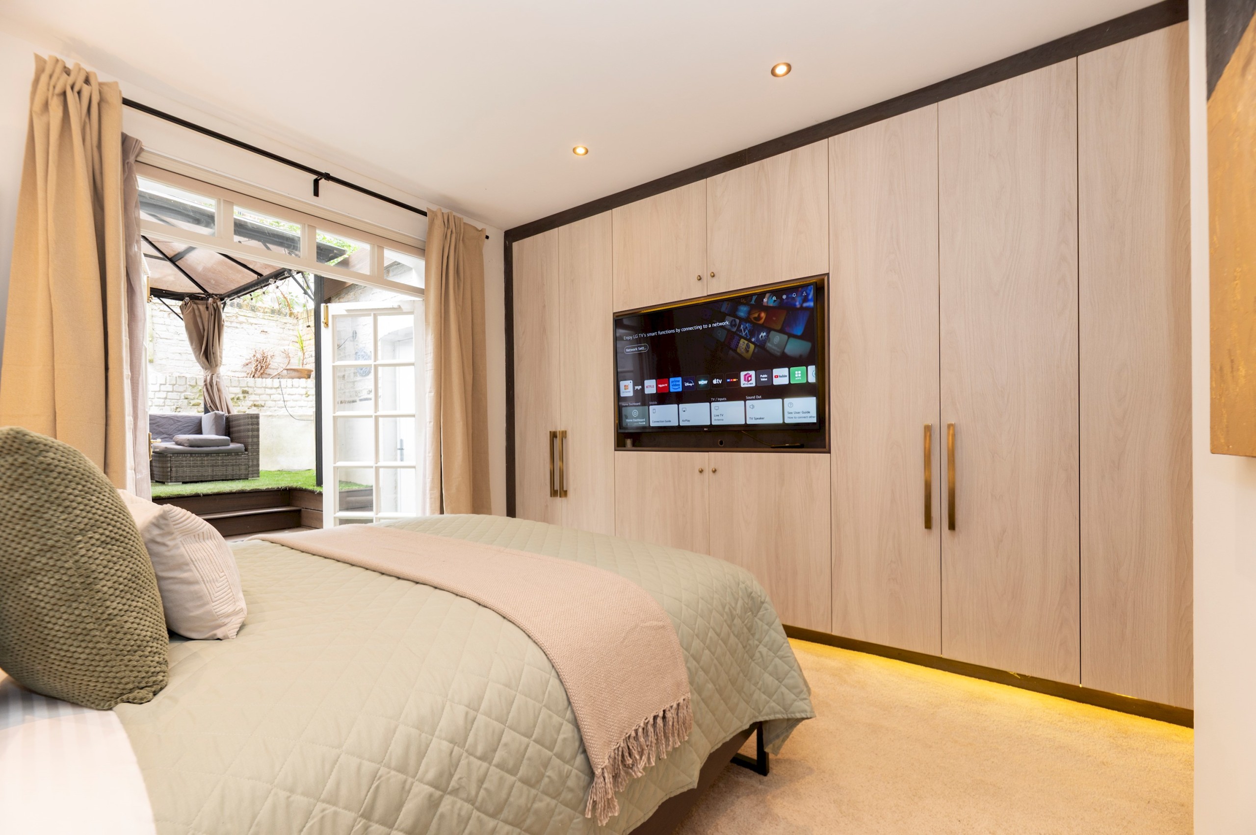 A bright and inviting room with direct access to the private garden. Perfect for guests who enjoy indoor-outdoor living. It also features built-in storage, a TV, and a sleek en-suite bathroom