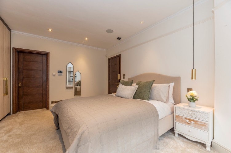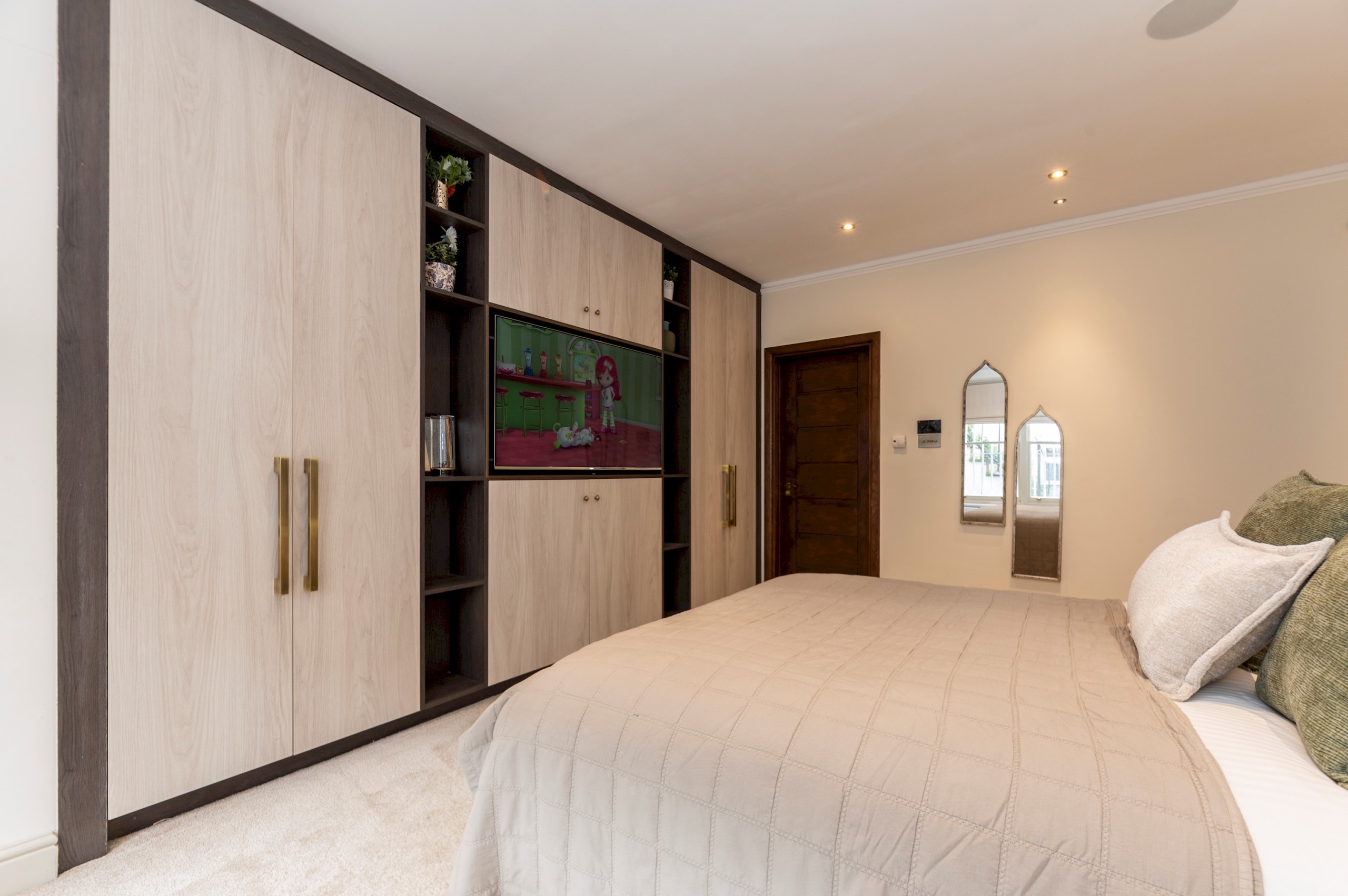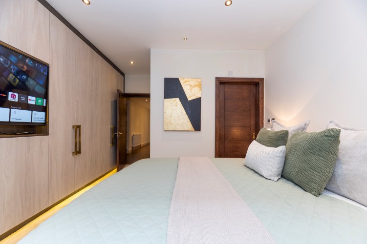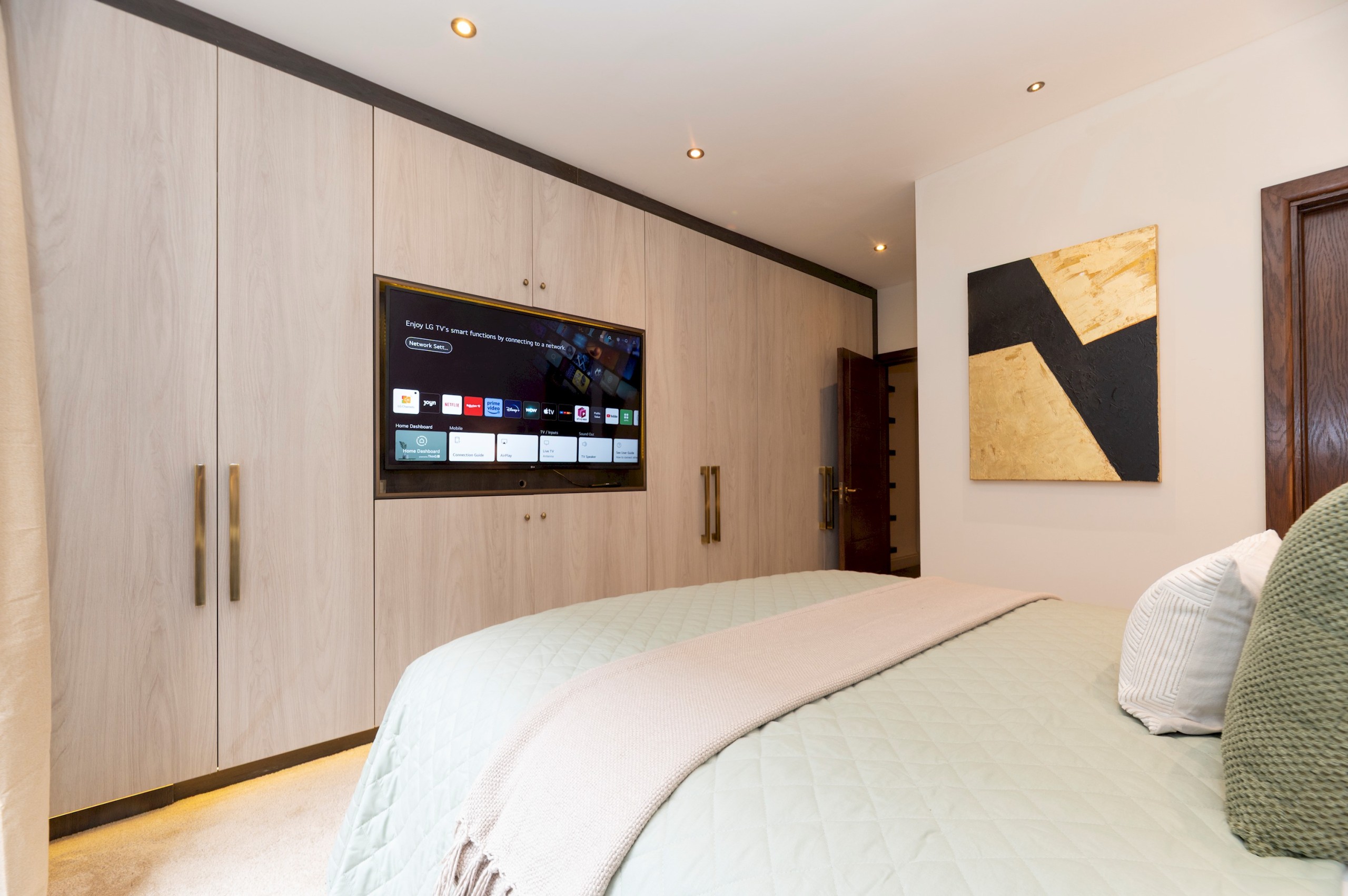 A spacious and elegant suite with a large bed, built-in wardrobes, ceiling speakers, and a dedicated makeup area. The en-suite bathroom is finished to a high standard with a walk-in shower and modern fittings
