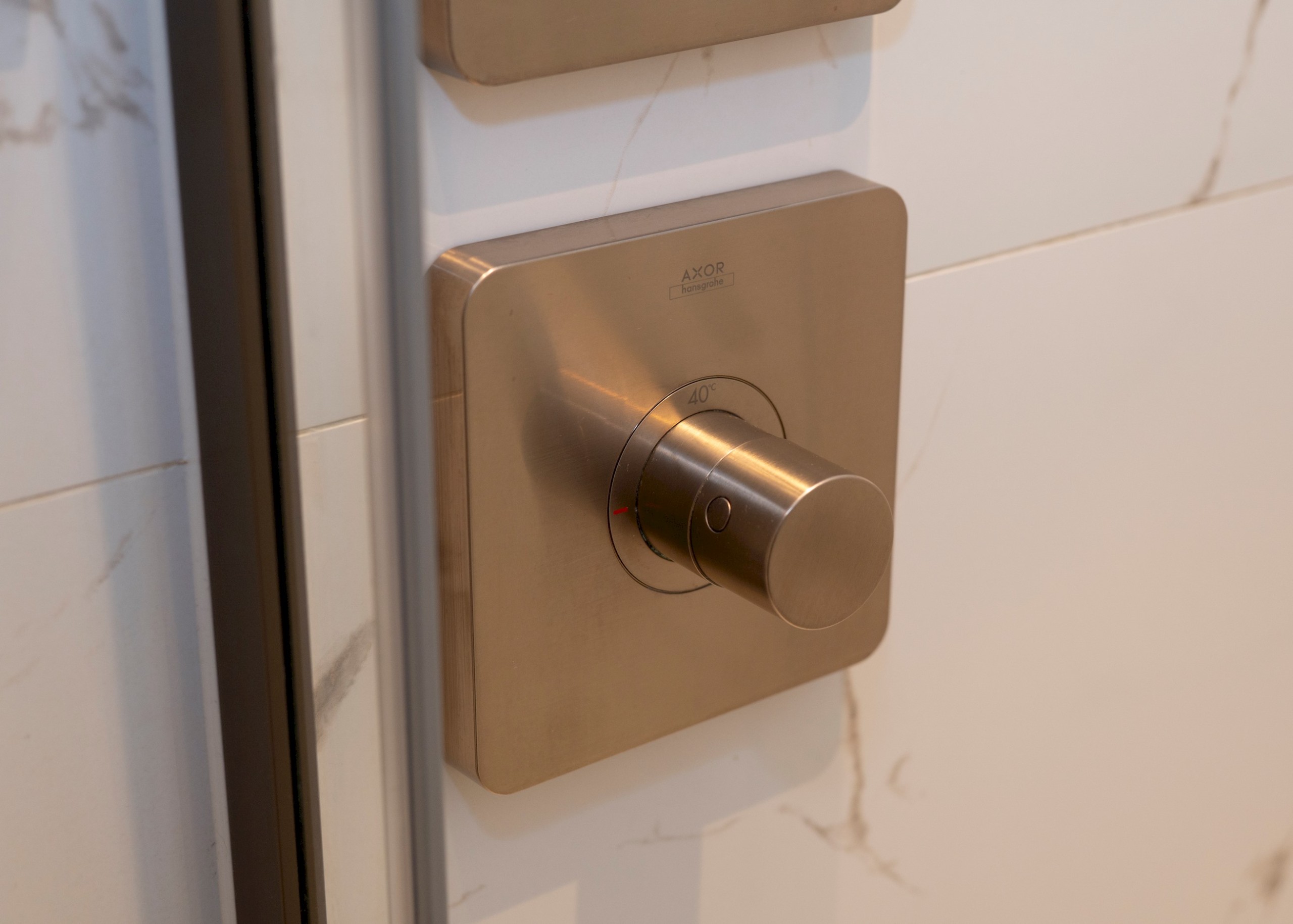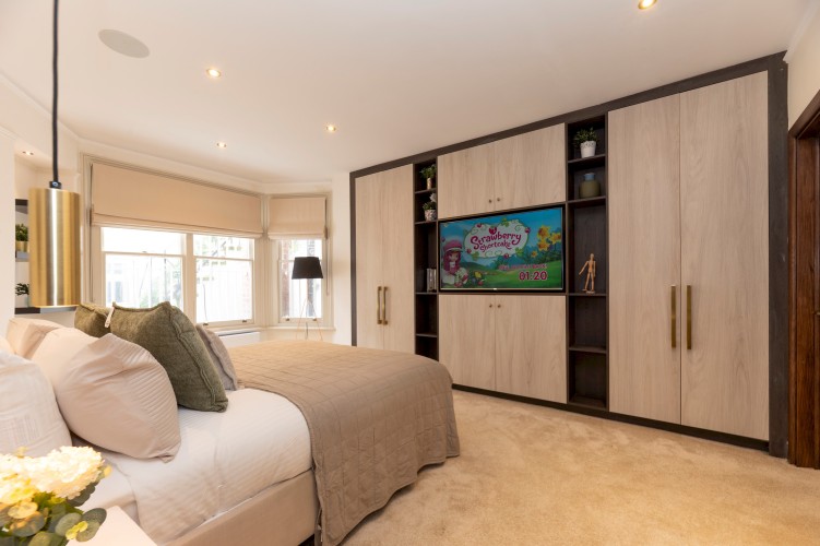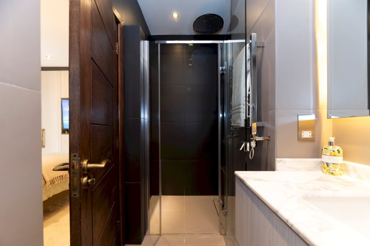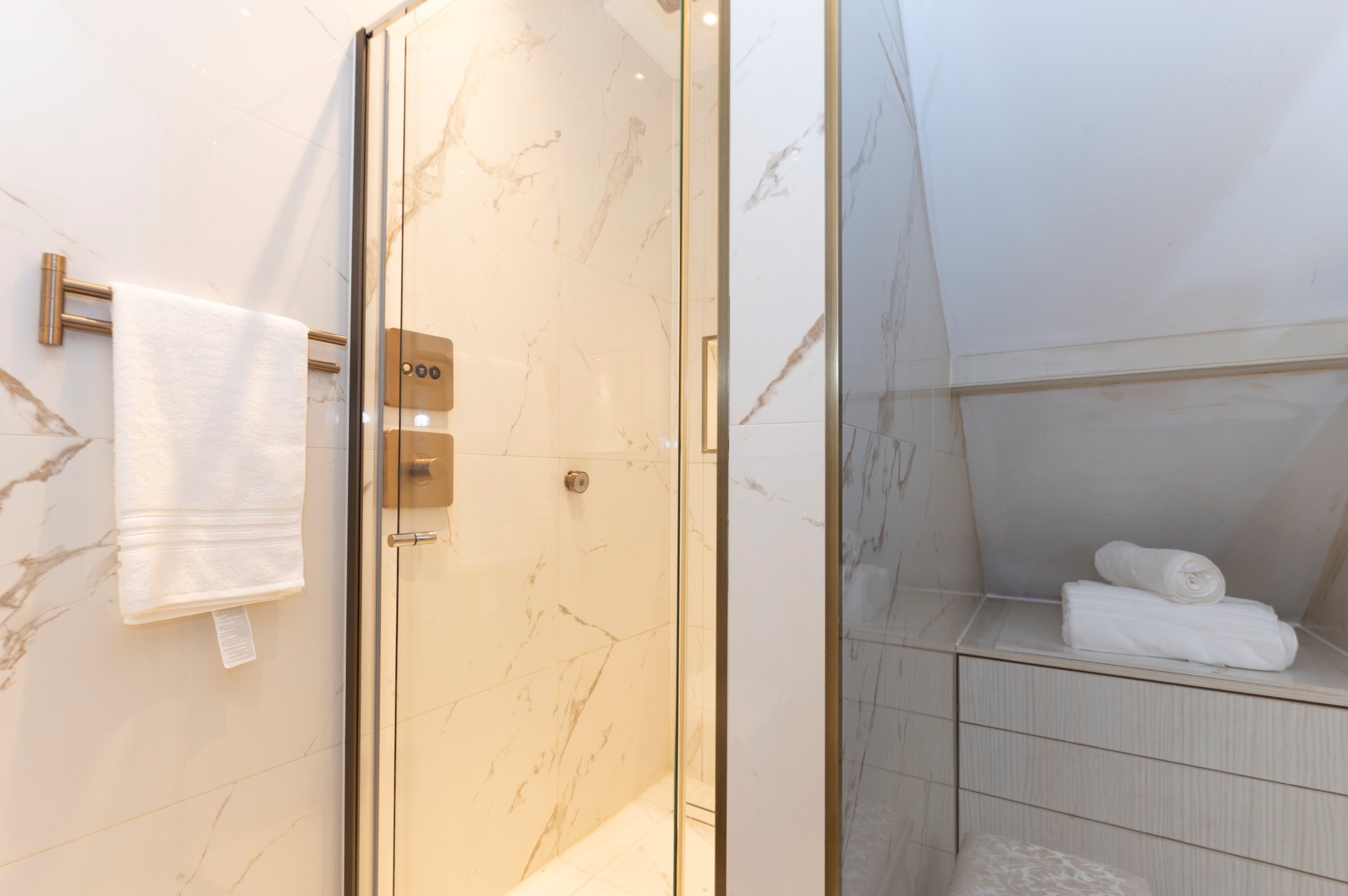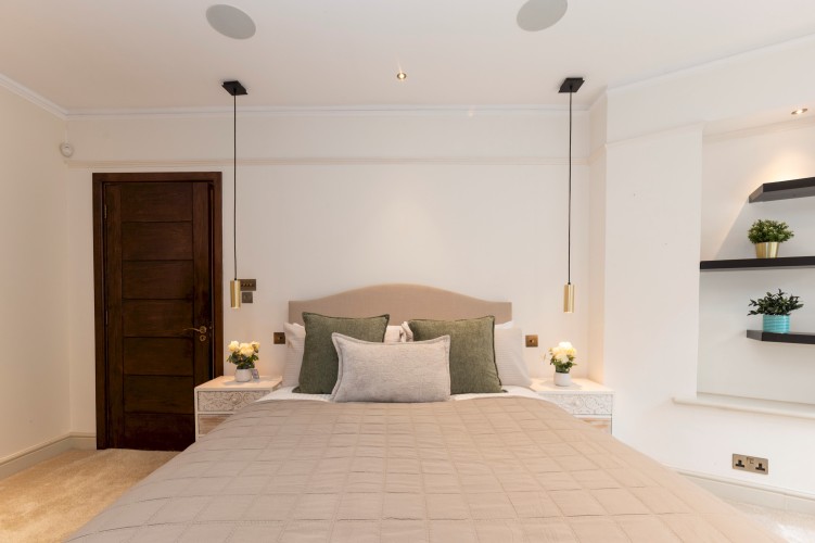 A spacious and elegant suite with a large bed, built-in wardrobes, ceiling speakers, and a dedicated makeup area. The en-suite bathroom is finished to a high standard with a walk-in shower and modern fittings