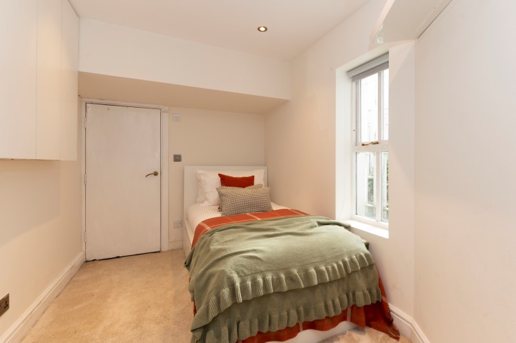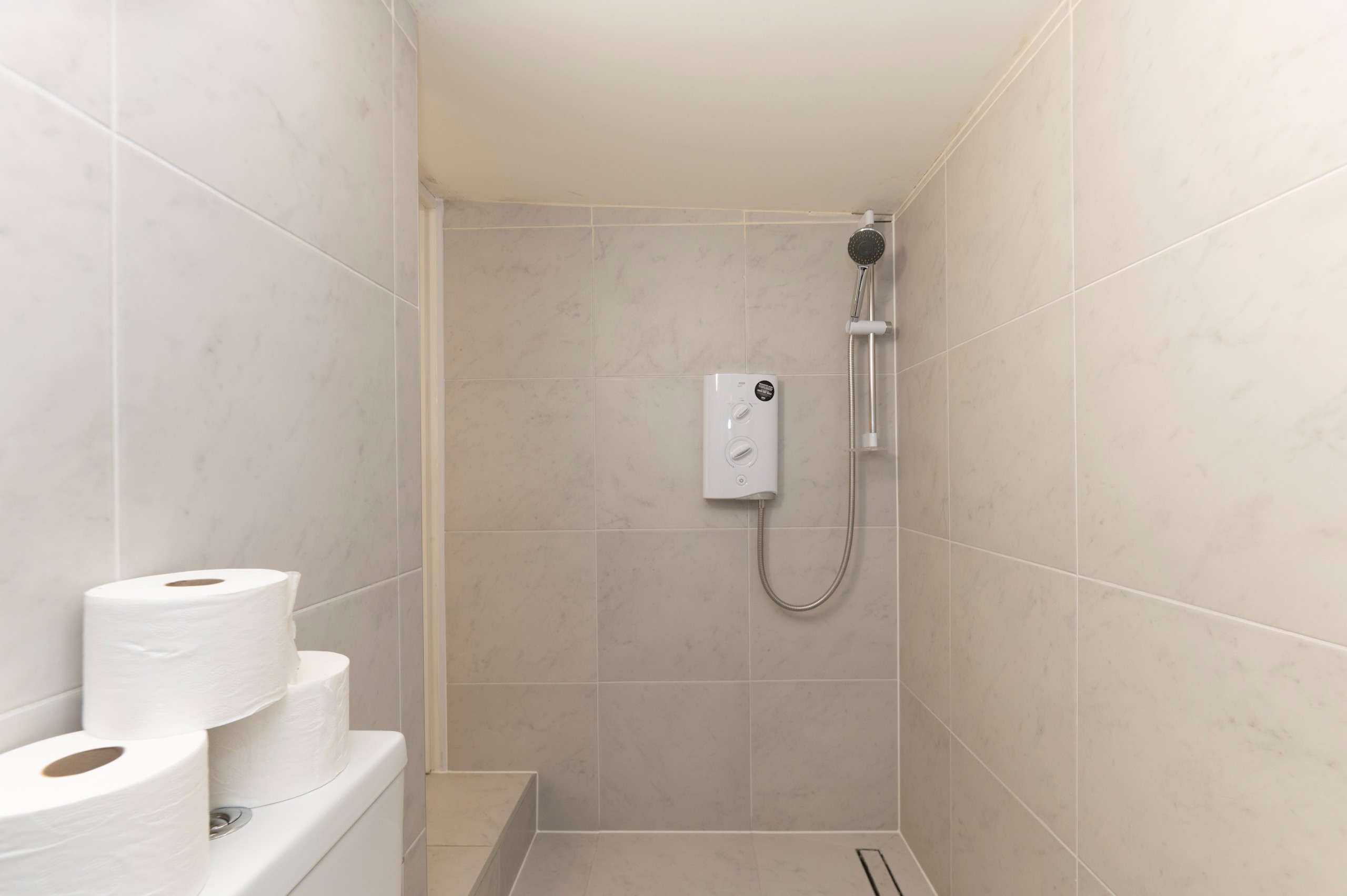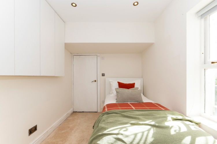A cosy and practical room with a small double bed, ideal for a single guest, child, or additional adult. It is supported by a modern bathroom with a walk-in shower
