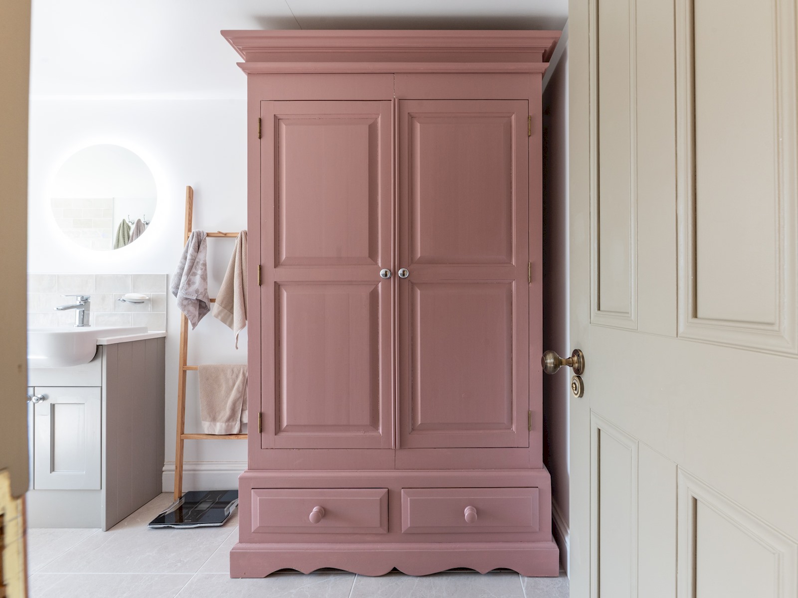 🛏 King bed w/ blush pink panelled wall + wardrobes