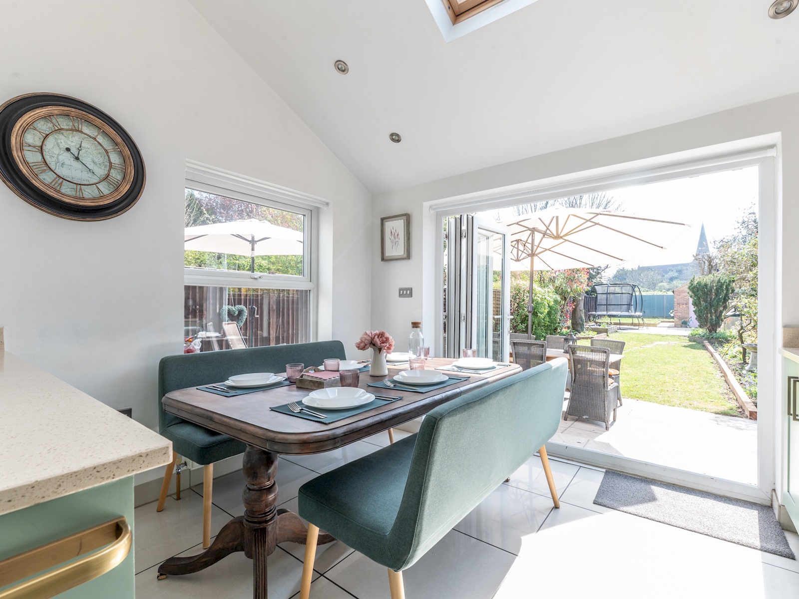 Sleeps 9 in 5 beautiful bedrooms 🛏, with 3 modern bathrooms 🛁 and a bright, fully equipped kitchen 🍳 opening onto the patio via elegant bi-fold doors. Great for family getaways, group retreats, or long stays!