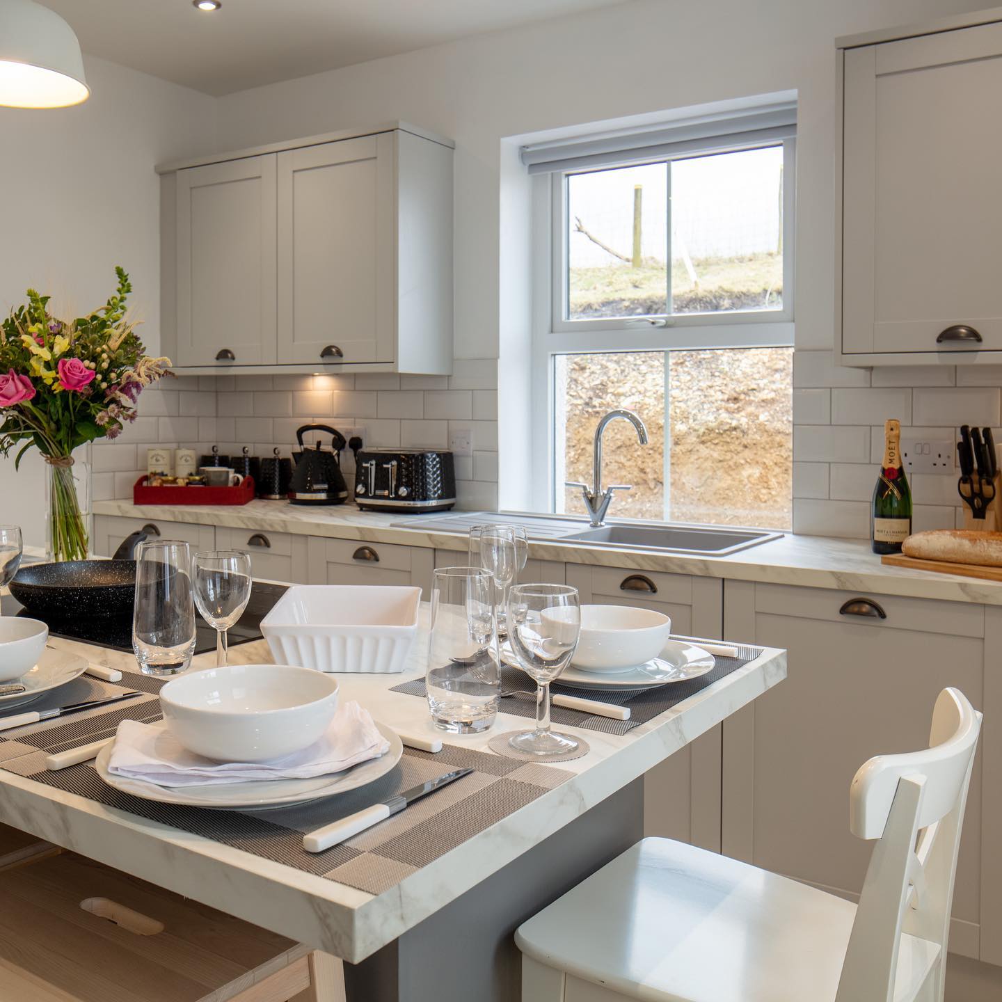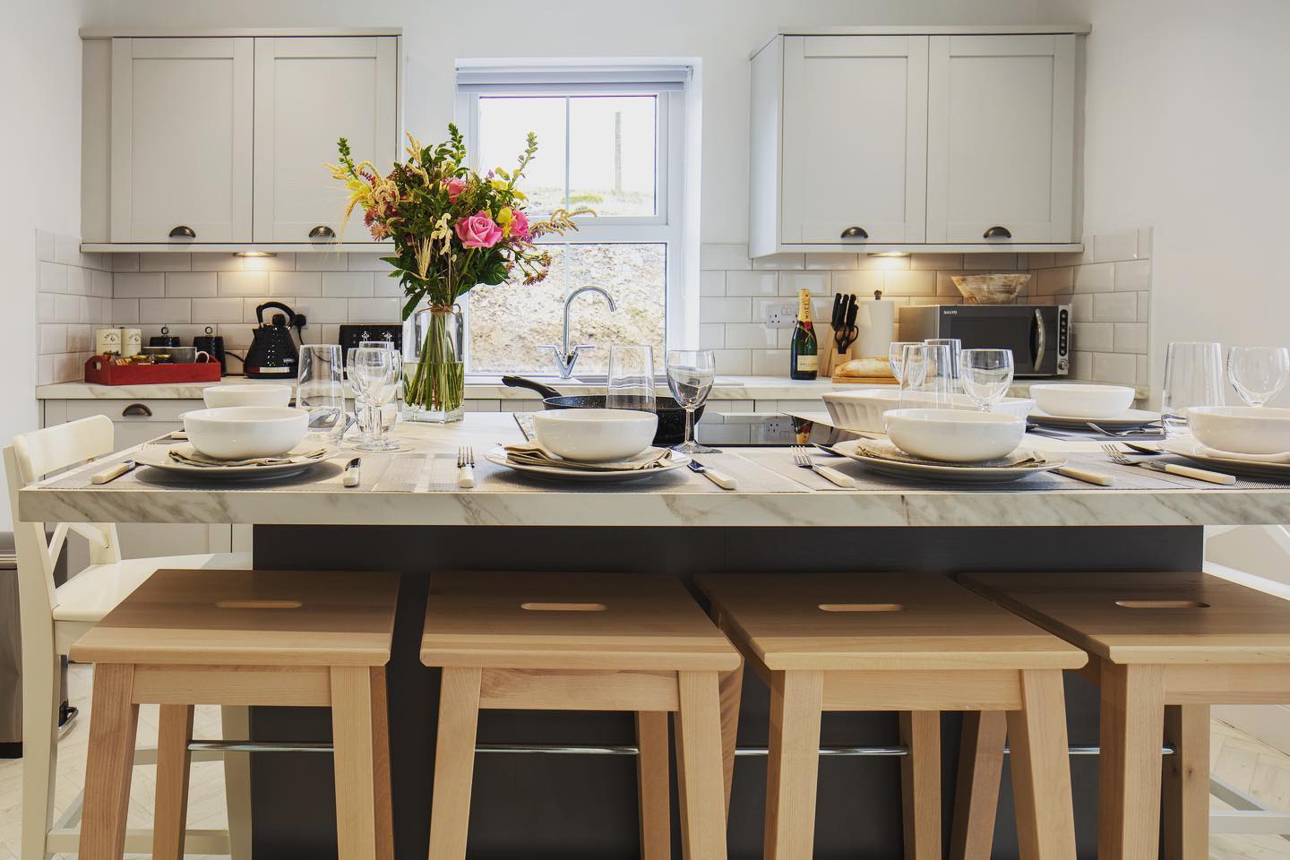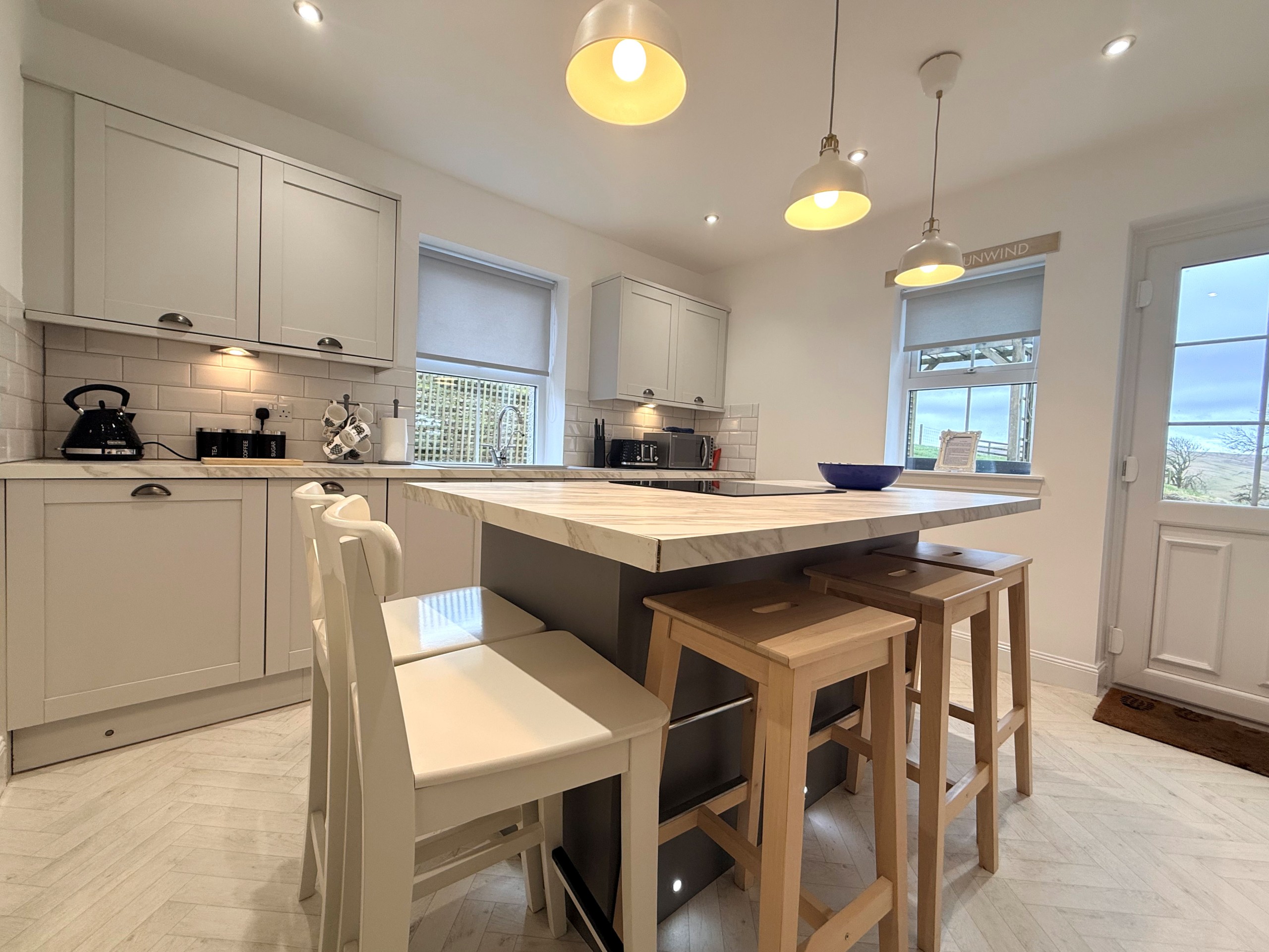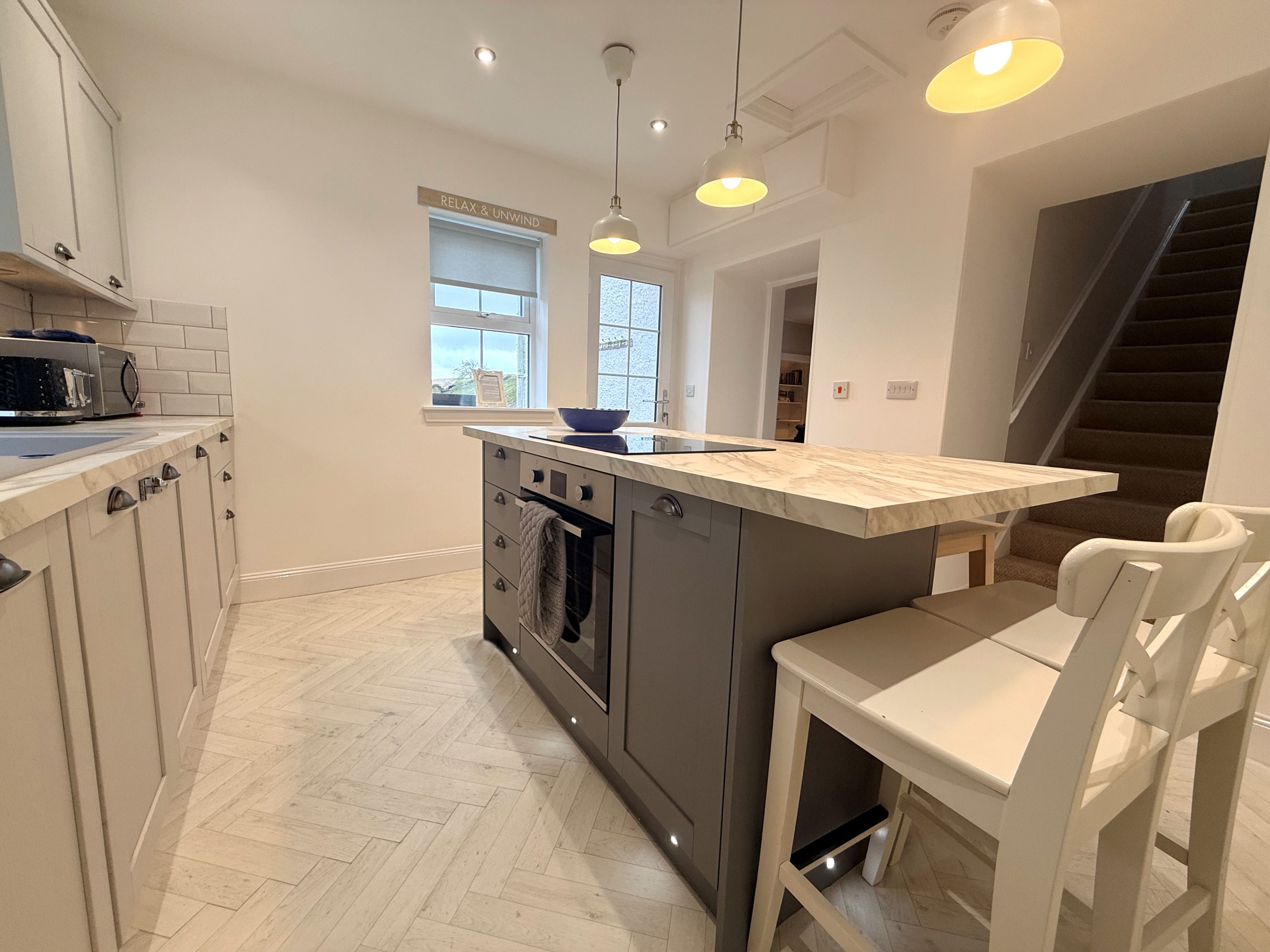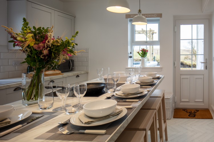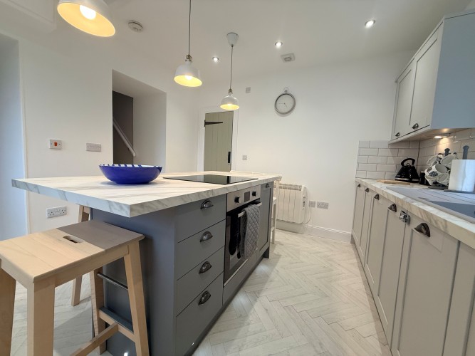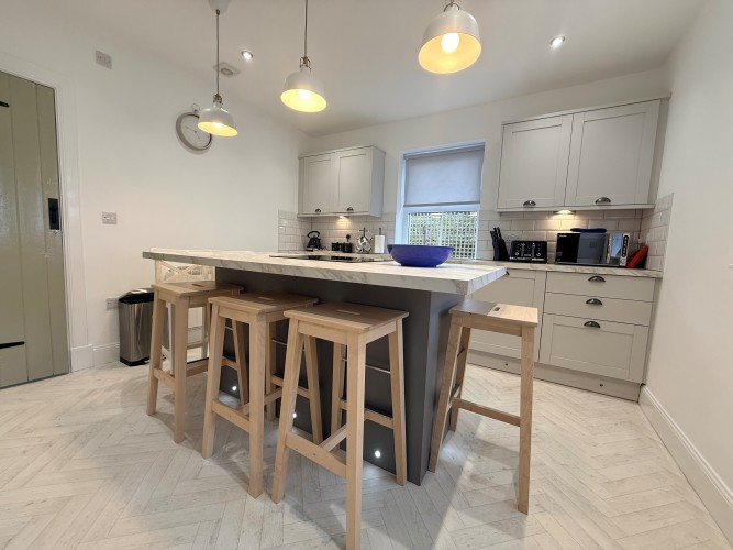 The modern, fully equipped kitchen makes preparing anything from a light lunch to a full evening feast a pleasure with the central island providing a cosy, social space for dining and gathering with friends or family.
