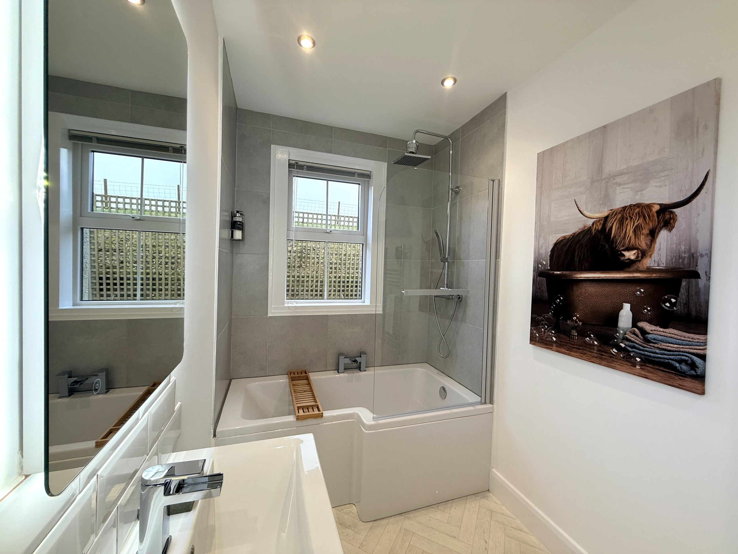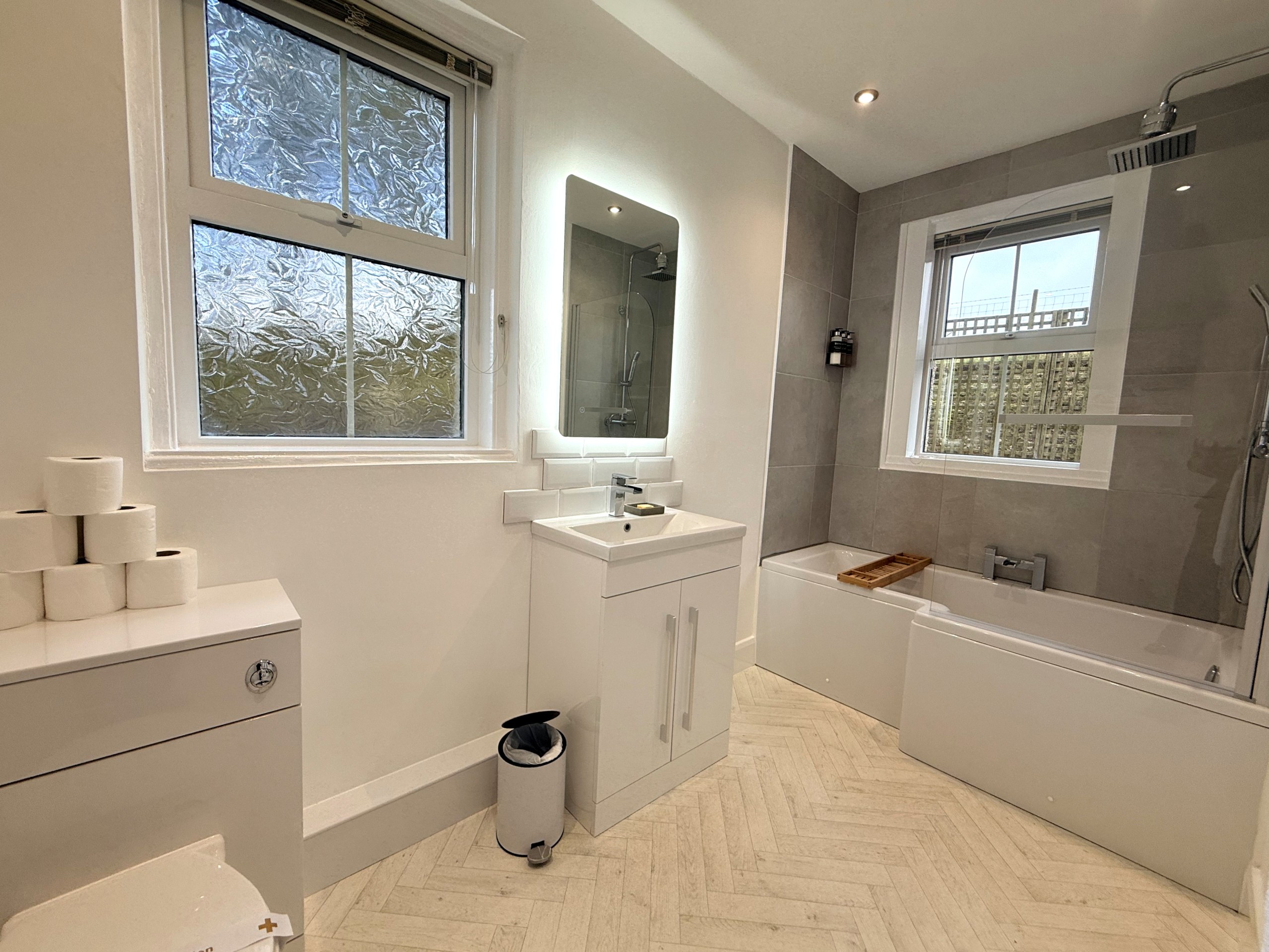 The spacious bathroom has been decorated with relaxation in mind, with LED backlit mirror, L-shaped bath, heated towel rail, and refreshing shower, this is the perfect environment for relaxing or starting your day refreshed.