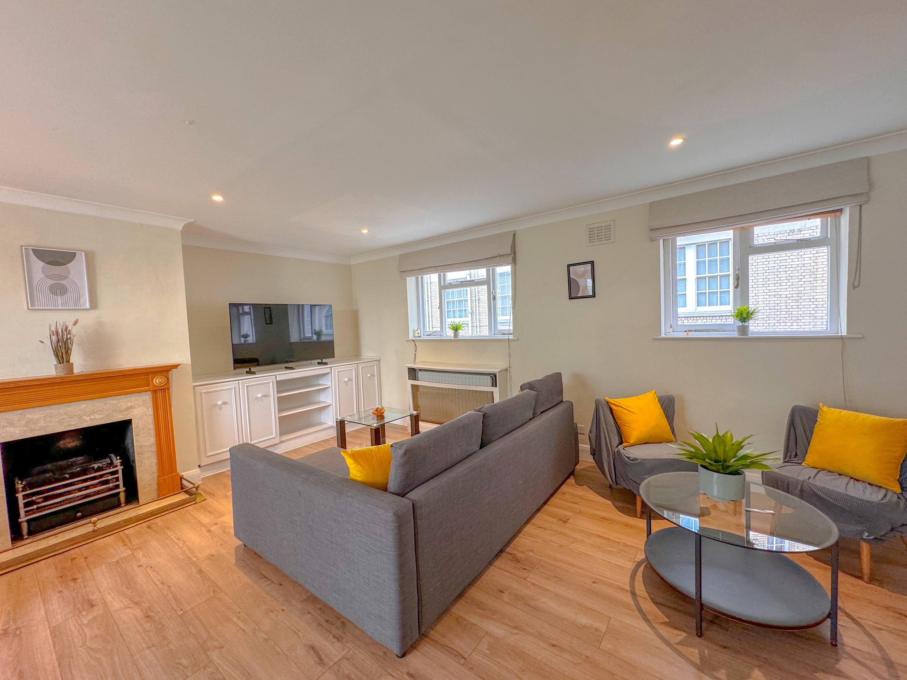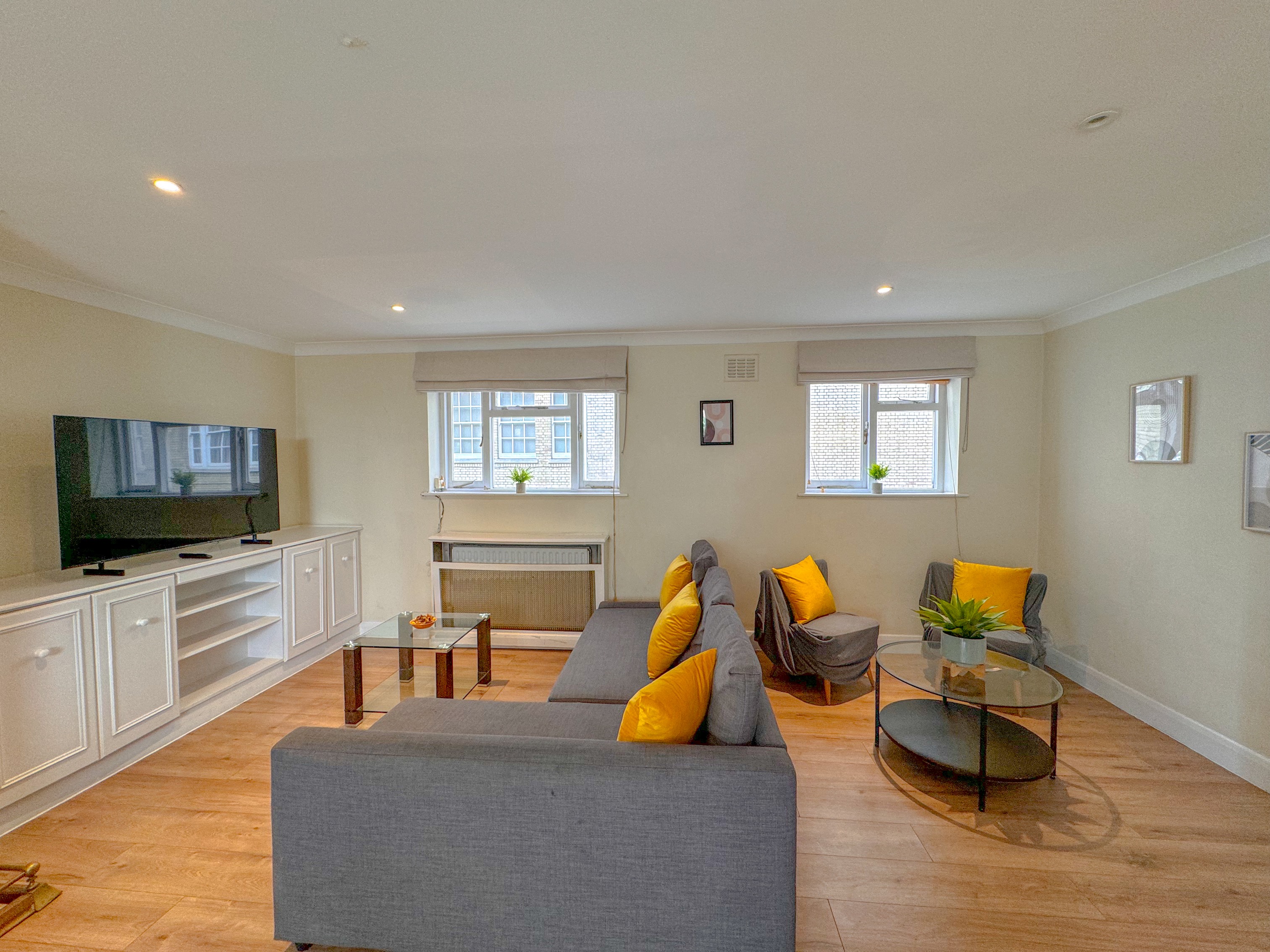 Living Room: A large, inviting living area with cosy seating, a flat-screen TV, and plenty of natural light—ideal for relaxing or entertaining.