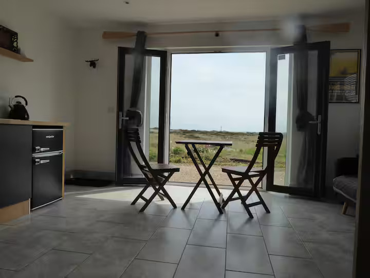 Delightful, cosy holiday cabin on the shingle at Dungeness, moments from the sea, with wonderful views. A spacious modern en-suite shower room and separate living room, with small kitchen give you the option to rustle up basic meals, and a generous comfy kingsize bed (twin beds option) awaits you. There is a sofa bed for another guest/child. Spectacular views of the two lighthouses across the shingle towards the sea and only moments from one of the best pub restaurants around, The Pilot Inn!.
