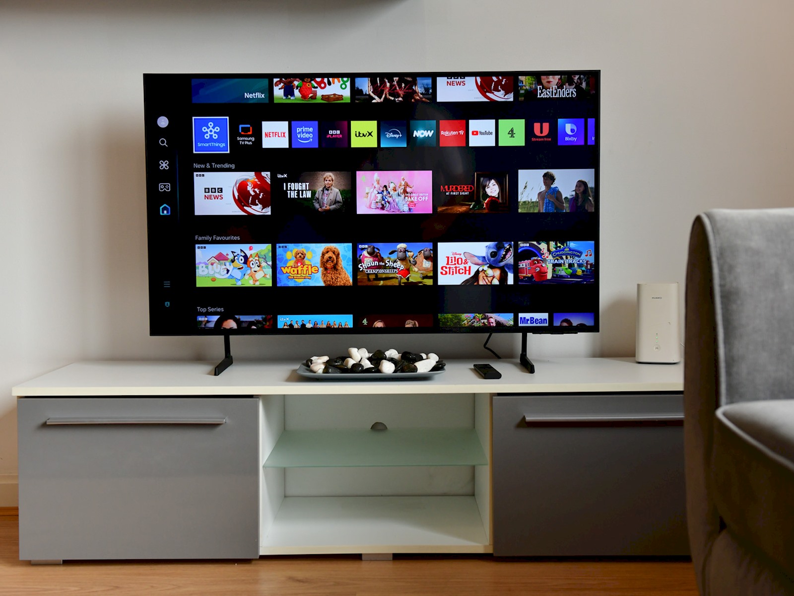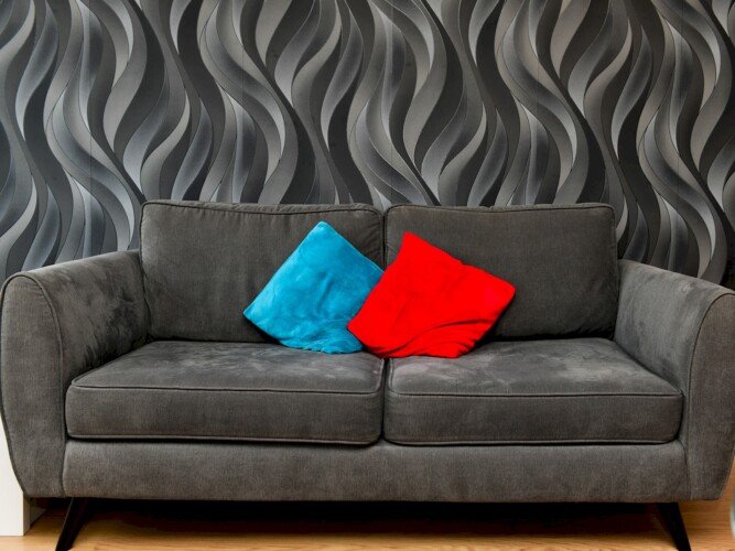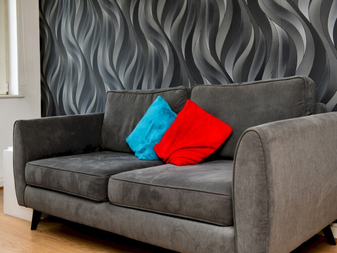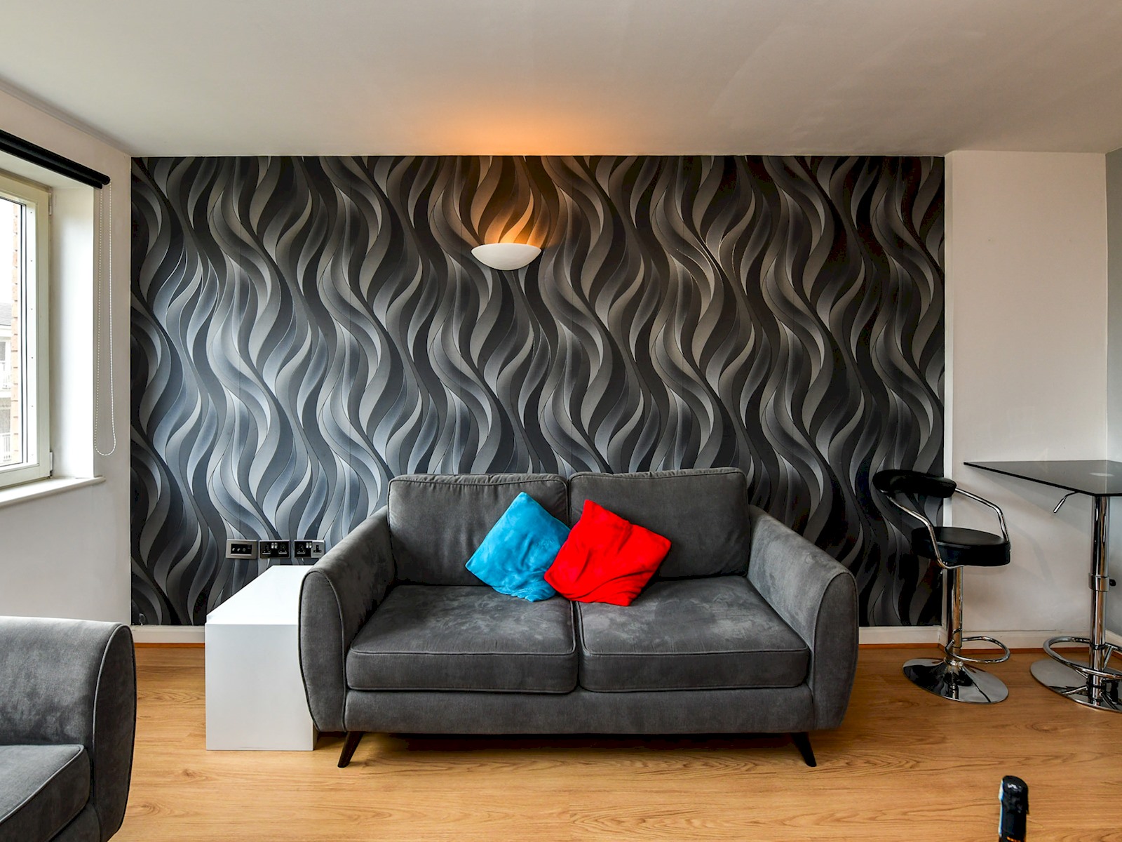 🛋 Stylish Living Room – Modern open-plan space with comfy grey sofas, bold feature wall, Smart TV, and plenty of natural light