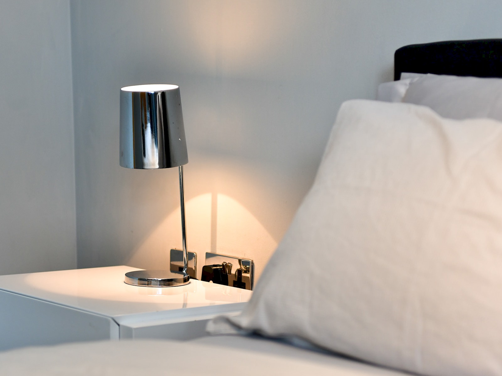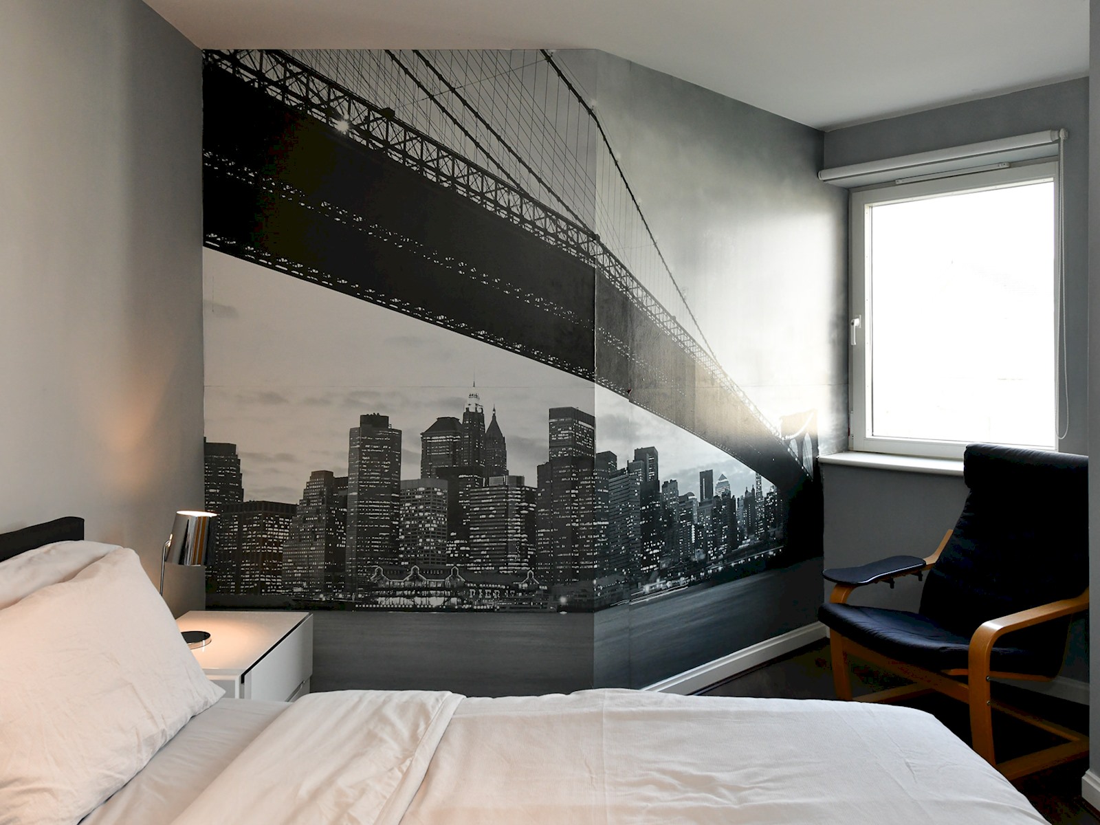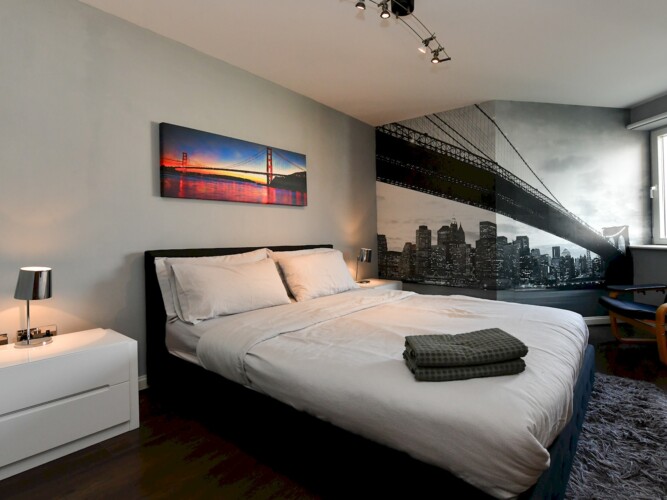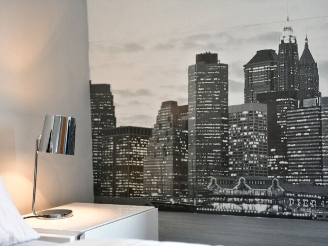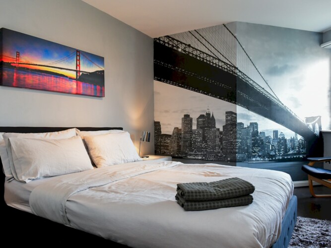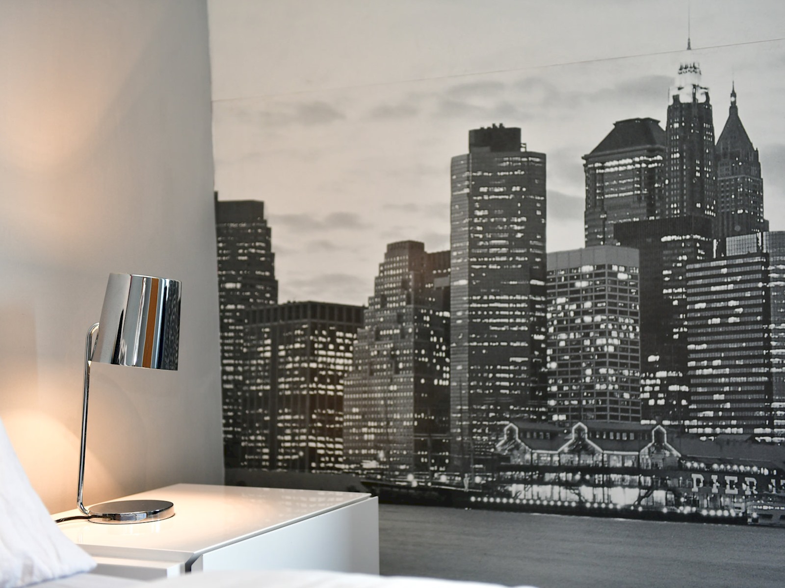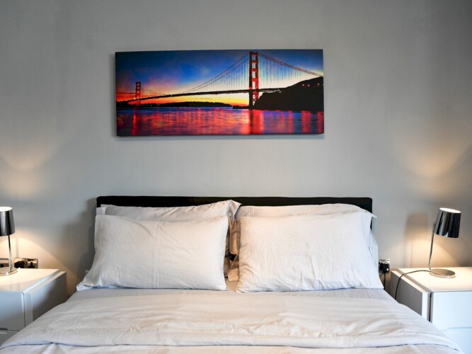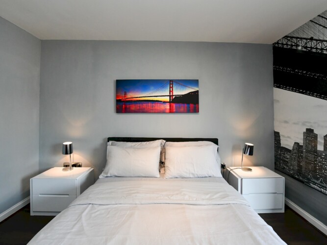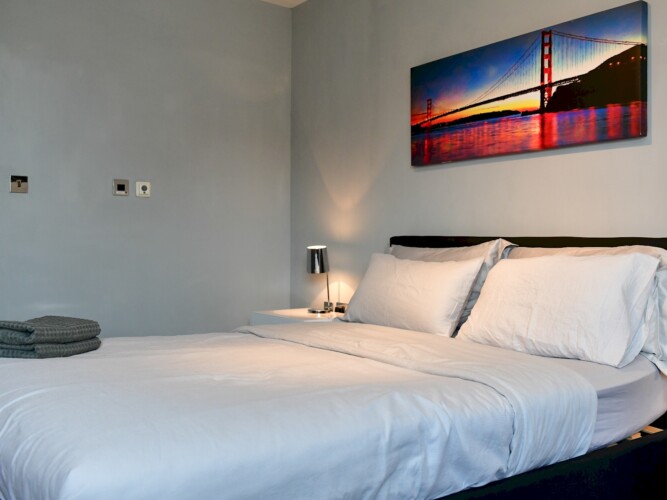 🛏 Inviting Bedroom – Cosy Super King bed with fresh linens, city skyline wall art, and bedside lighting for a restful night’s sleep