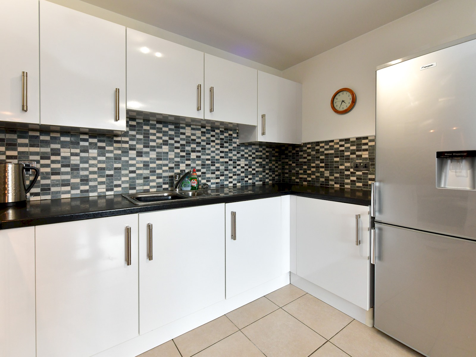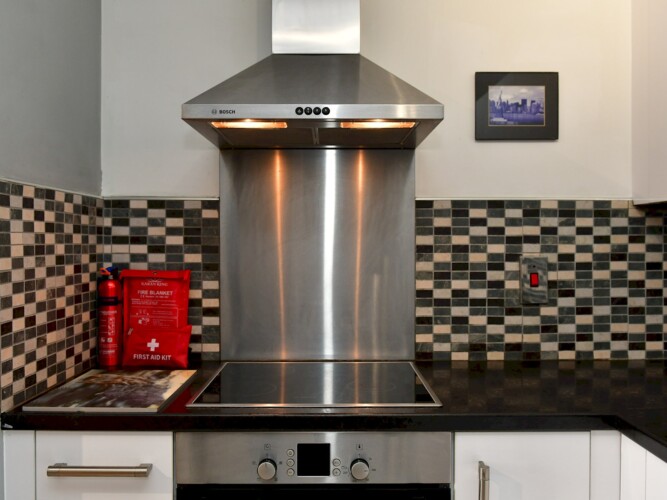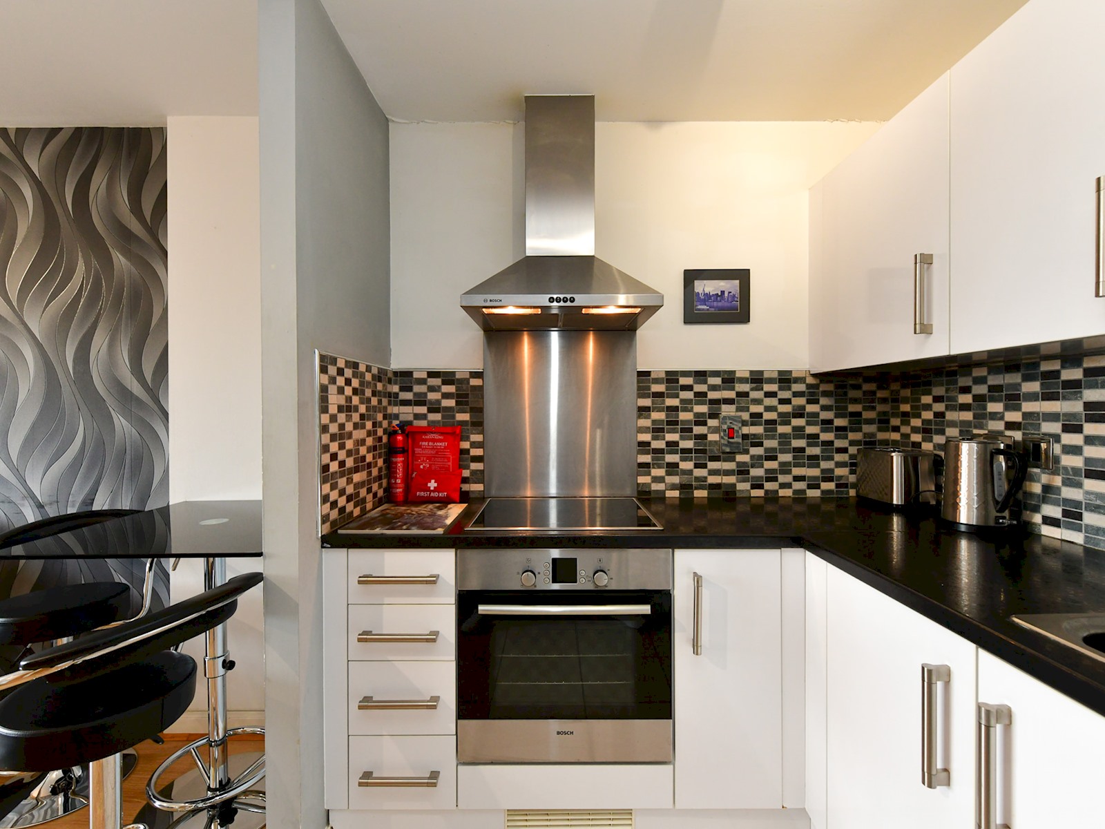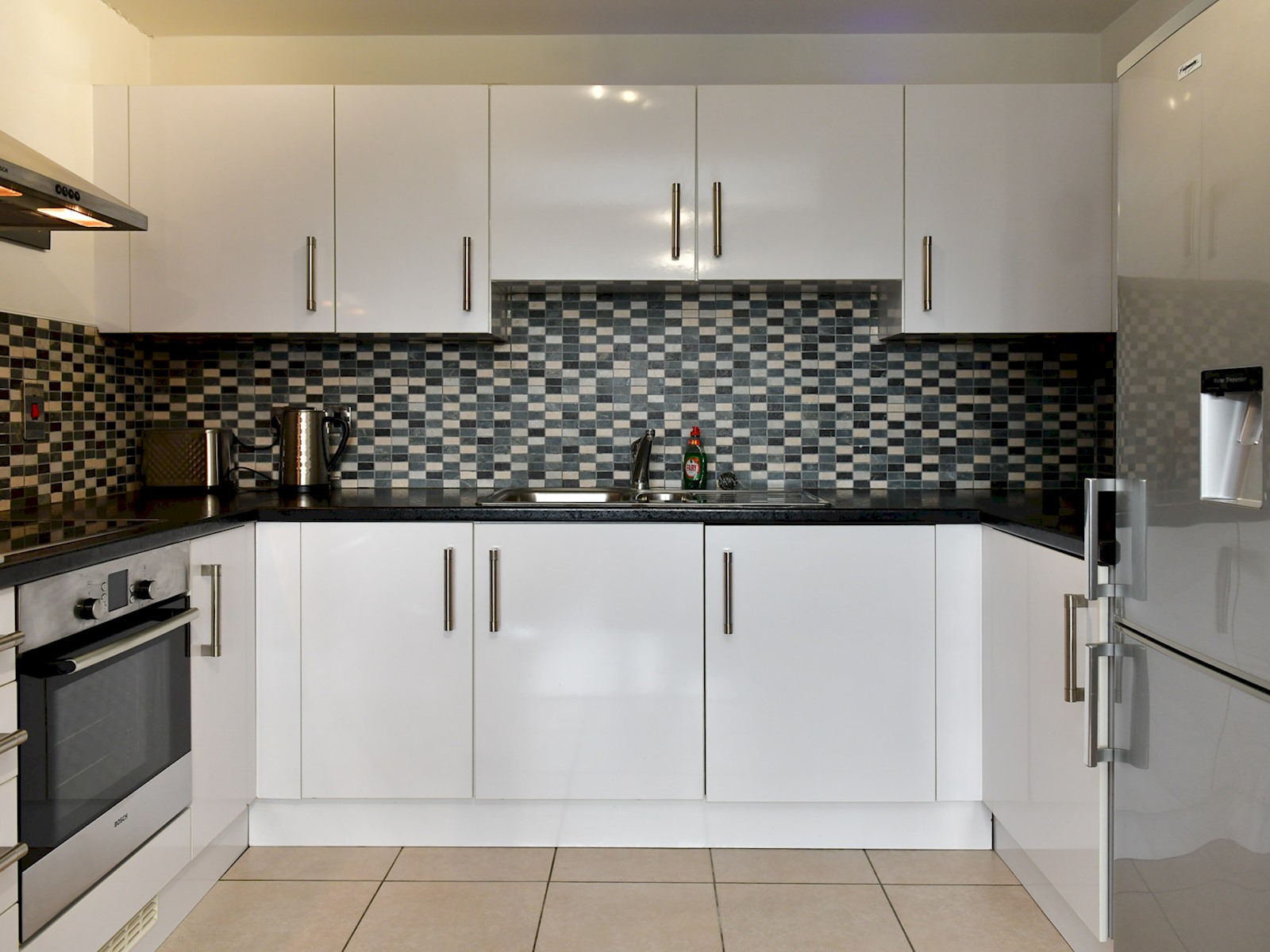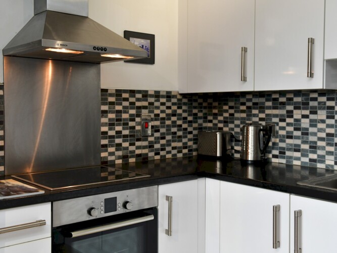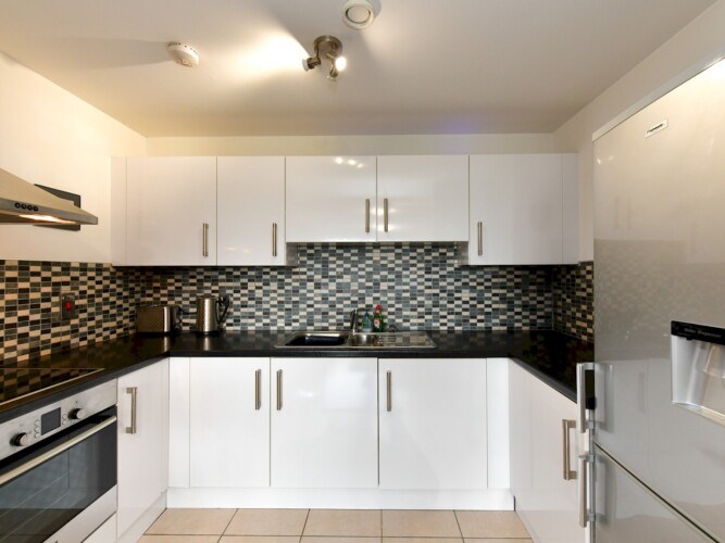 🍽 Fully Equipped Kitchen – Sleek white cabinetry with oven, hob, fridge-freezer, microwave, and all the essentials for cooking at home