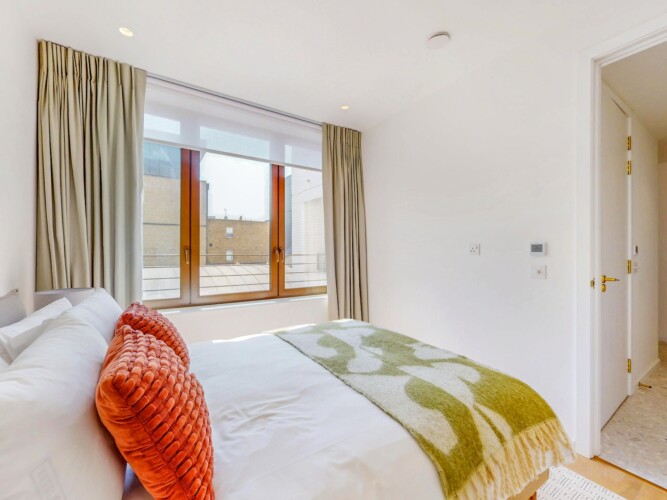 The bedroom is peaceful and understated, with a Juliet balcony, a proper mattress, and blackout blinds so you can truly rest. The bathroom has a large walk-in shower, underfloor heating, and lovely clean finishes — everything you need, nothing fussy.