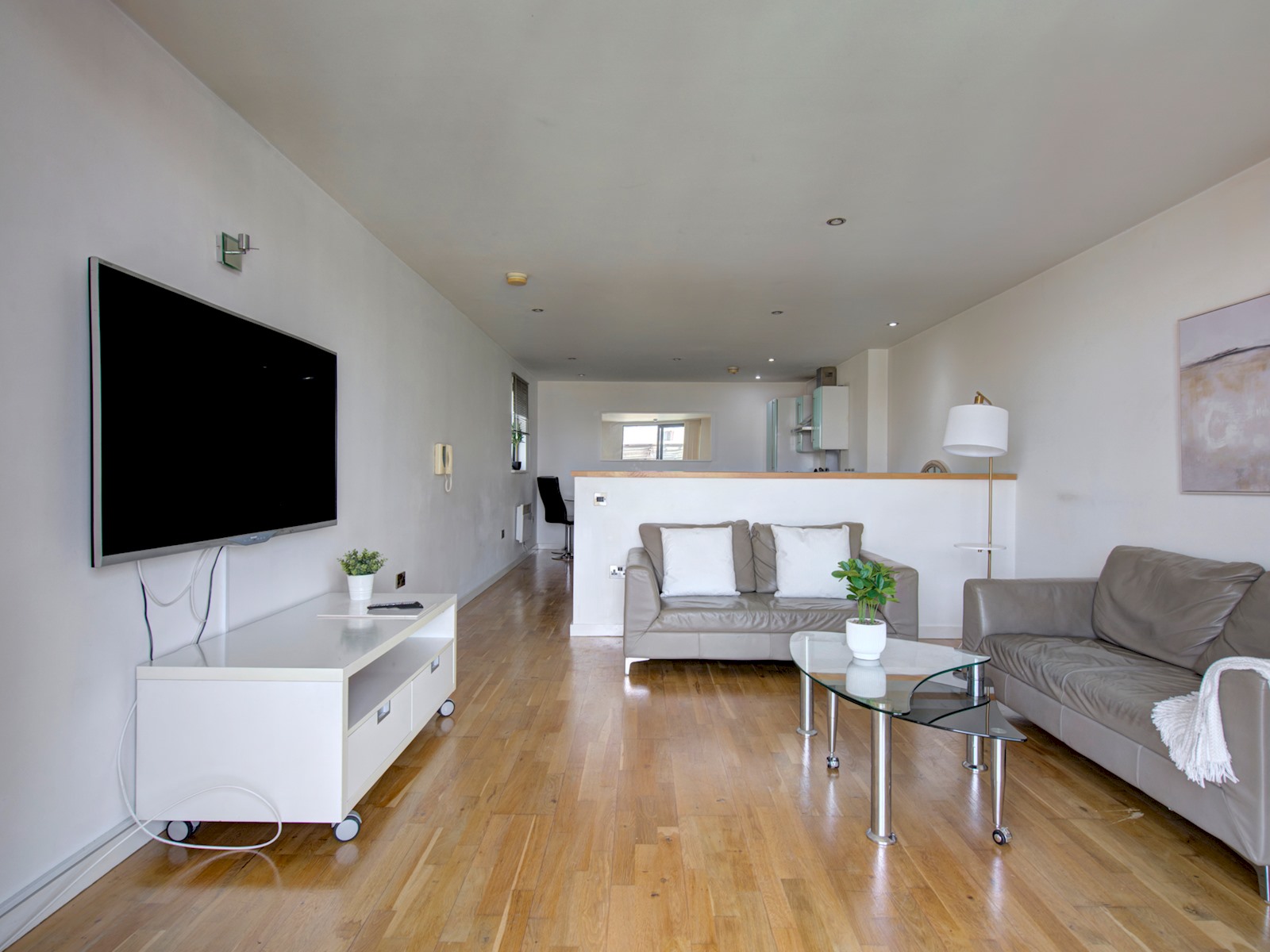 Unwind in the newly furnished open plan living room featuring a comfortable sofa and smart TV. The open living space is well-furnished and perfect for relaxing after a day of exploration in the city.