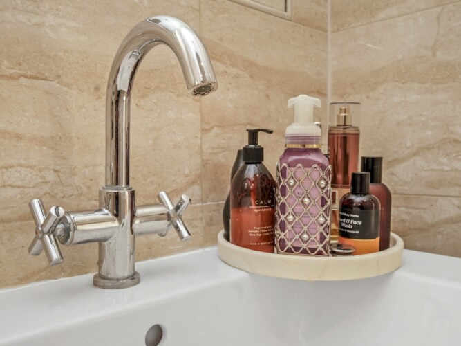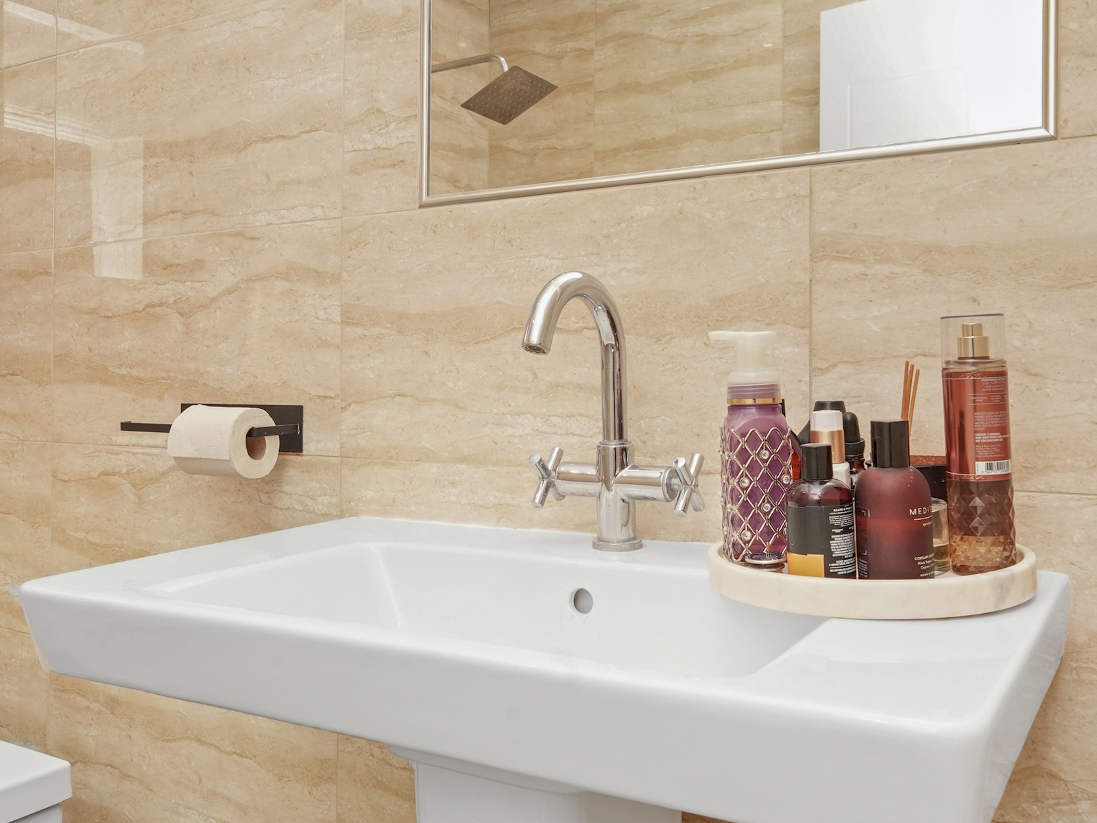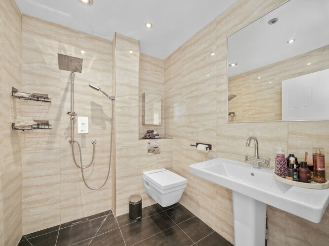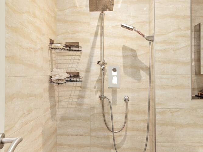 Fresh, modern shower room with rainfall shower, sleek tiling, and space to get ready for your day or unwind in the evening.
