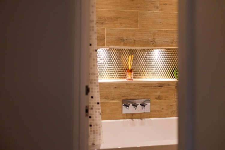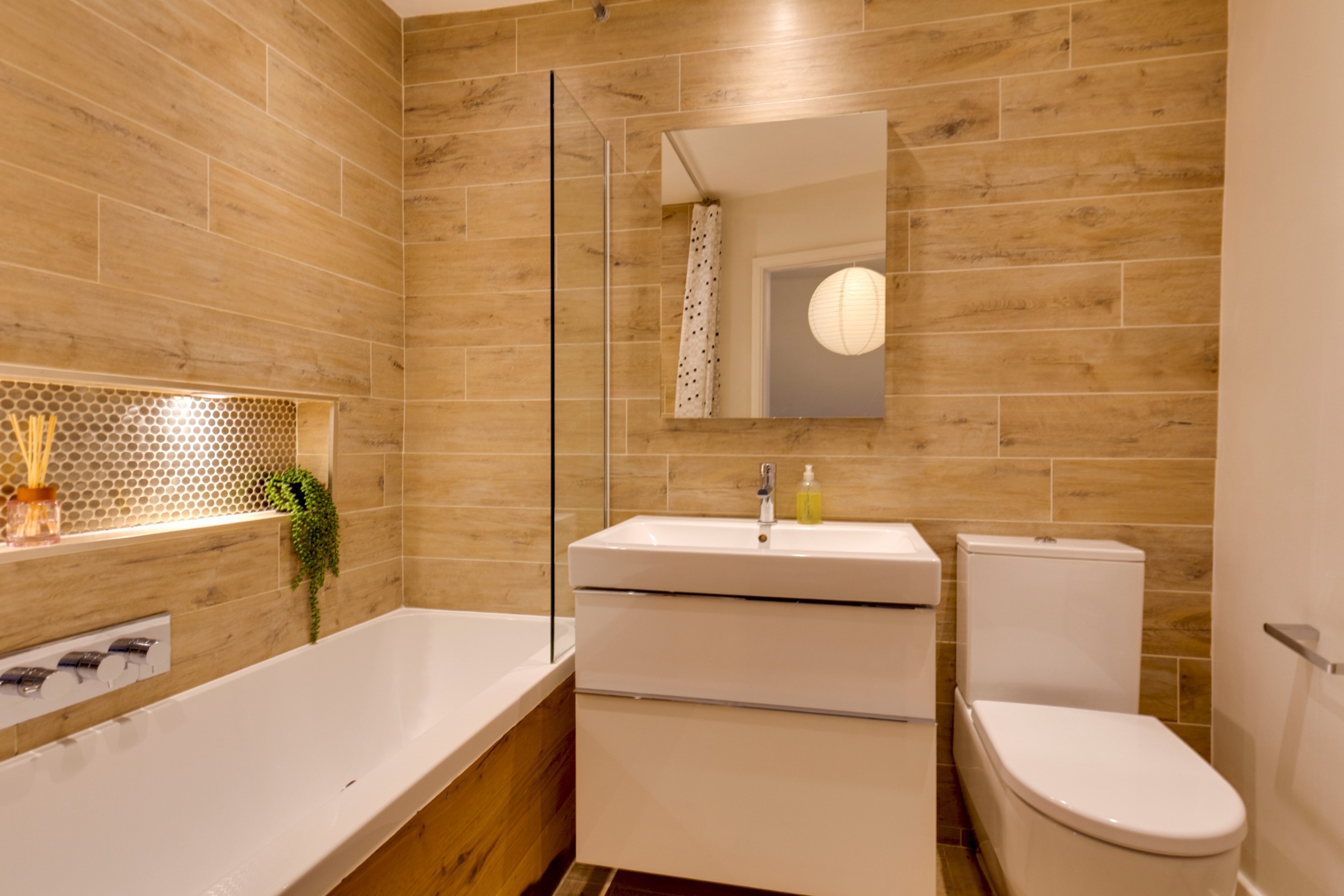 Main bathroom with bath and shower. Built-in cupboards with hanging space and shelves are also available.