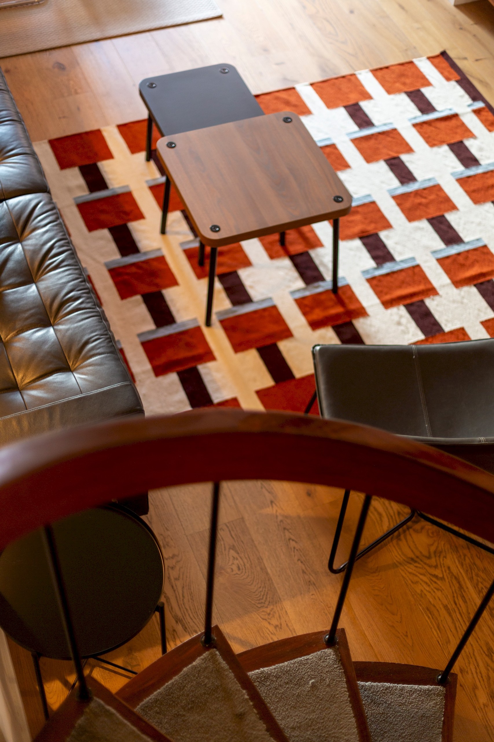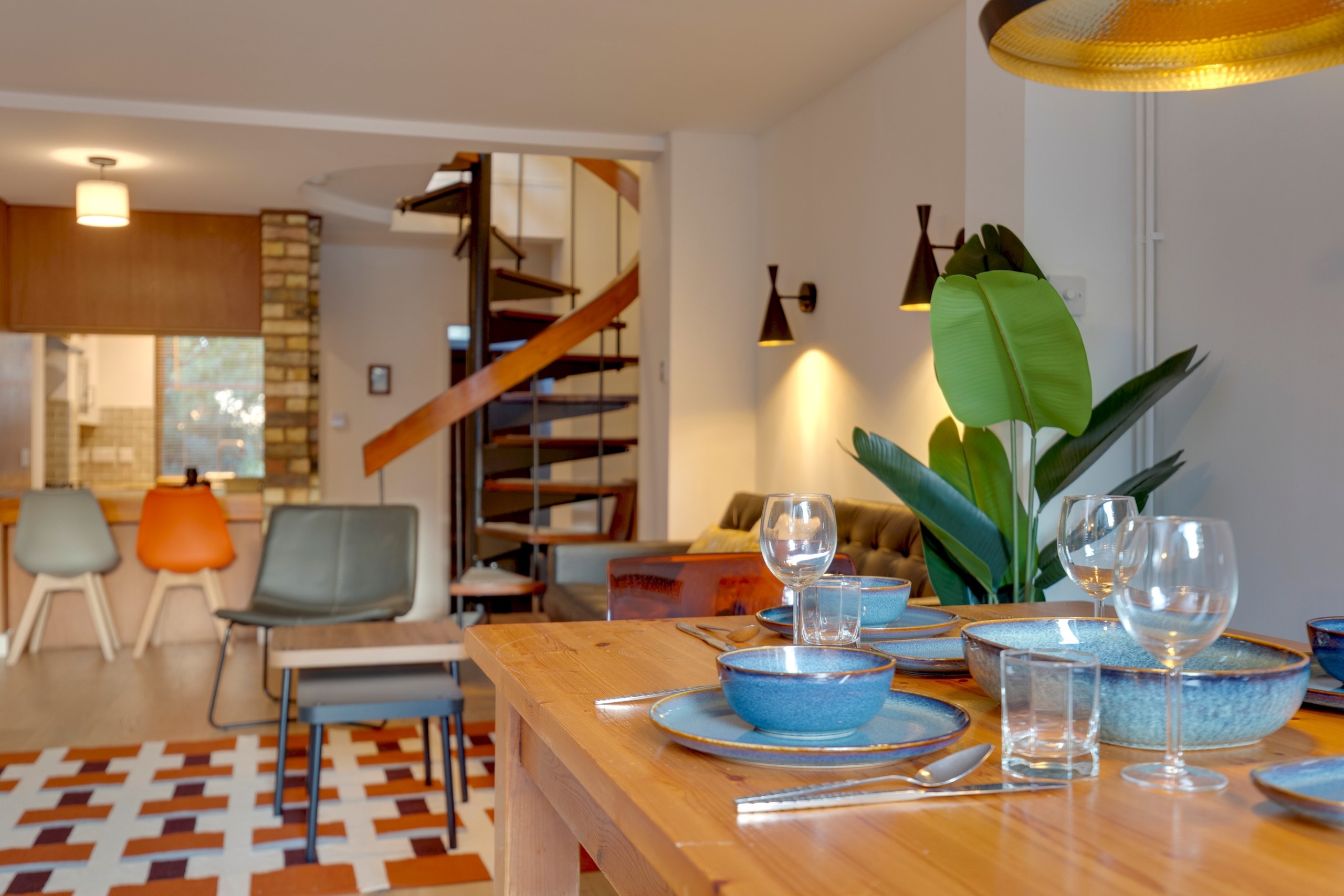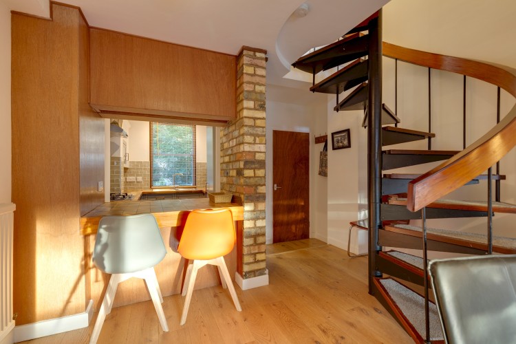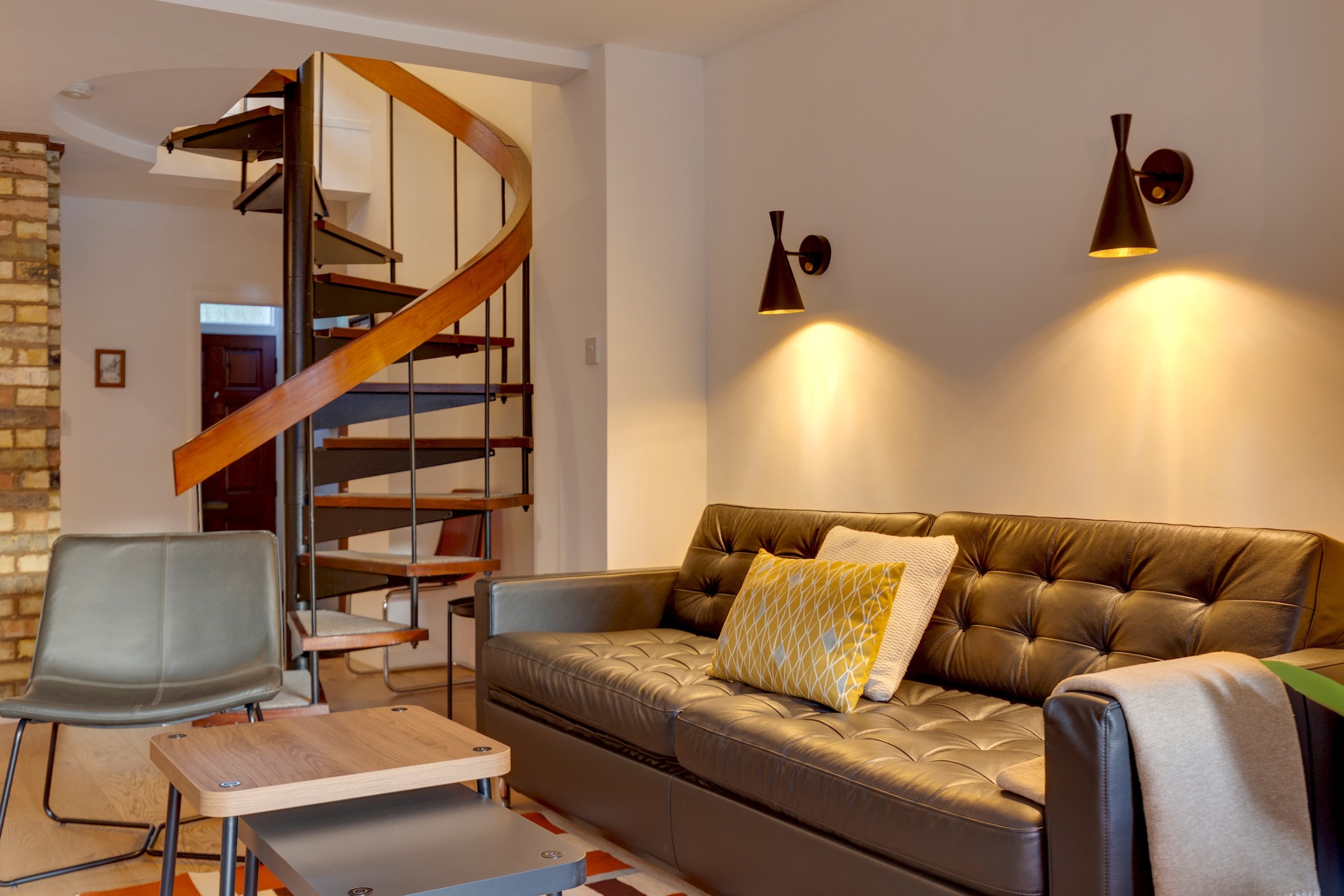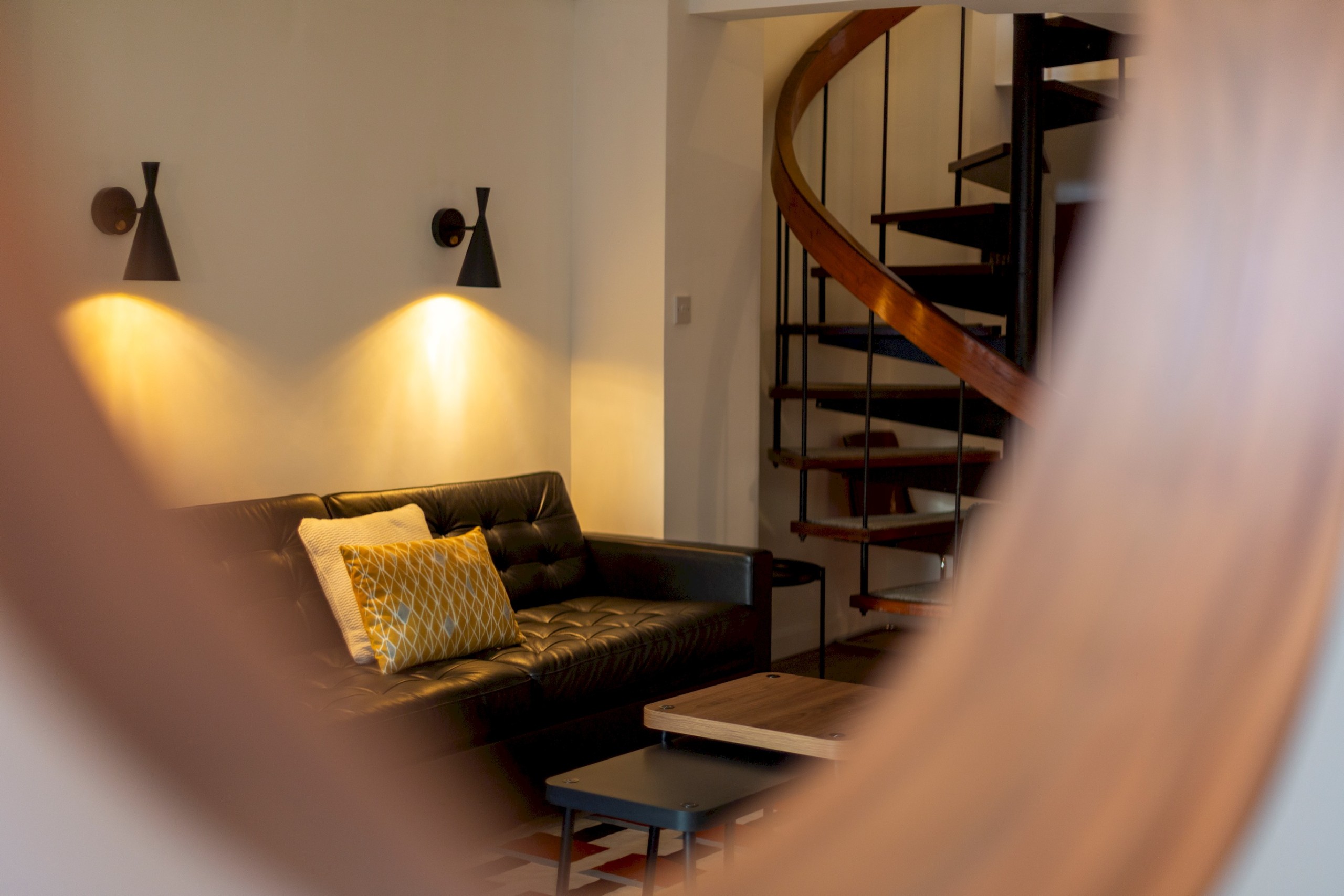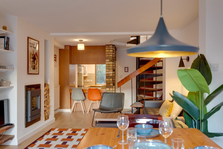 – Open plan living with spiral stairs up to 2 bedrooms. Sleeps up to 4 people. Short or long stays available.
