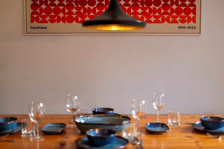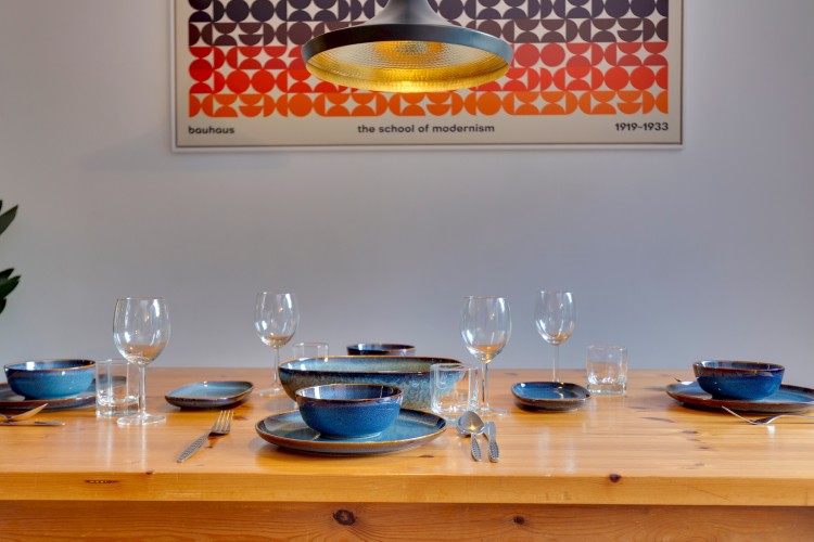 The modern kitchen with small breakfast bar attached is fully equipped for home dining. Use of appliances include an oven, gas hob, fridge-freezer and dishwasher. Smaller appliances include a microwave, toaster, kettle, with basic condiments provided. There is also a washing machine and dryer available for personal use.