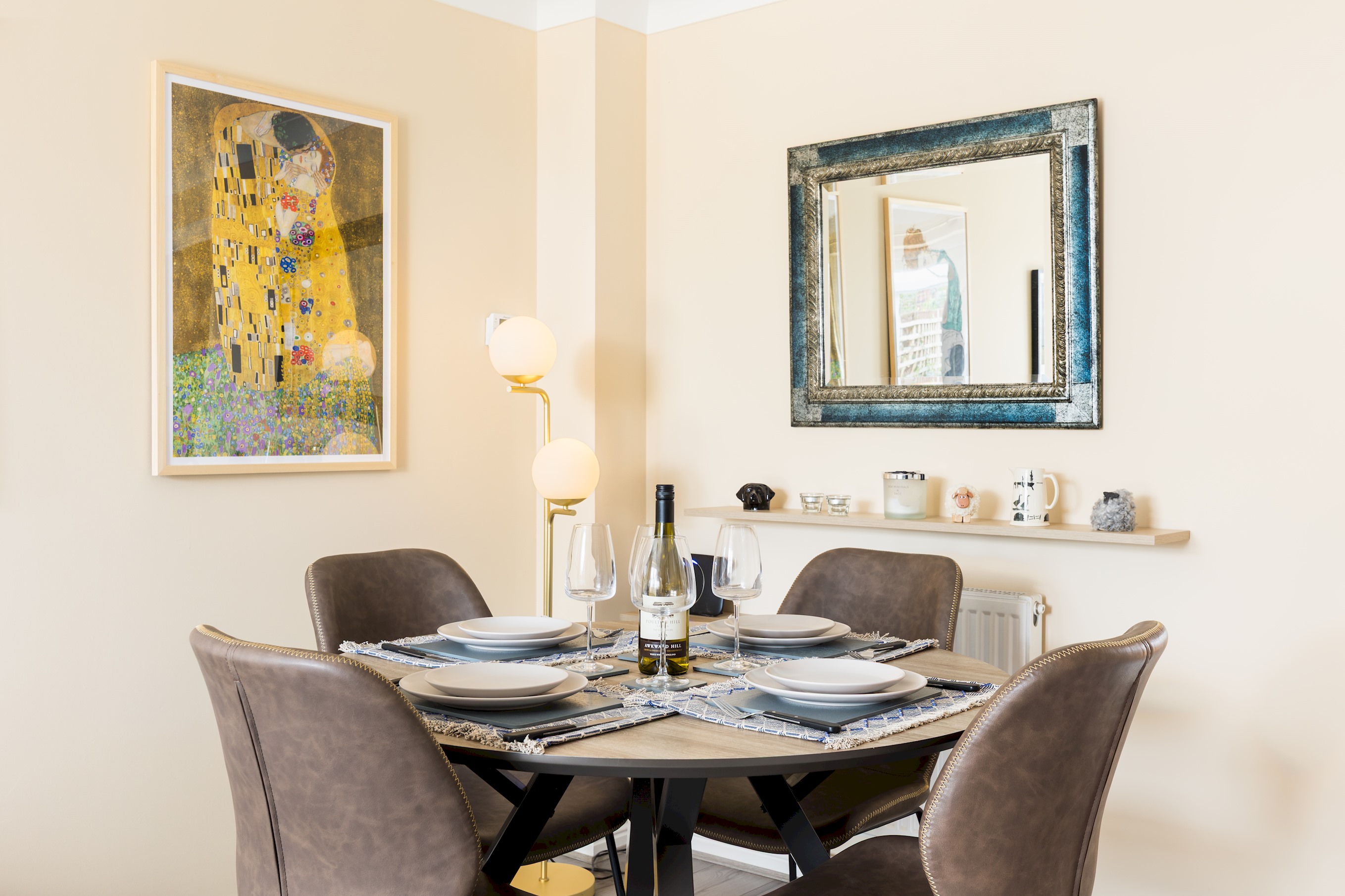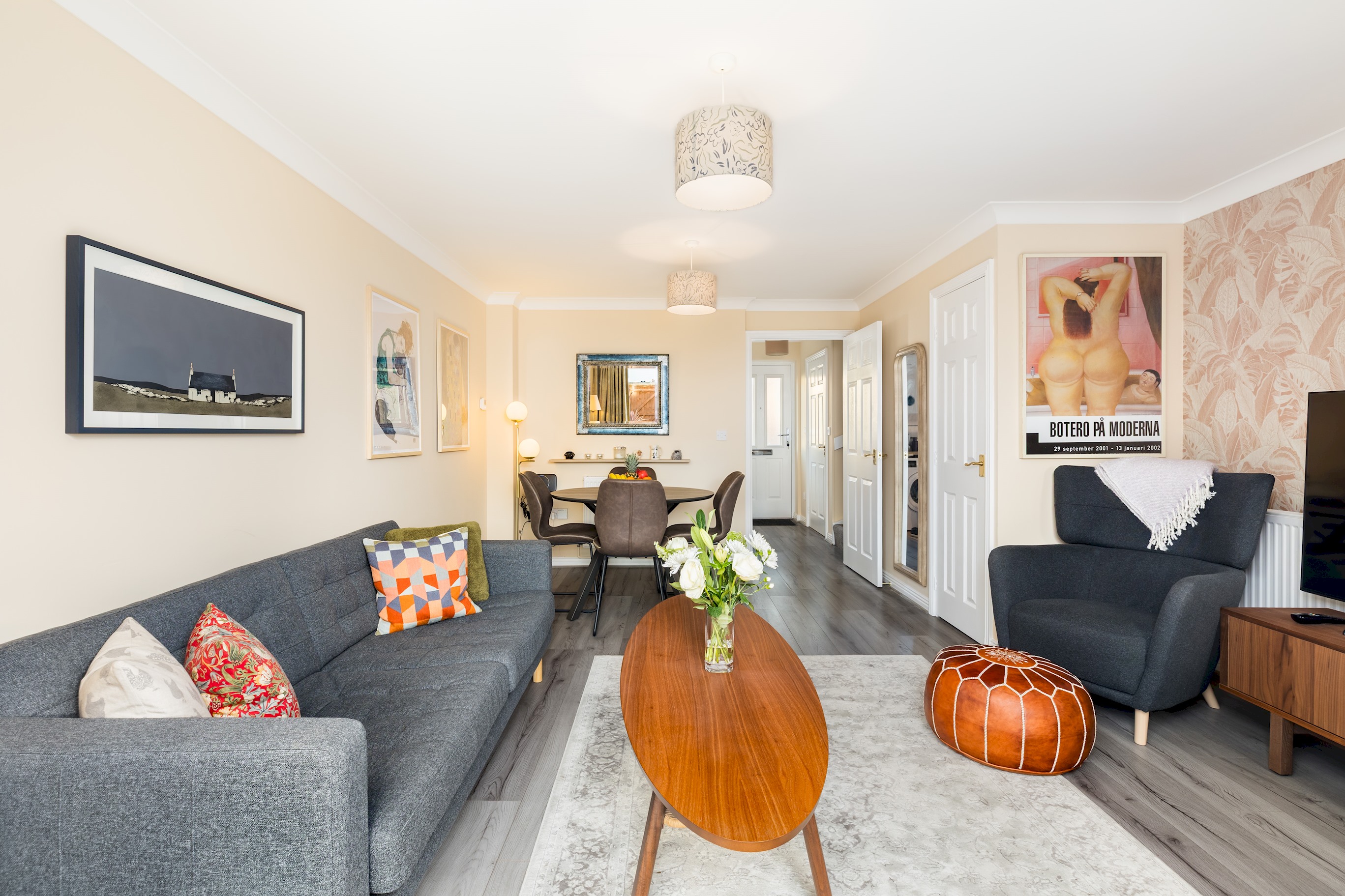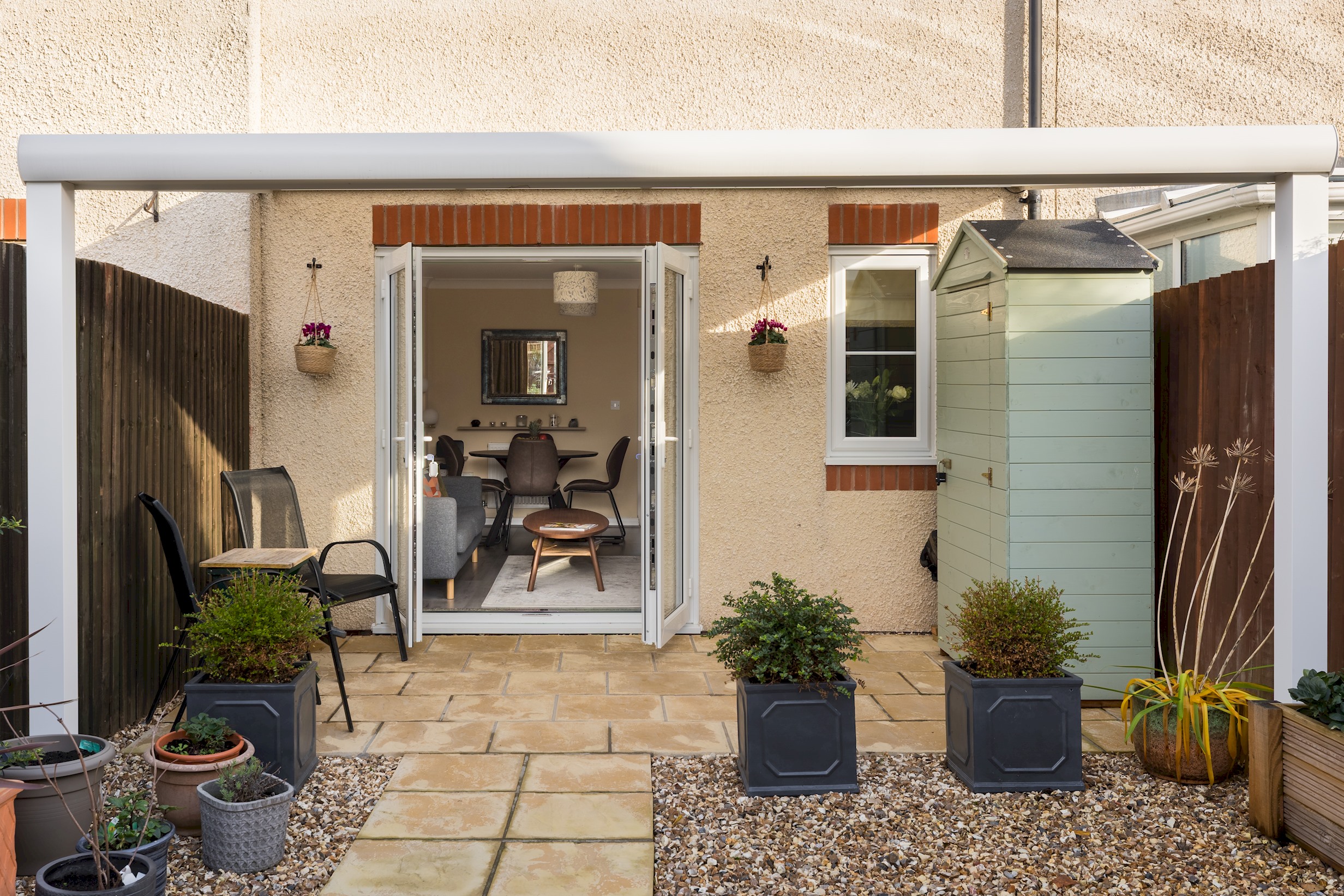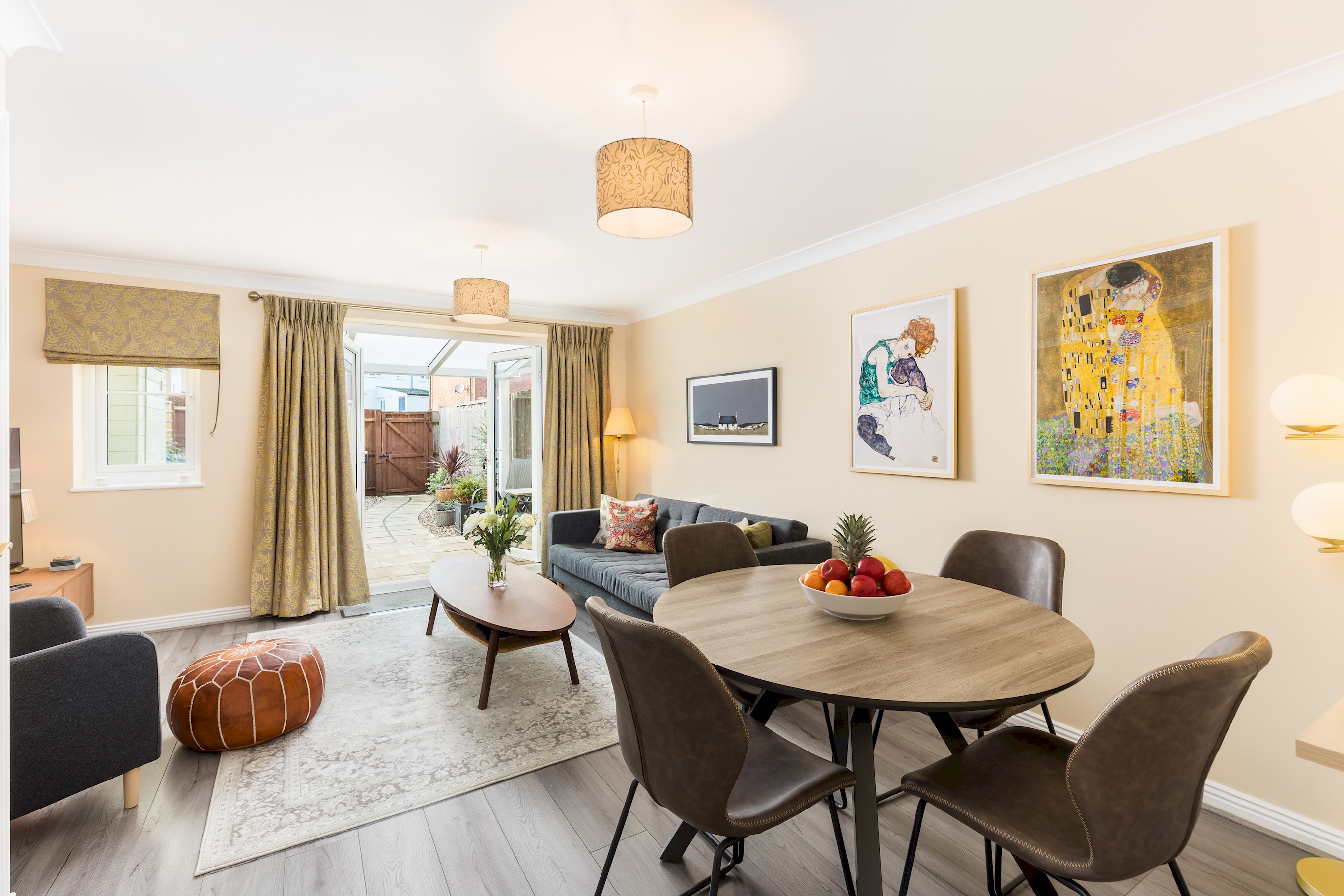 Continuing through our home, is the dining and living area. The dining table comfortably sits four and there is plenty of comfy seating with a smart TV in the lounge area. Leading from the lounge area, there are full length French style patio doors that open up to the private garden, with outside lighting installed. It is a lovely outside space with dining furniture, making it a perfect for an evening drink or family meal!