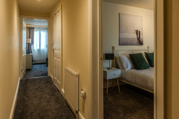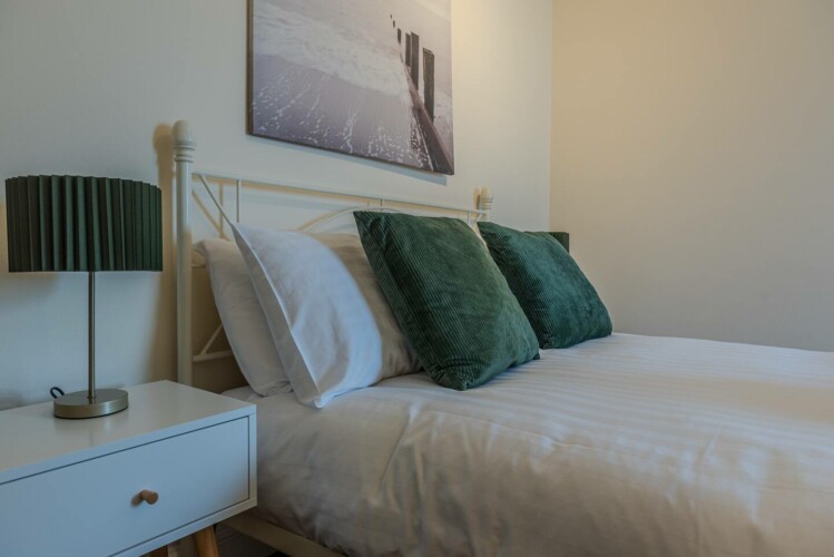 From the hallway there is a light and spacious Bedroom with a comfortable double bed with hotel quality duvet, pillows and linens for a great night’s sleep and includes a wardrobe, chest of drawers, bedside tables and reading lamps as well as a smart TV on the wall where you can log into your apps and settle in to watch your favourite movie.