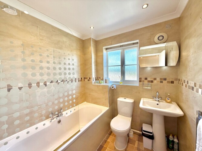 -A clean, tiled bathroom with both bath and shower – fluffy towels and toiletries provided