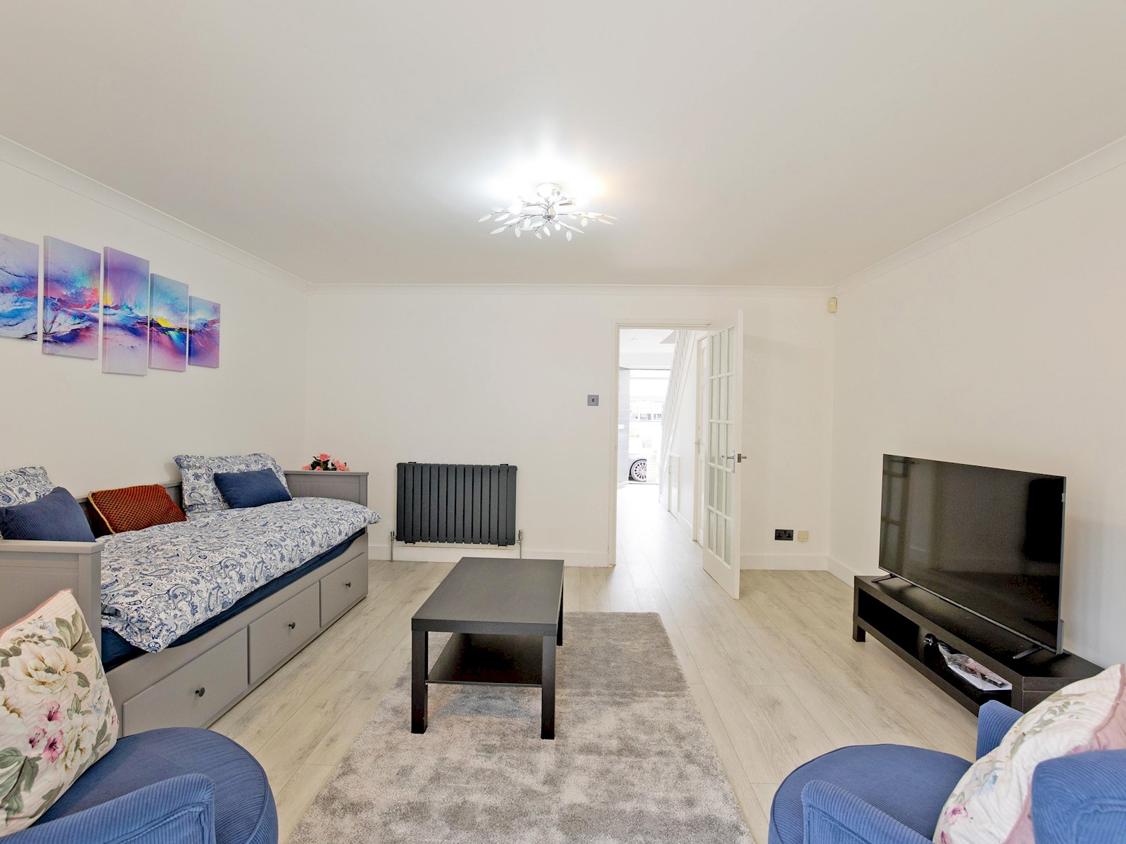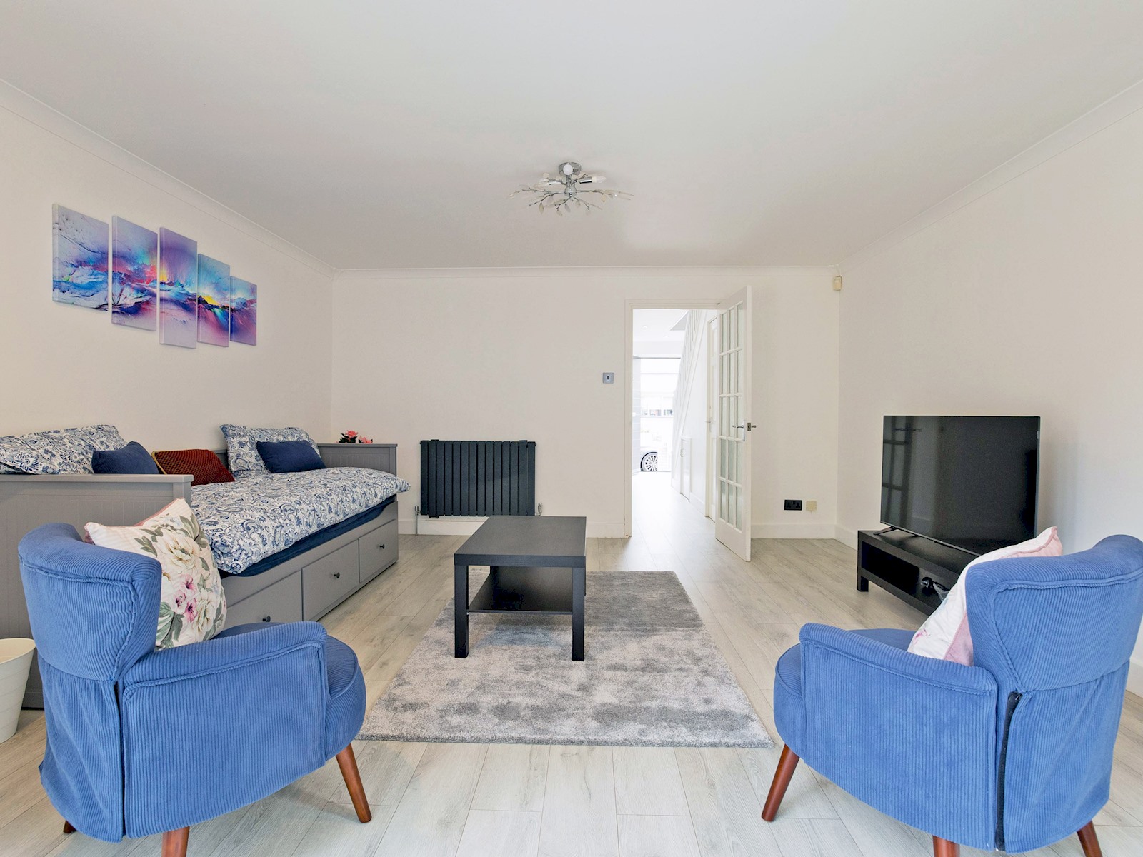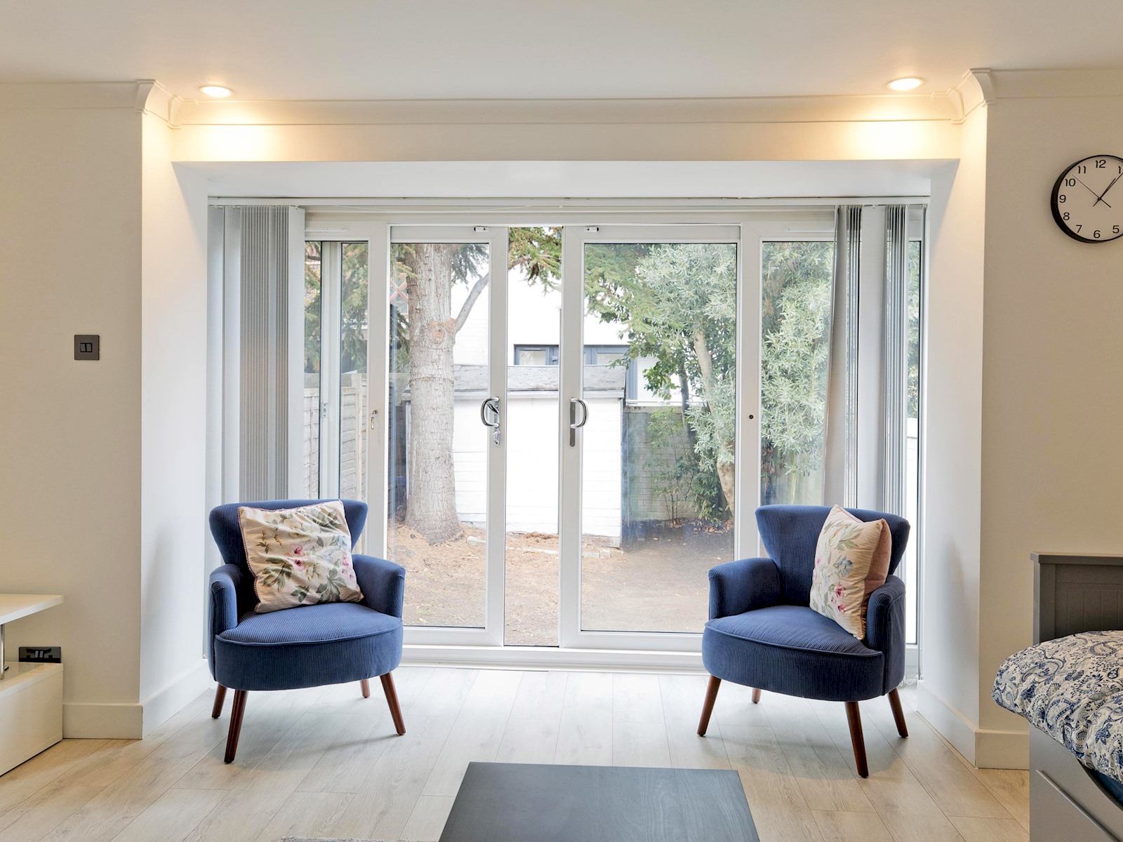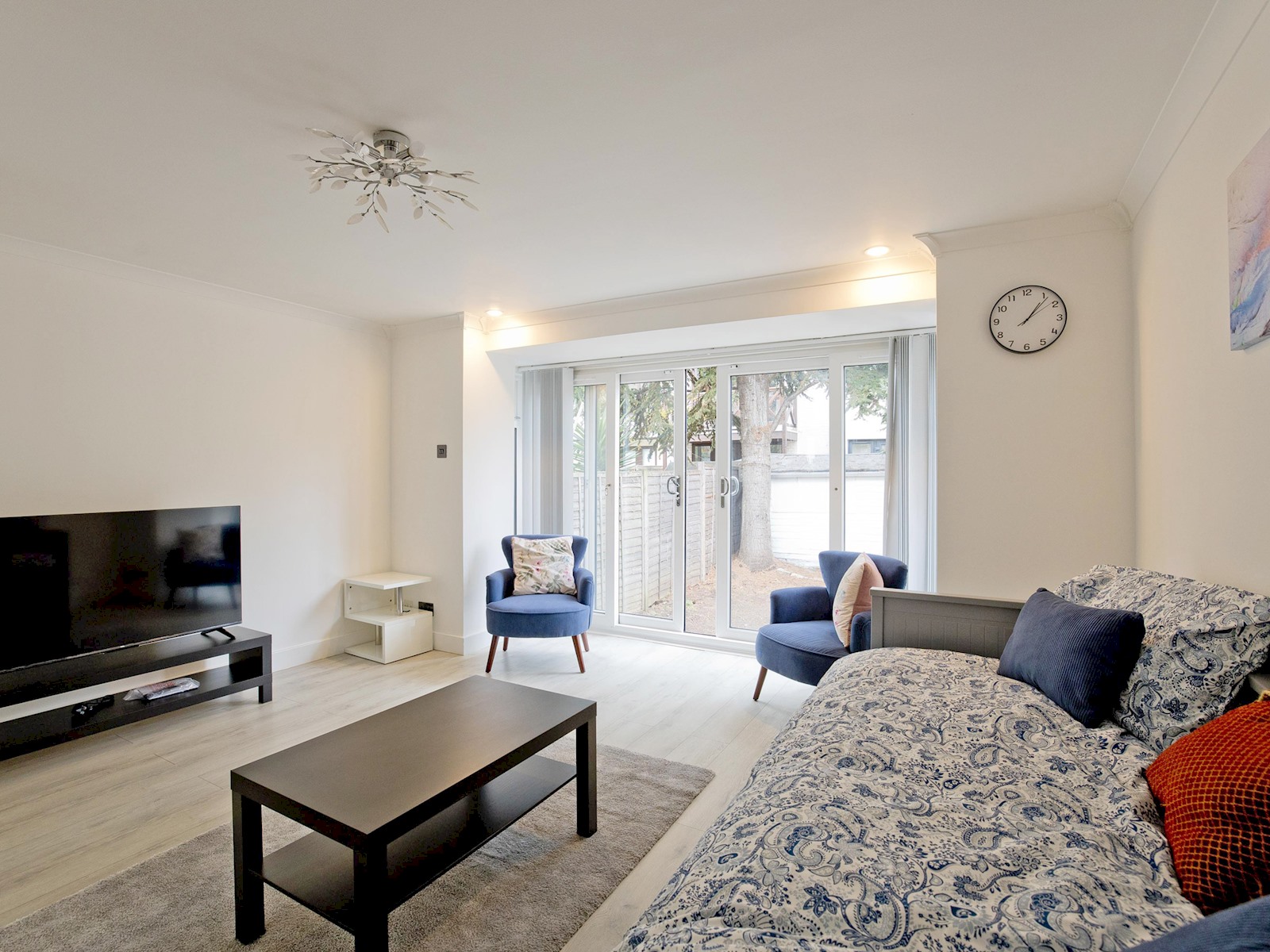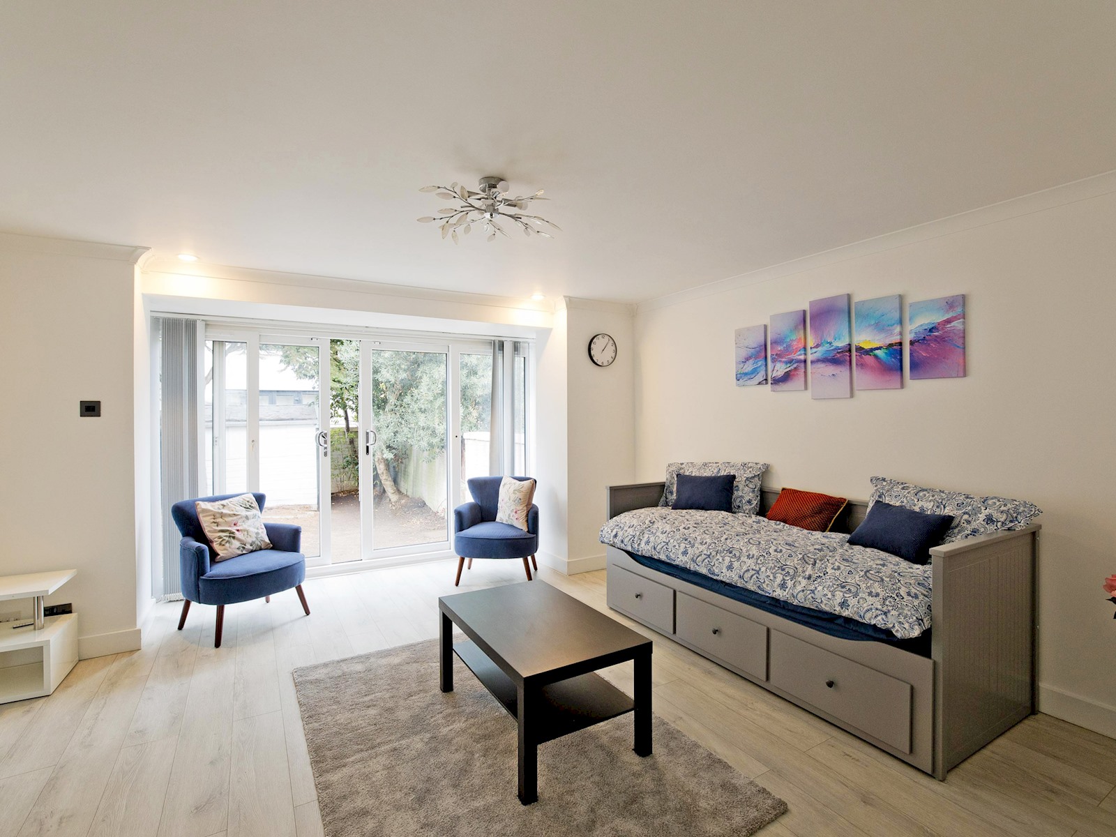 The ground floor features a bright and contemporary living room furnished with a comfortable sofa bed, Smart TV, and tasteful décor. Large sliding glass doors open out onto a private enclosed garden, perfect for morning coffee or evening relaxation.