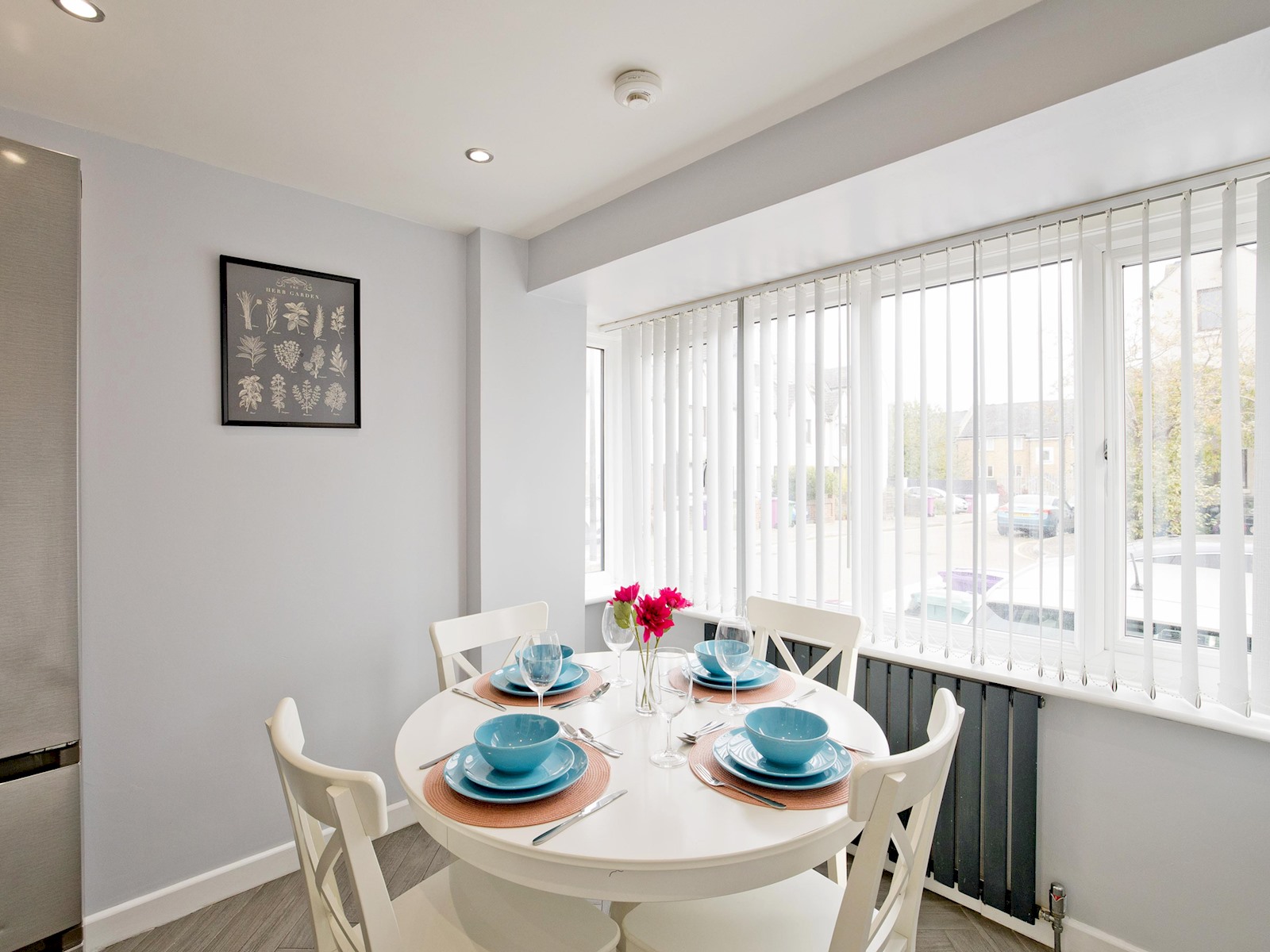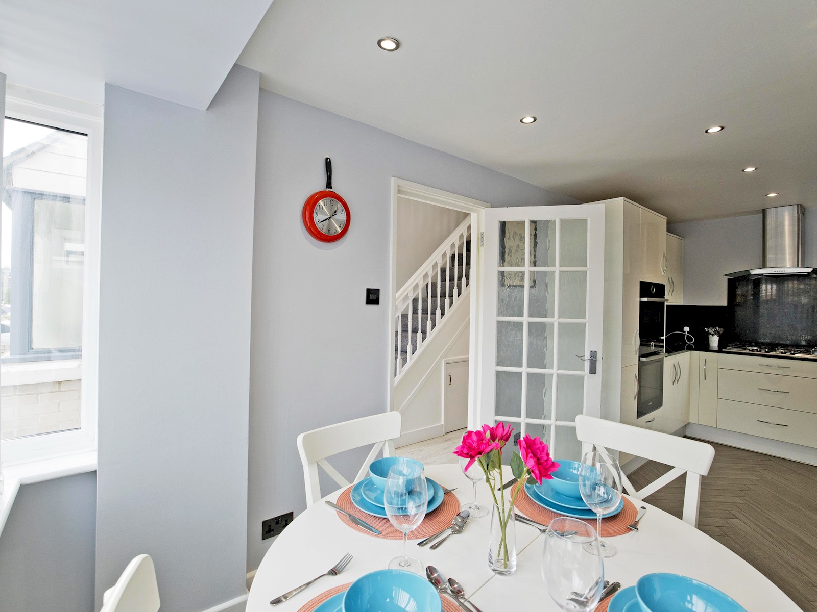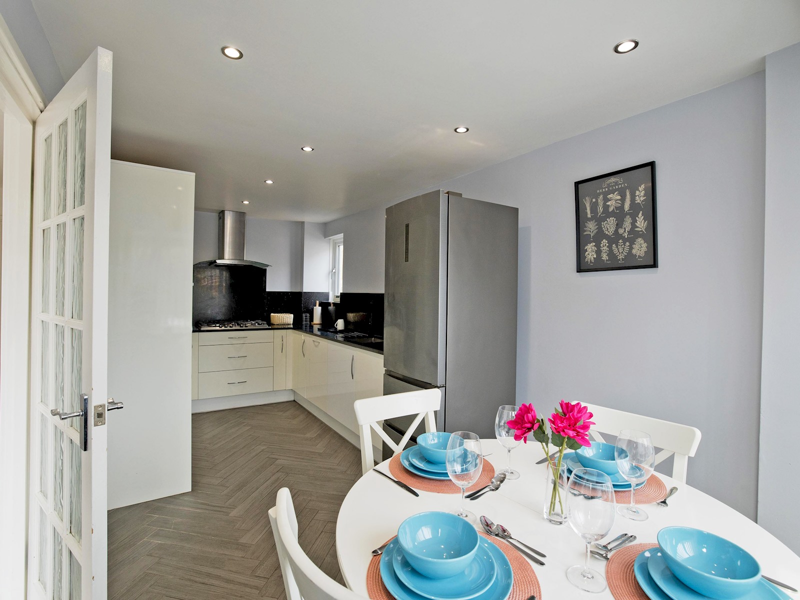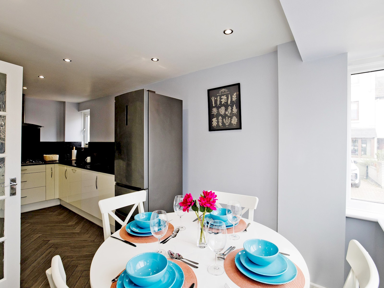 The kitchen and dining area is fully equipped with modern appliances, including an oven, hob, microwave, fridge-freezer, dishwasher, and kettle. A round dining table comfortably seats four, making it ideal for family meals or working from home.